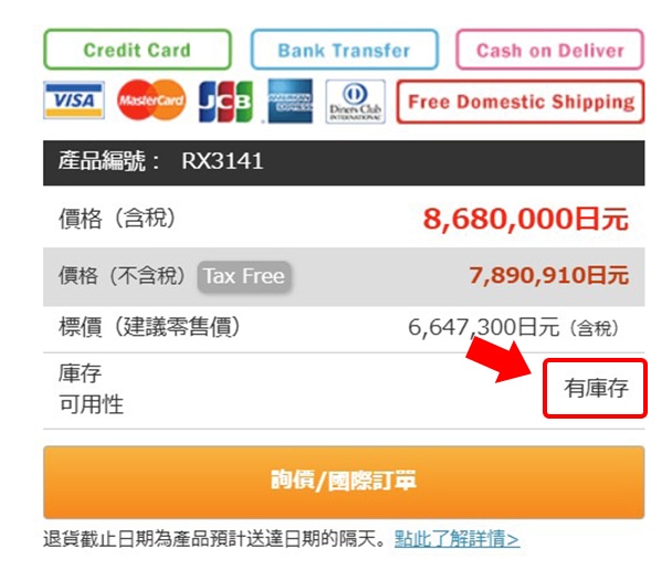 關於本店舖的庫存狀態,在本店舖網頁上將會標示「有庫存 (In Stock) 」或「無庫存 (Out of Stock)」。