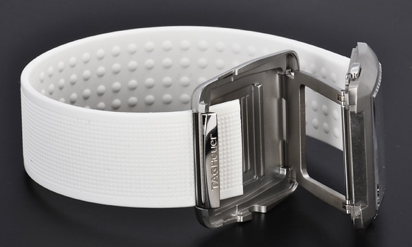 タグ・ホイヤーとタイガーウッズとのコラボレーションモデル。ダイヤルにはゴルフボールをイメージしたディンプルが刻まれており、ラバーストラップもホワイトで統一されています。