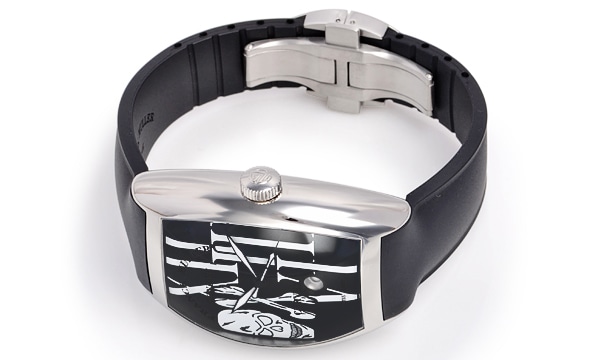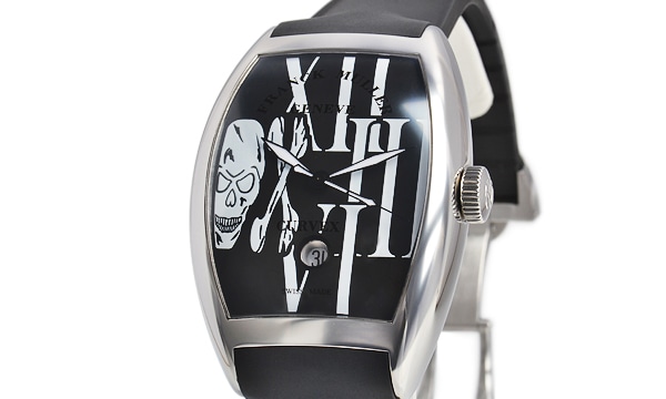 ダイヤルにドクロがデザインされた「トノウカーベックス ゴシック・アロンジェ」。フランク・ミューラーは、“ドクロ”を生と死、そして人生を象徴するアイコンとして用い、不吉なものとしてではなく、いつかはドクロになるのだから人生を楽しもうという死生観を表したものとして、このモデルを製作しました。