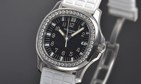 パテックのレディースモデルでは珍しく、スポーティーな雰囲気の「アクアノート ルーチェ」。ベゼルには豪華にも46個のダイヤ(約1.00ct)がセットされており、スポーティーとエレガントが融合しています。