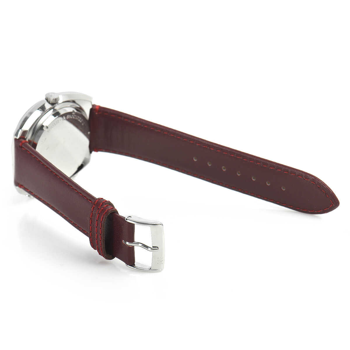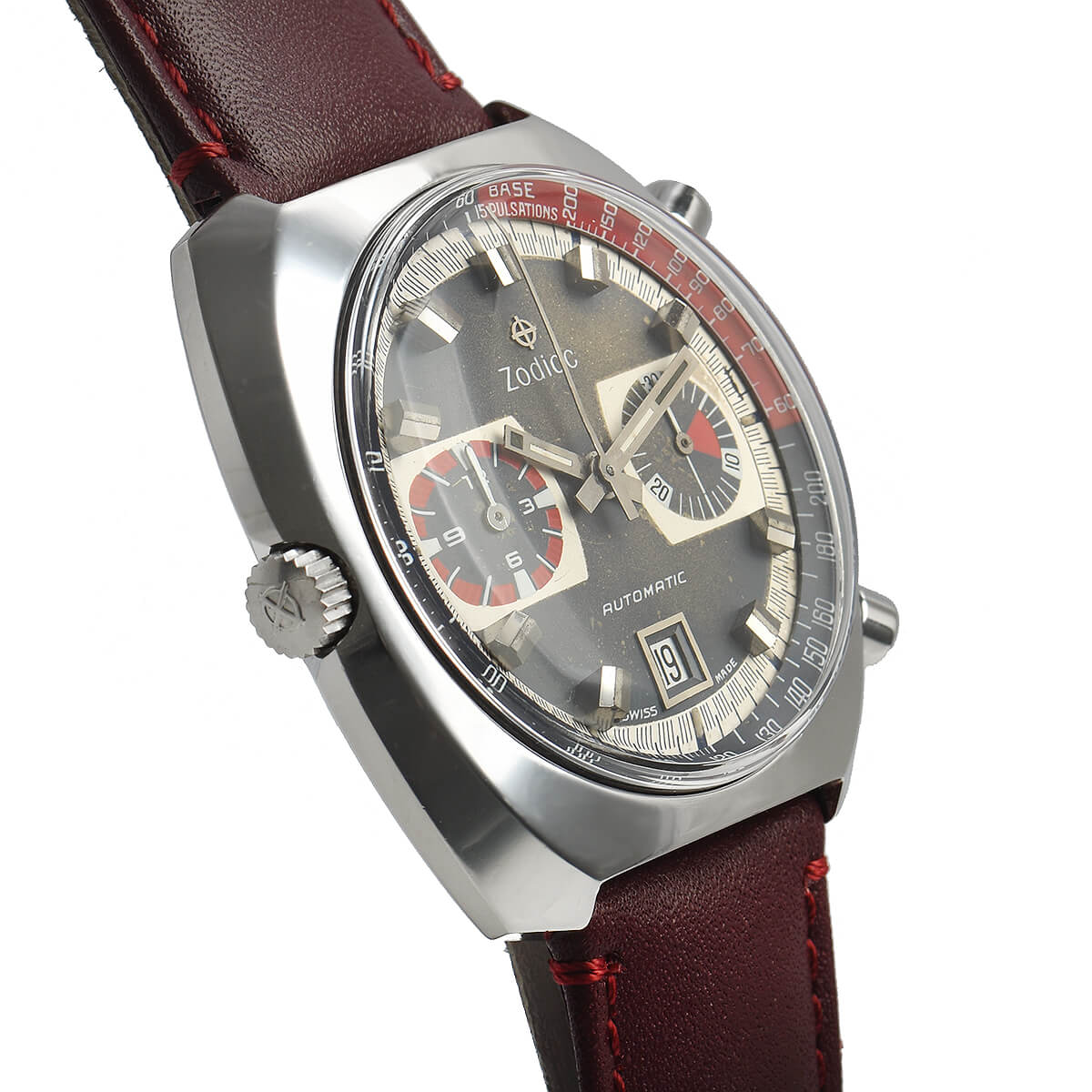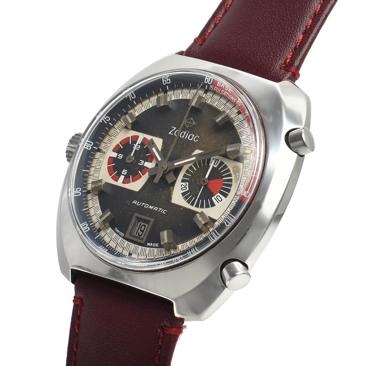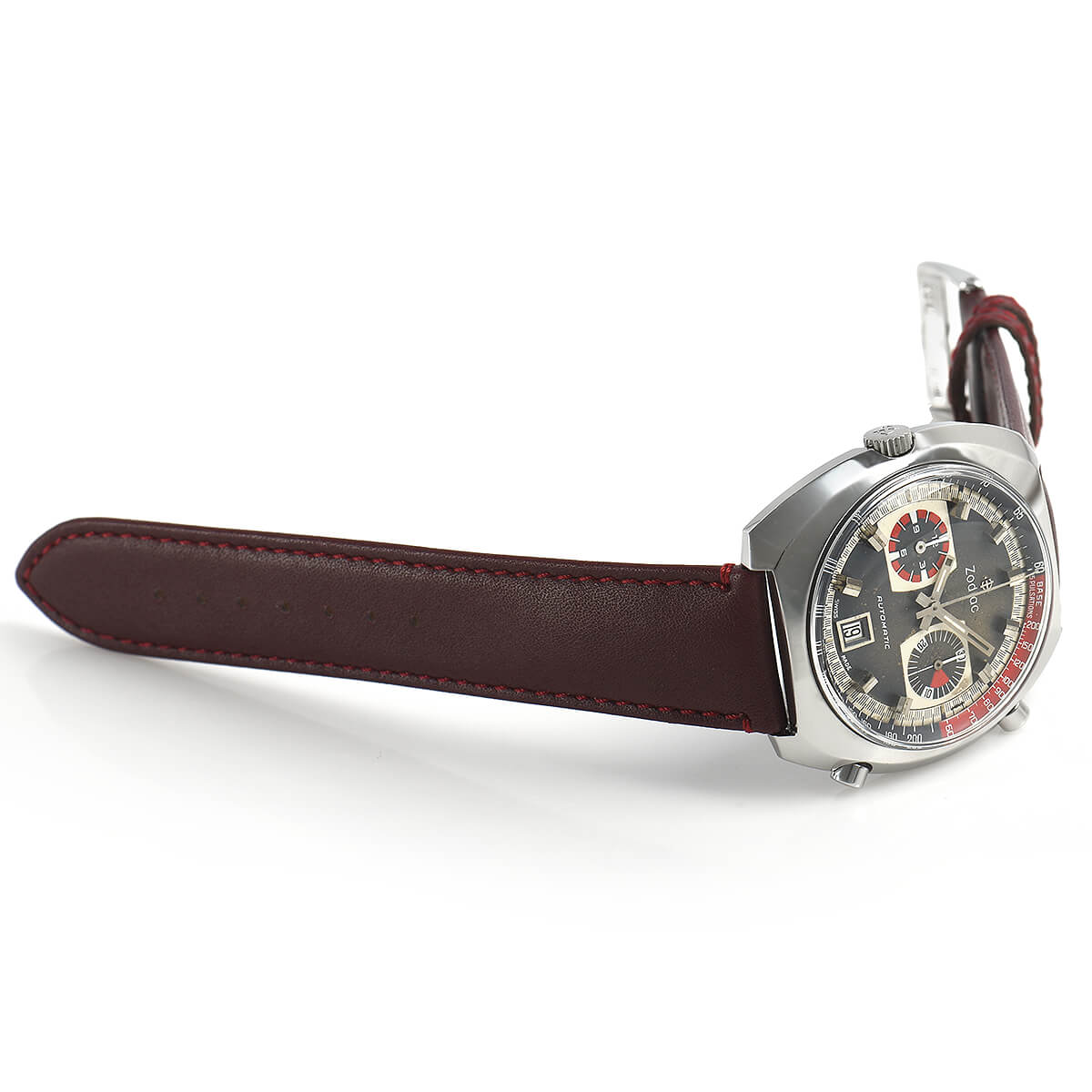 ブライトリング、ハミルトン−ビューレン、ホイヤー−レオニダス、デュボイデプラッツが連合で開発した、世界初の自動巻きクロノグラフムーブメントCal.11から発展したCal.12を搭載したヴィンテージモデルです。1970年ごろに作られており、そのころのデザインや特徴の左リューズ、色調が良い雰囲気を出しています。