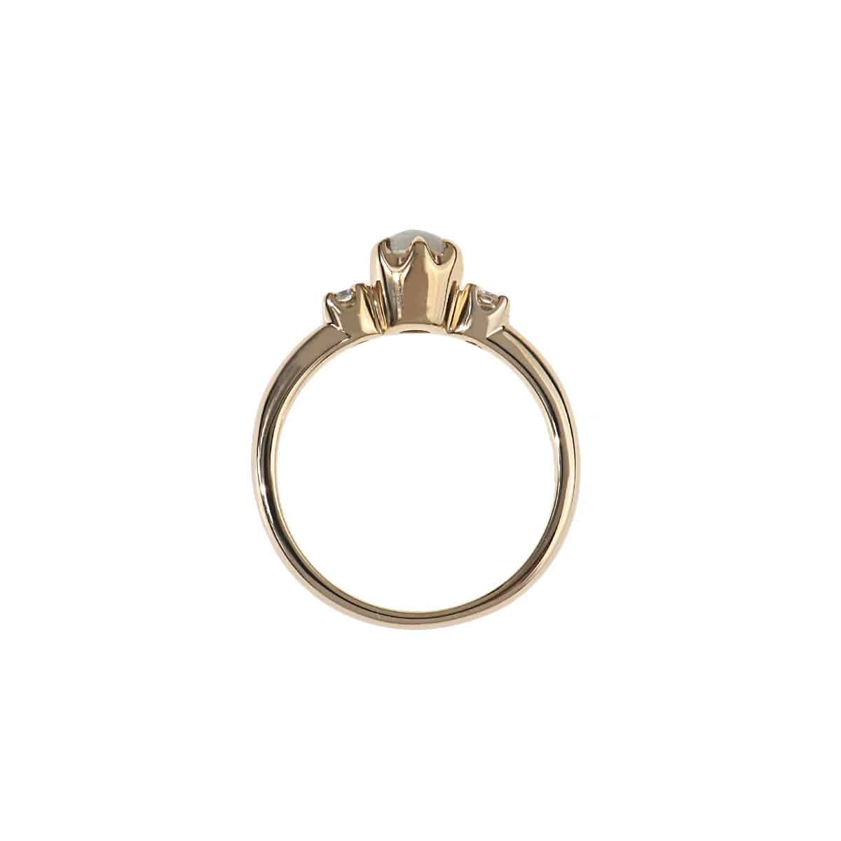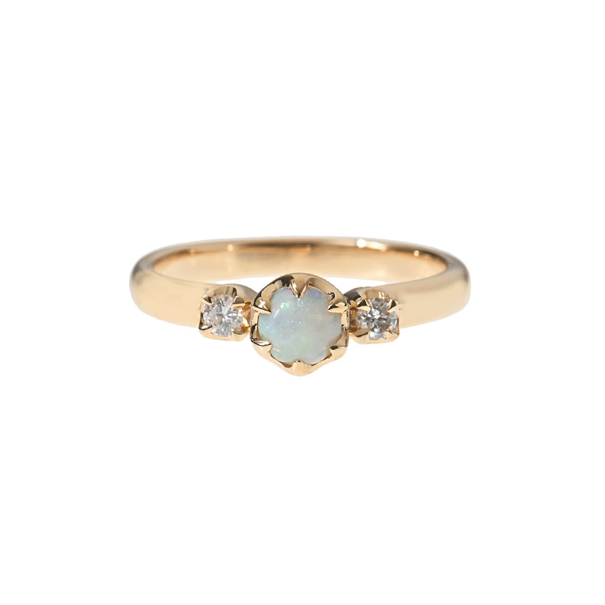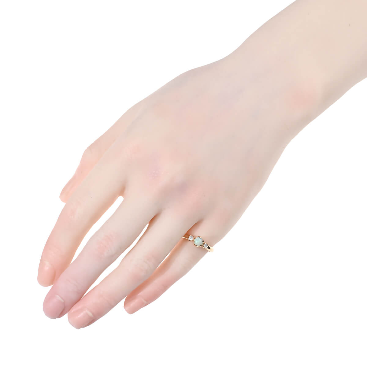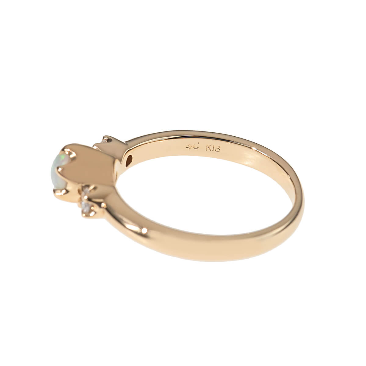 時には繊細な光を放つ雪の結晶のように、また時には大きなうねりとなって大海原へ、そして岩や大地をも削りとる強い結束力さえもある、平凡どころかすこぶる非凡で、自由奔放にその姿を変えていく“水”。そんな“水のようでありたい”という願いを原点に、氷が張った水面の底の温度、唯一魚が生息できるいわば“安息の場”である、きびしい環境にあっての潤いそのものを意味する「4℃」をブランド名に冠し、1972年の創業以来、既存の価値に捉われることなく常に新しさと潤いをもたらすジュエリーをつくり続けているドメスティックジュエリーブランド『4℃(ヨンドシー)』。見る角度により色合いが変化する、遊色効果が特徴の美しい宝石「オパール」をセンターにあしらった、イエローゴールド製リング。両サイドに添えられたダイヤモンドが、リングに上質で繊細なきらめきをプラスいています。すい込まれそうな不思議な魅力と、ひとつひとつ異なる美しい個性をもったオパールが、指先をエレガントに飾ります。