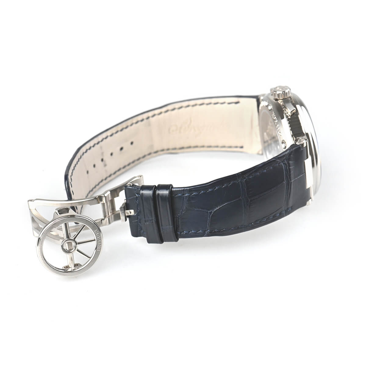 文字盤にはサンバースト・ブルーダイアルを合わせ、秒針の最後部には国際海洋信号旗の「B」のモチーフがあしらわれます。