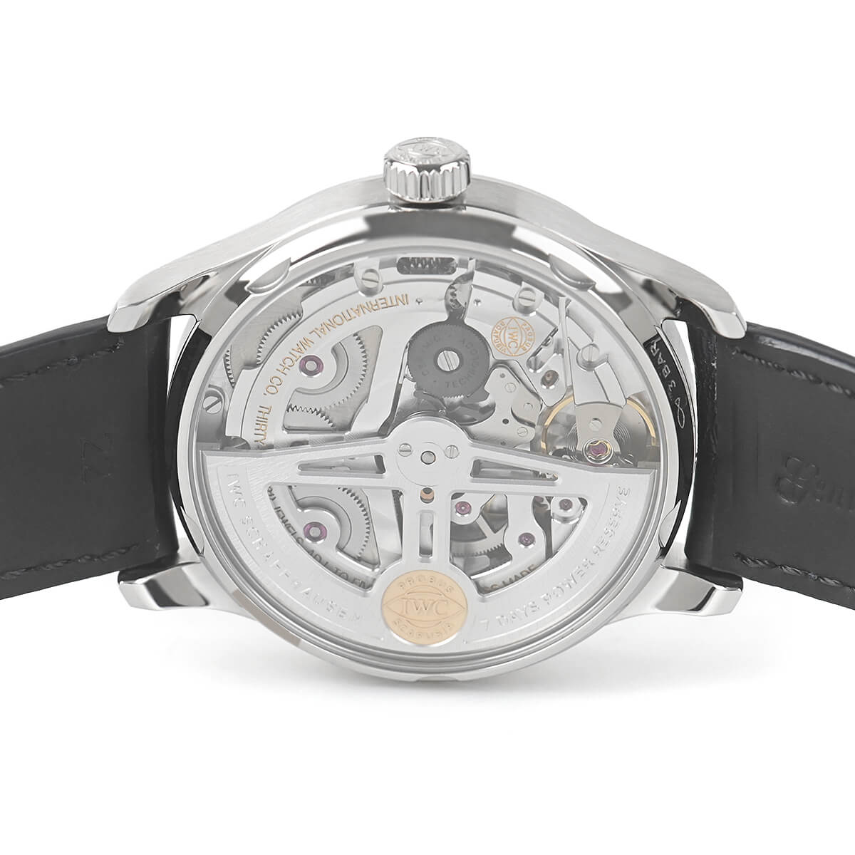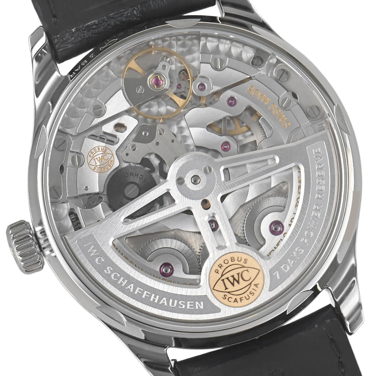この時計を語るうえで欠かせないのはその大きさやデザインだけでなく、搭載されているムーブメントでしょう。新たに開発されたキャリバー52000シリーズでは、IWC特有のペラトン自動巻き機構に改良が加えられ巻き上げ爪、ローター軸受にセラミックを採用いたしました。