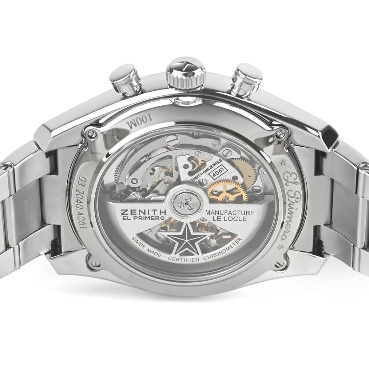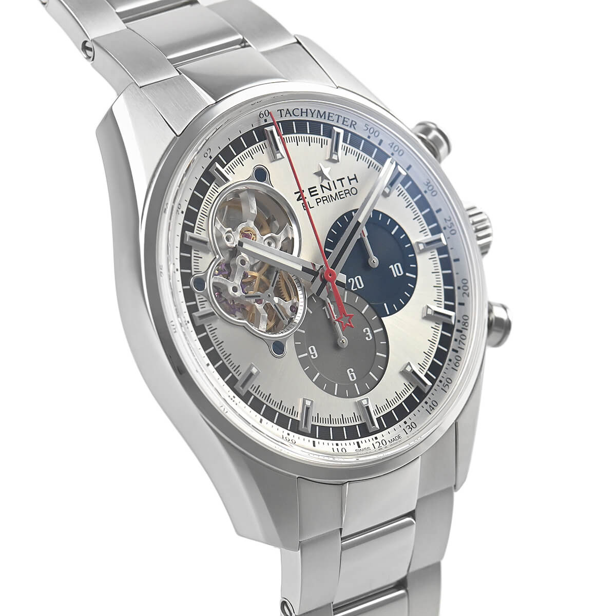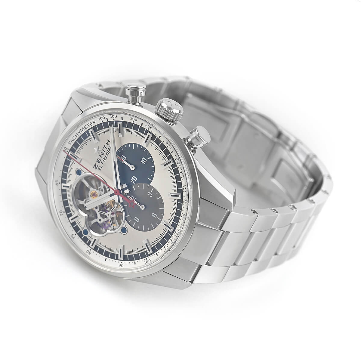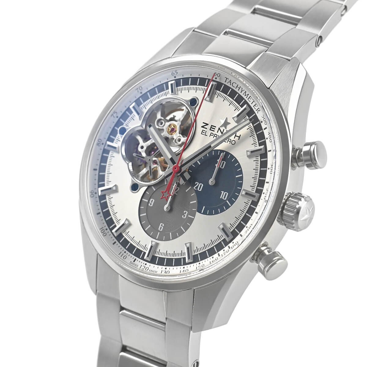 1969年発表の初代エル・プリメロをイメージした色使いに、現代のゼニスのシンボルであるダイヤルをくりぬいた「窓」を融合させた「クロノマスター エルプリメロ オープン」。現在まで続く自動巻きクロノグラフの名機「エル・プリメロ」の歴史を表した一本といえます。