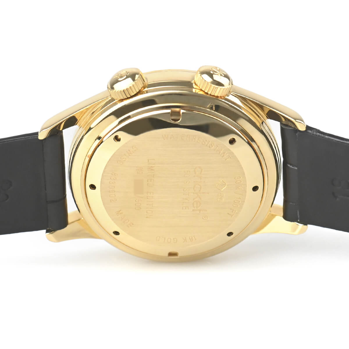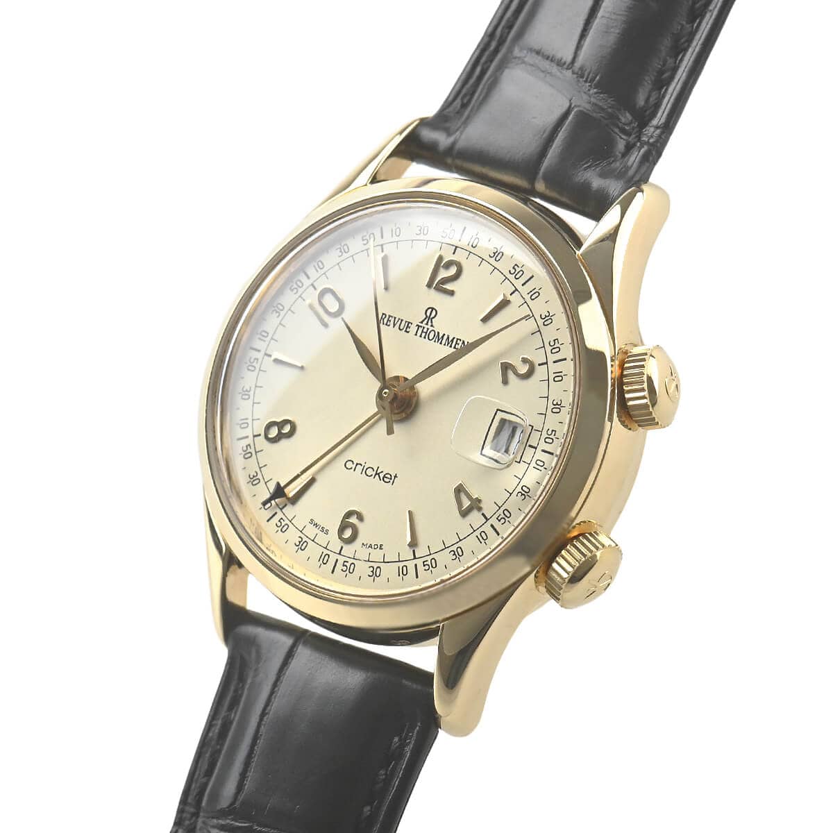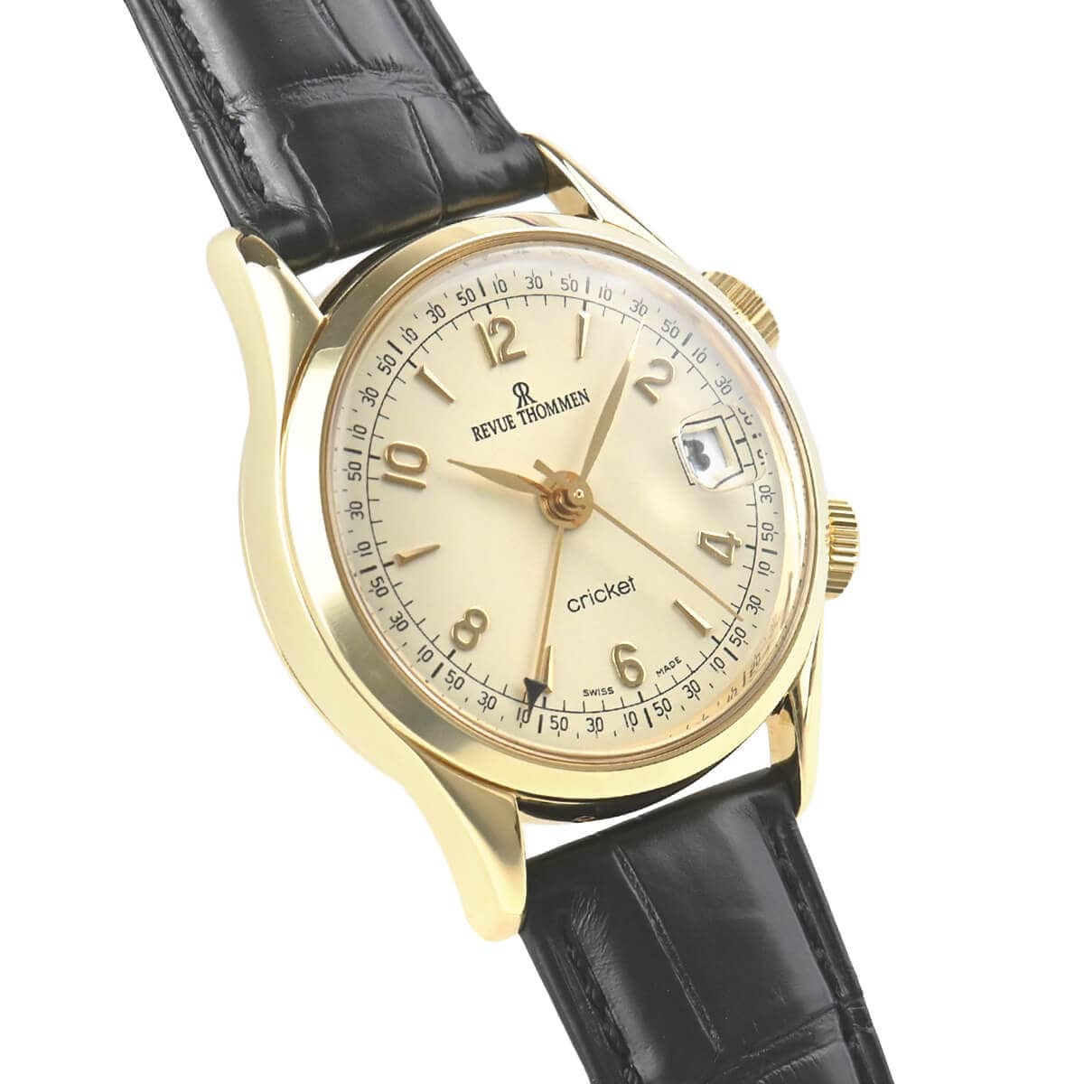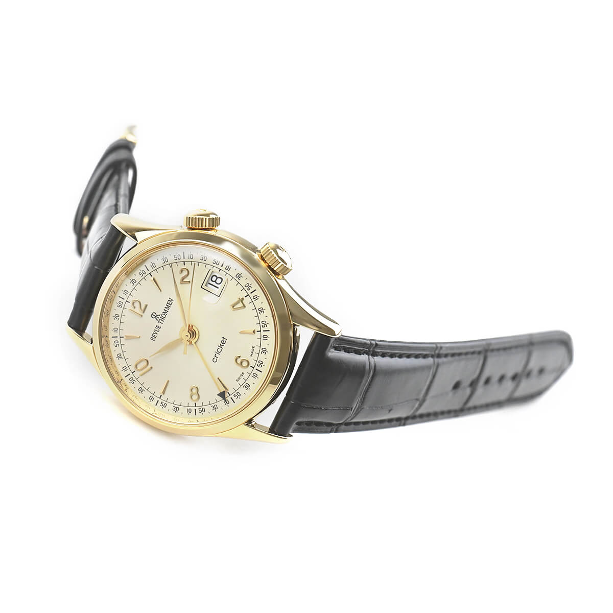 トルーマン、アイゼンハワー、ニクソン、ジョンソンなど歴代の米国大統領が愛用した事で時計ファンにおなじみのアラームウォッチ「クリケット」。こちらは、レビュー・トーメン銘の世界限定500本の限定金無垢モデルです。