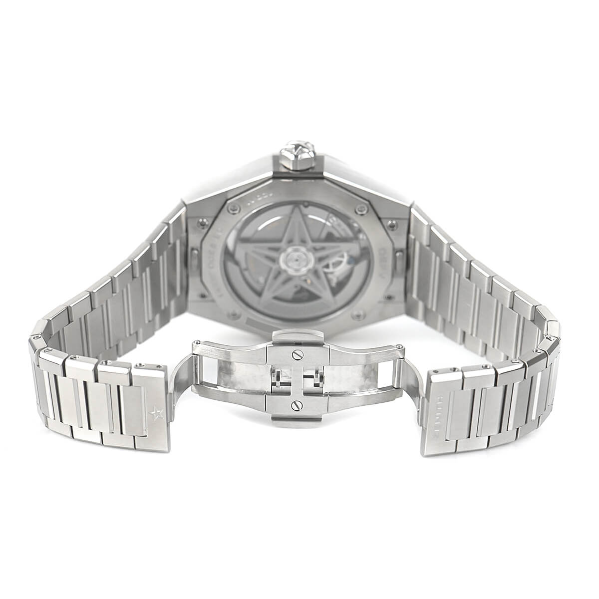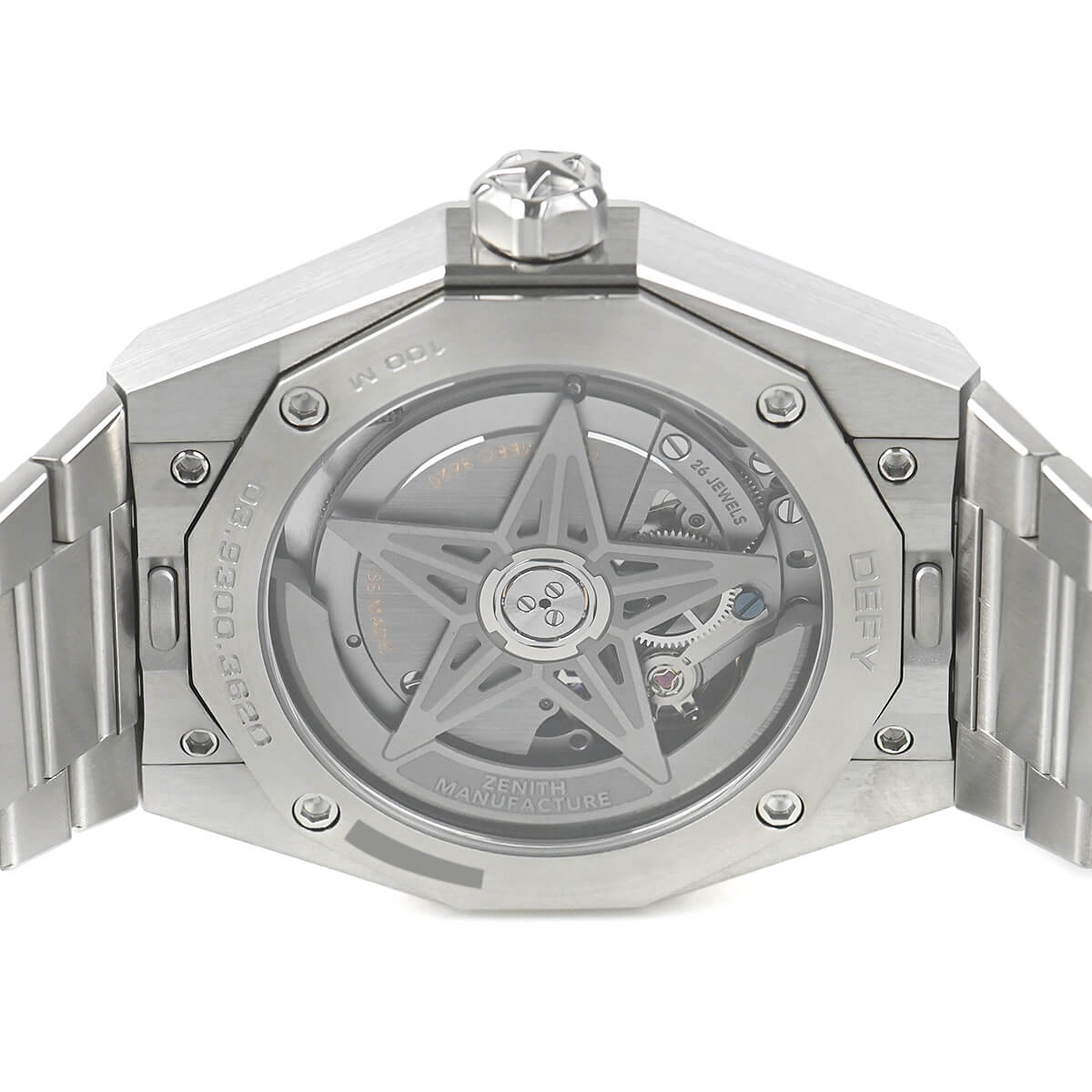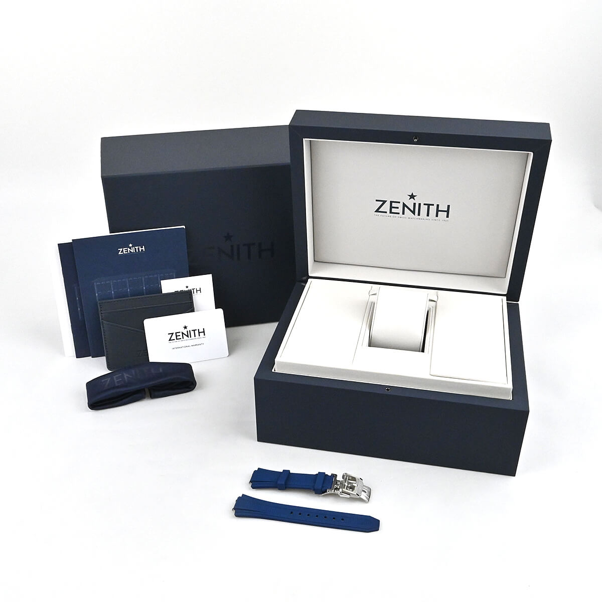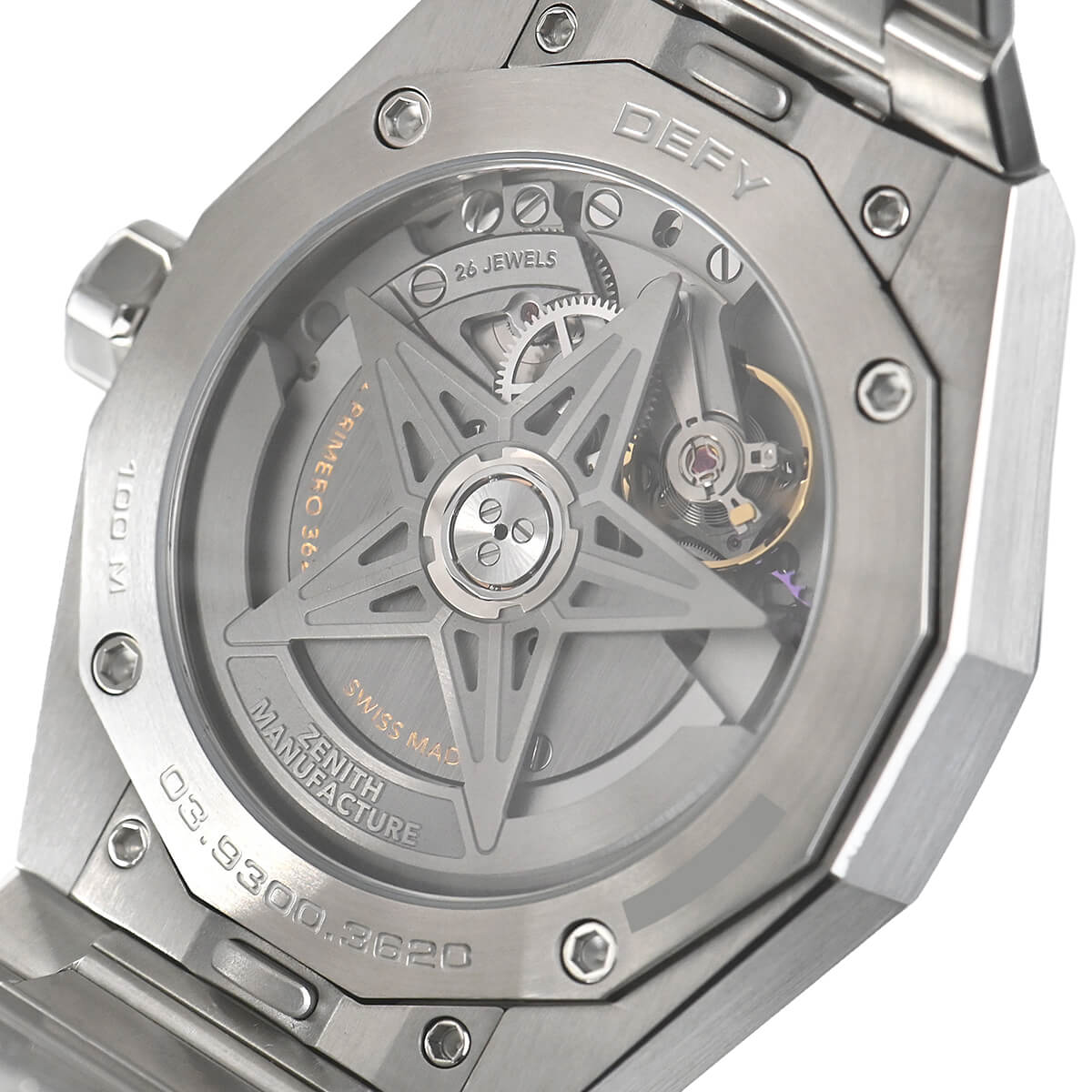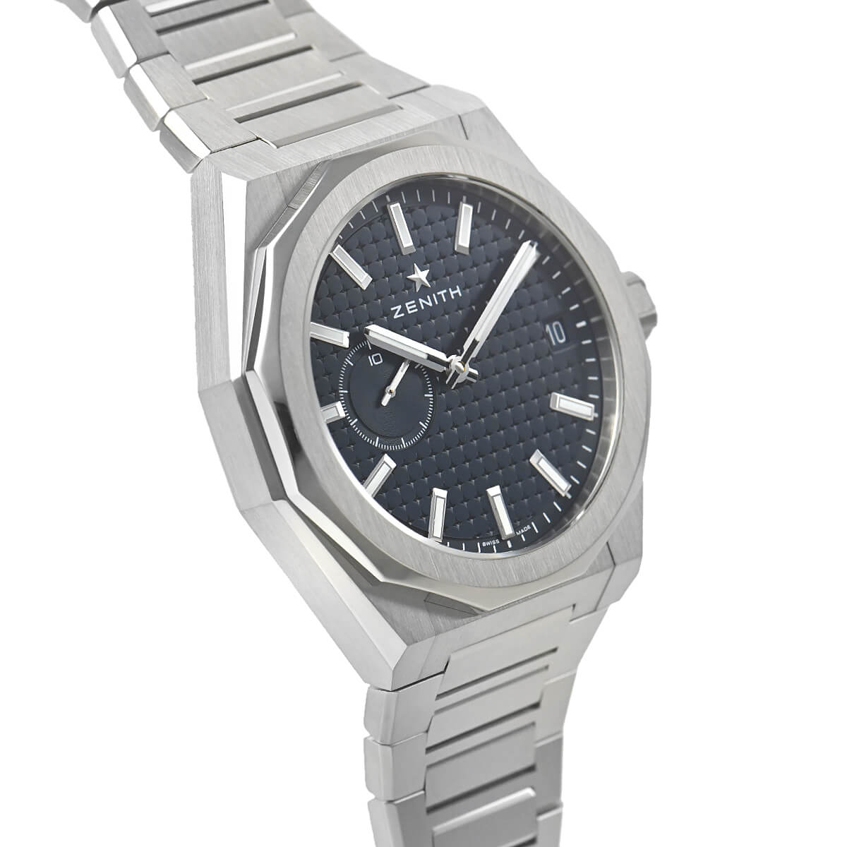 八角形のケースを使用し、ブルートーンのサンバースト仕上げを施した文字盤には、ゼニスの象徴である星をあしらっています。