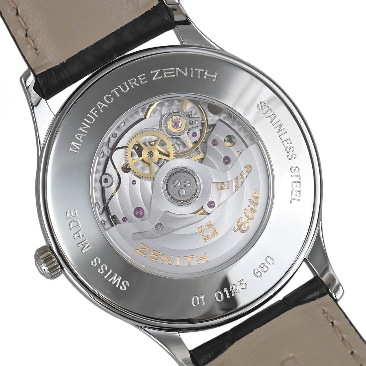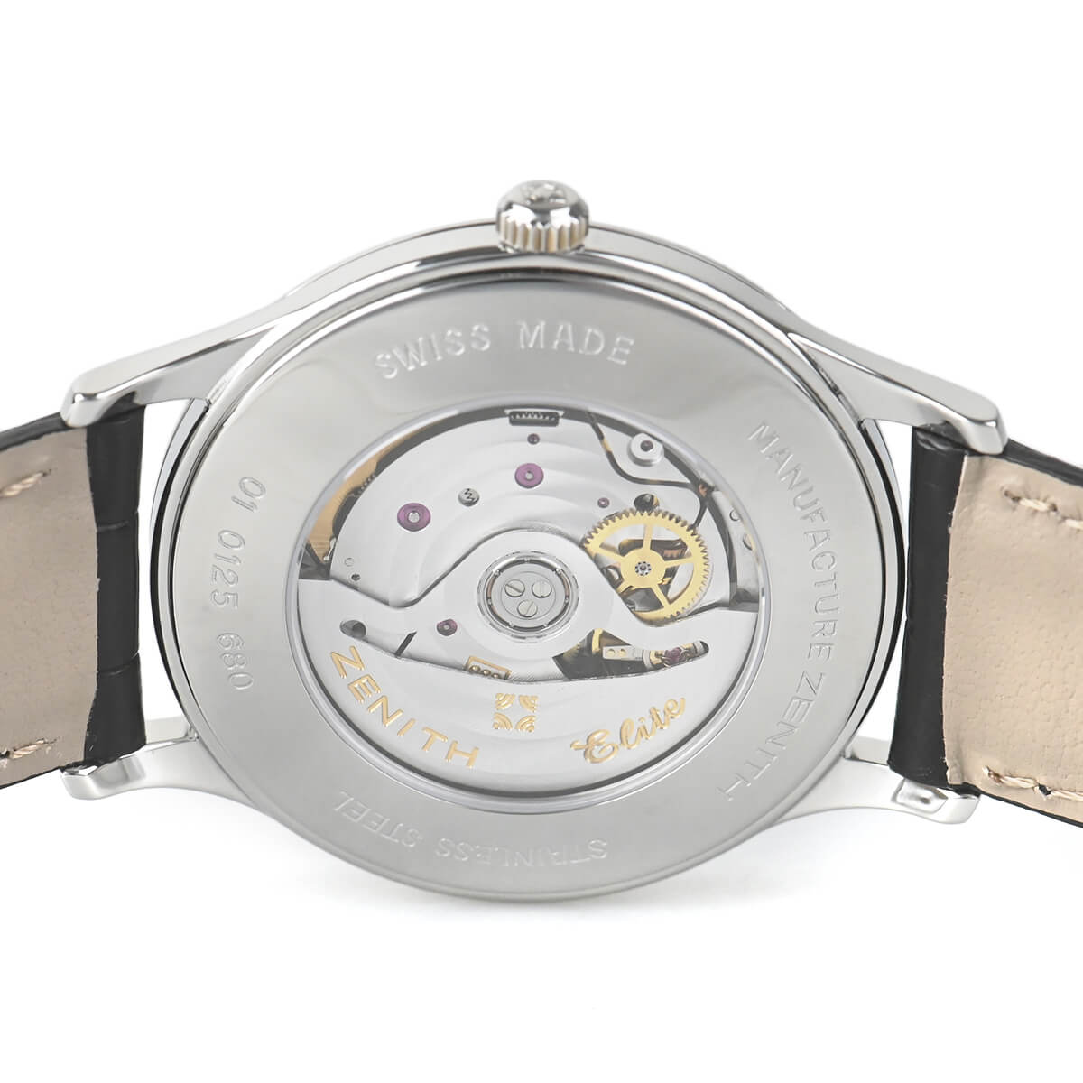 エルプリメロで名高いゼニスですが、シンプルなムーブメント「エリート」も、過去に“ムーブメント オブ ザ イヤー”を受賞した実力派です。その自慢のムーブメントをシースルーバックのケースよりお楽しみください。