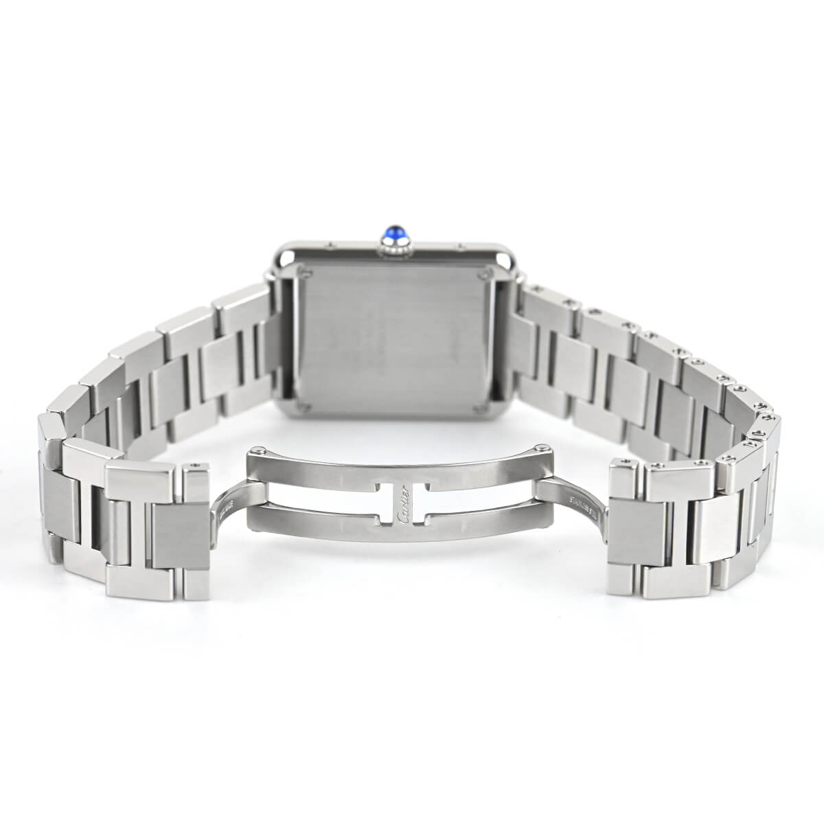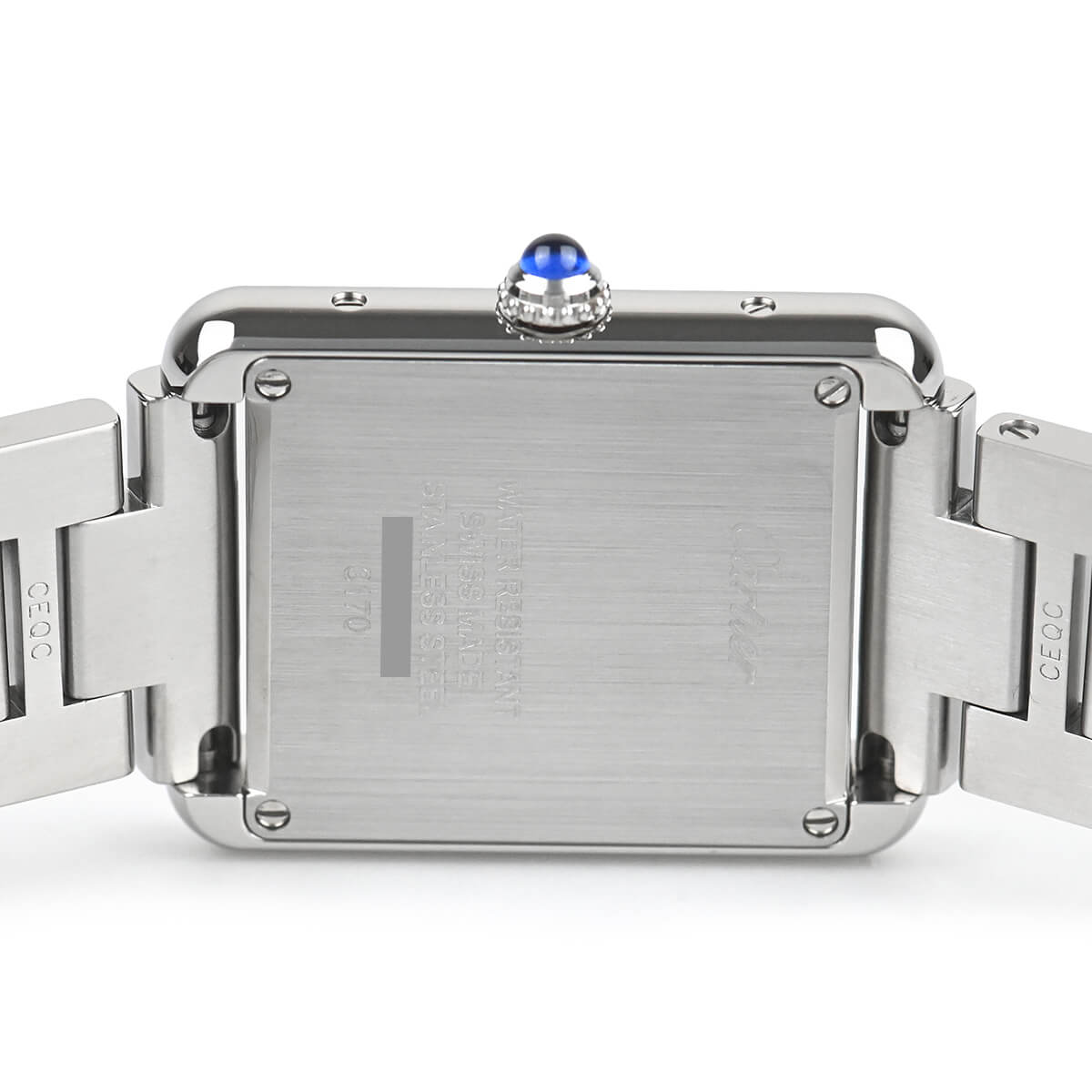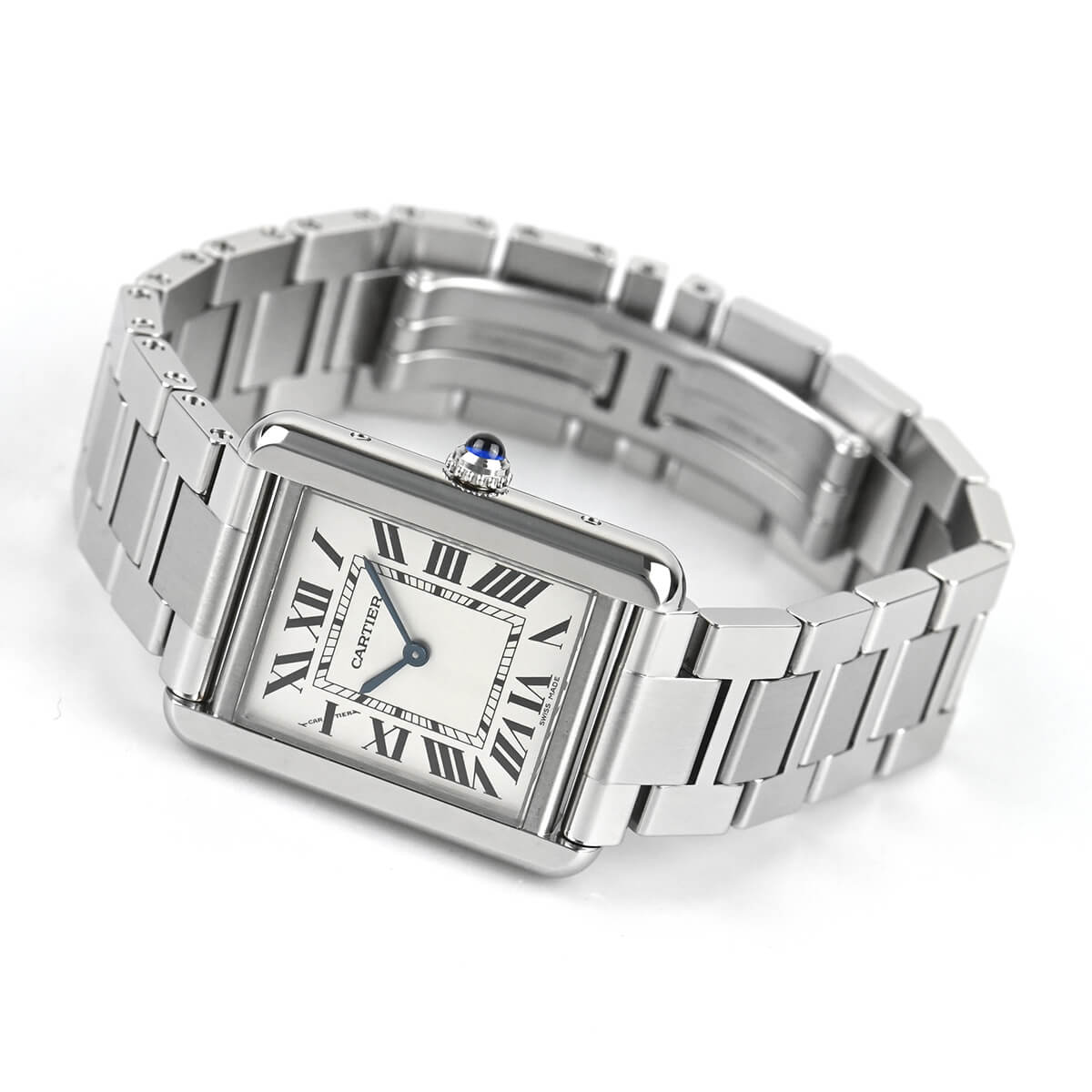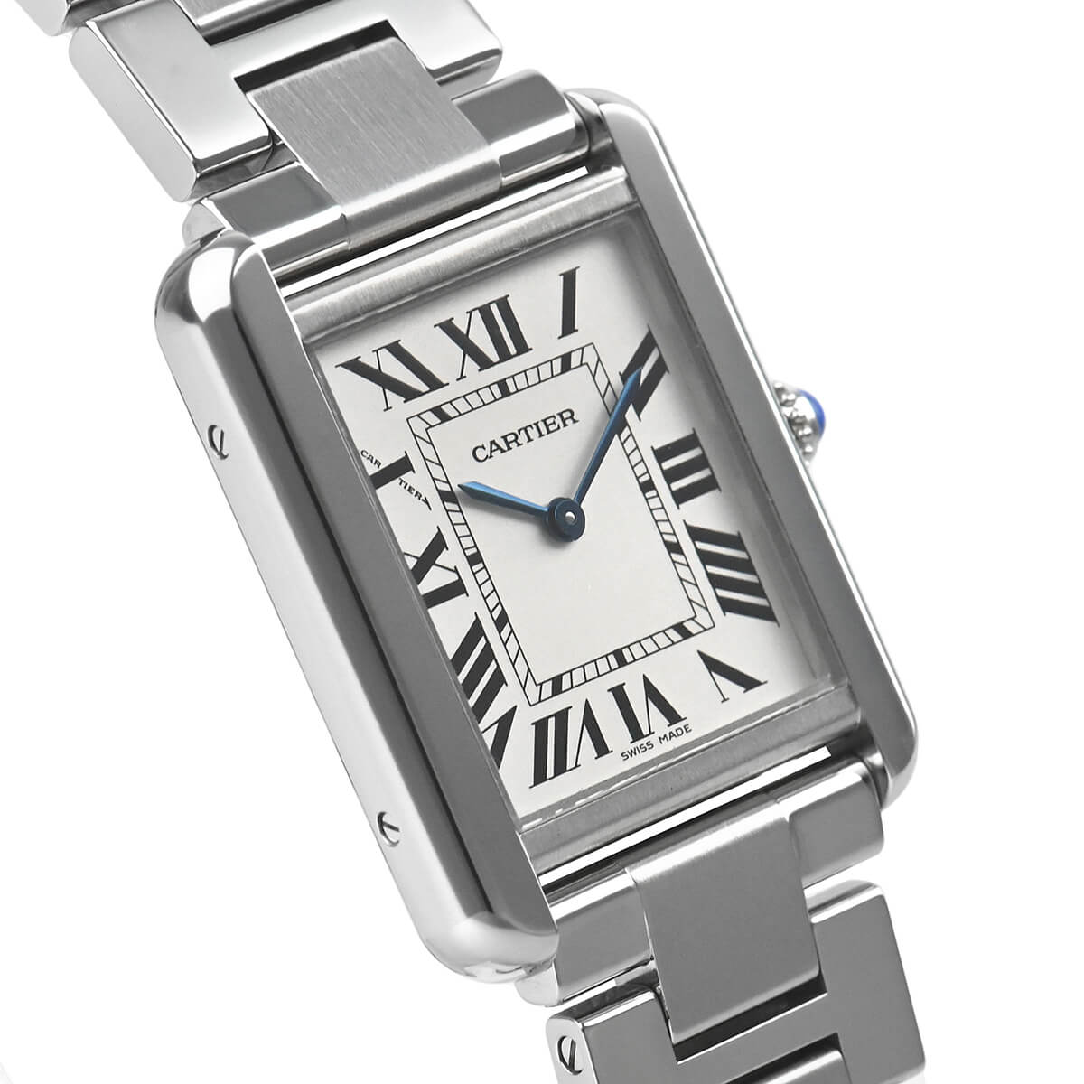 ベーシックなデザインで人気がある「タンク ソロ」のブレスレットモデル。シンプルな美しさのあるモデルですが、ブルースチールの針やローマインデックスなどカルティエらしさも溢れたデザインです。