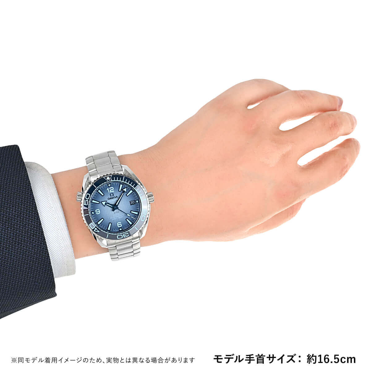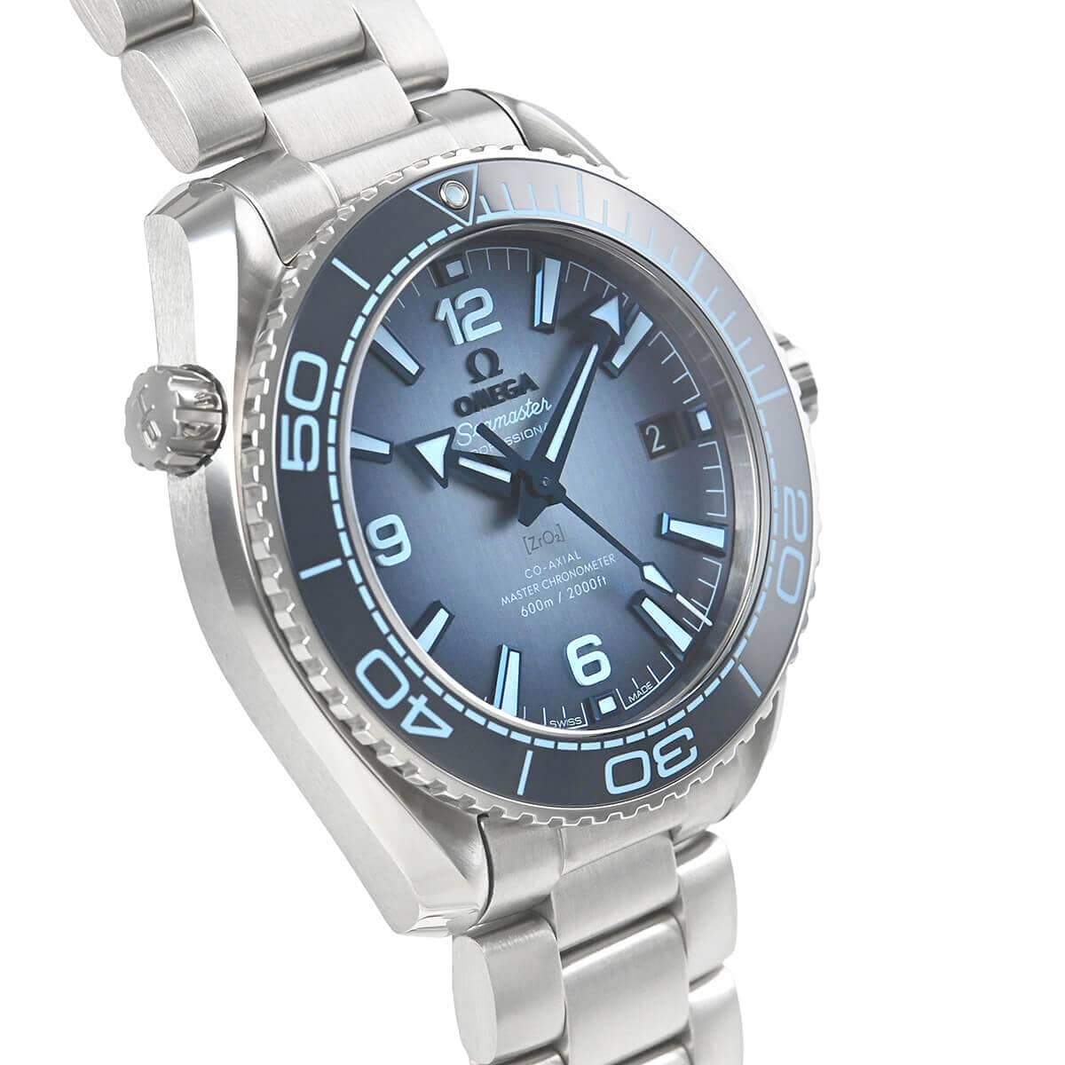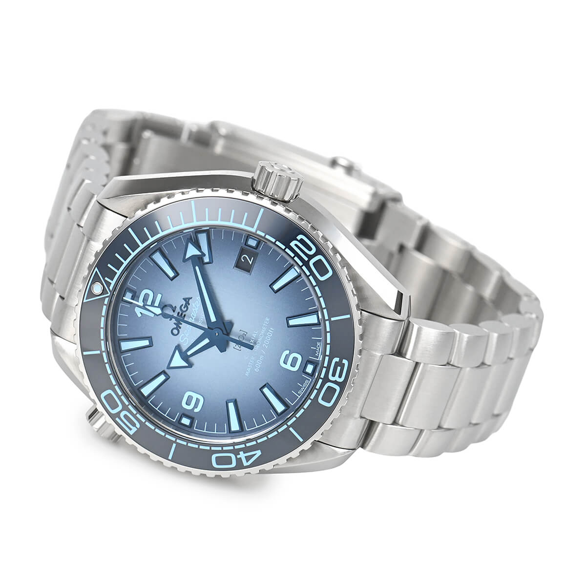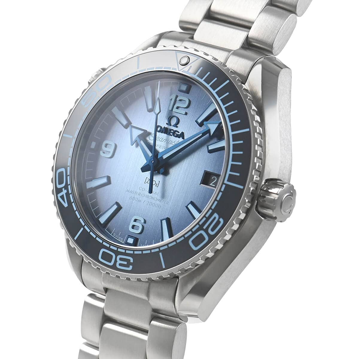 2023年発表の「シーマスター プラネットオーシャンコーアクシャル マスタークロノメーター」。プロフェッショナルダイバーウォッチとして600mの防水性能はそのままに、デザイン性を一新。縦方向にブラッシュ仕上げが施されたセラミックのダイアルカラーは、オメガ独自のサマーブルーが美しい1本です。