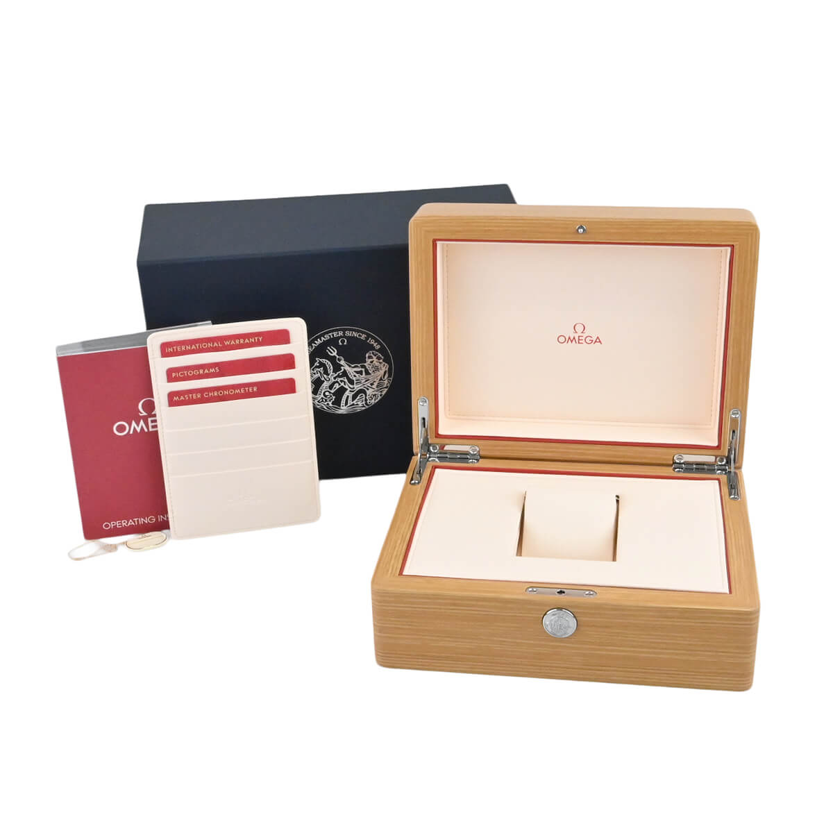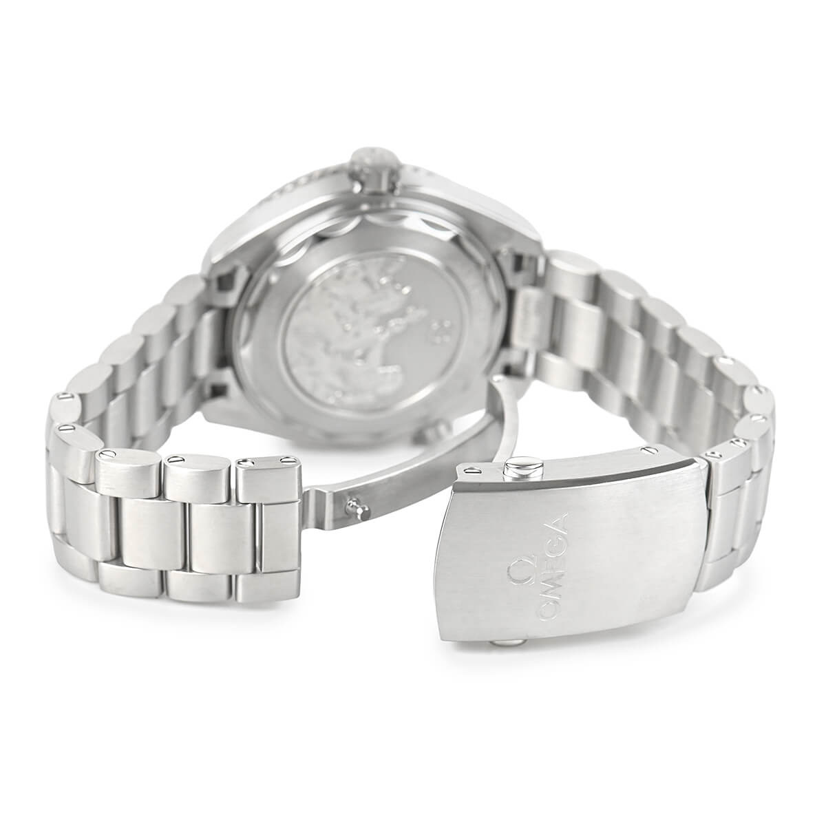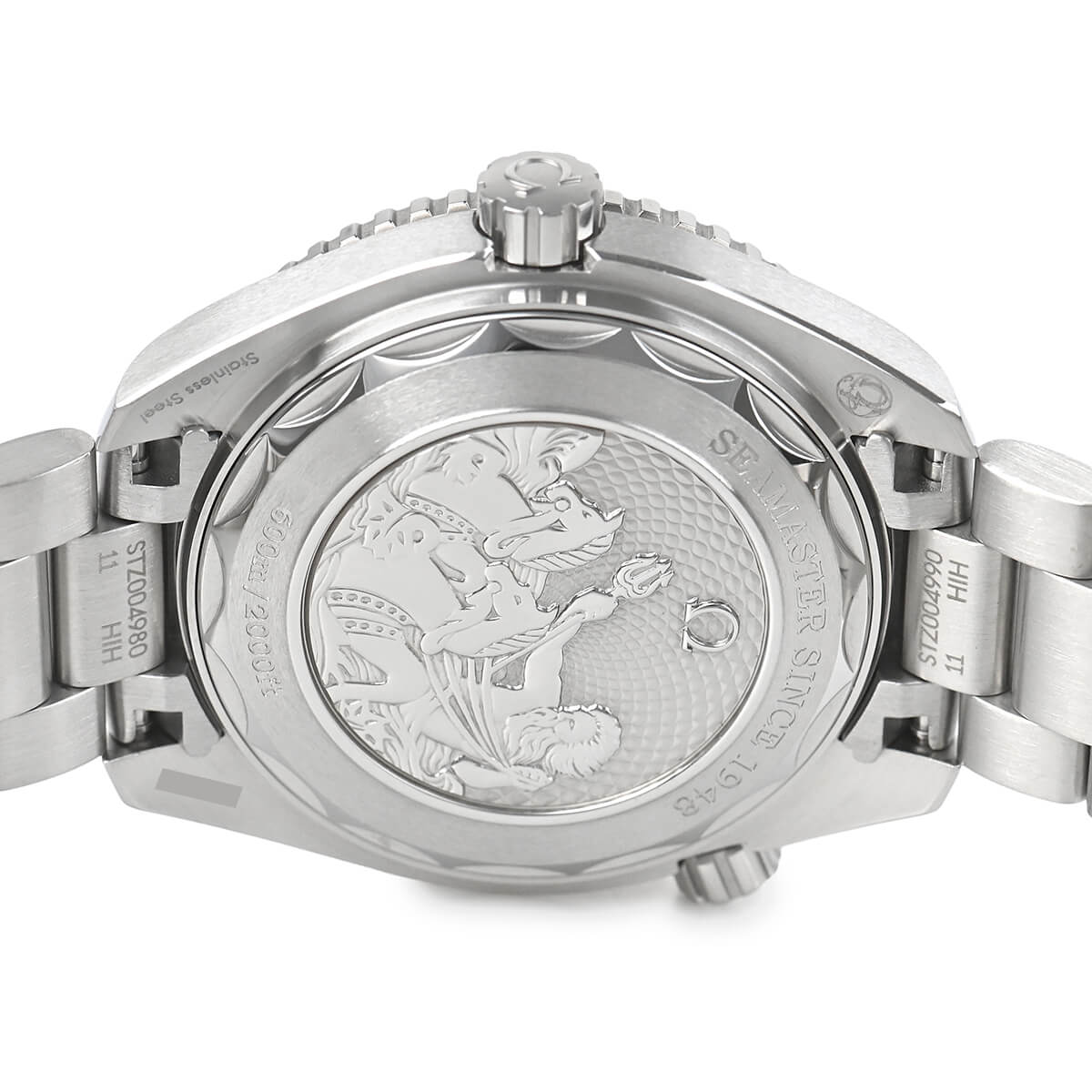 裏側には三叉槍をもつポセイドンと、1956年のオリジナルデザイン、そして現在のデザインのふたつのシーホースを描いたシーマスターの記念ロゴがあしらわれています。ムーブメントは、55時間パワーリザーブを誇り15000ガウス以上の耐磁性を兼ね備えたキャリバー8800を搭載します。