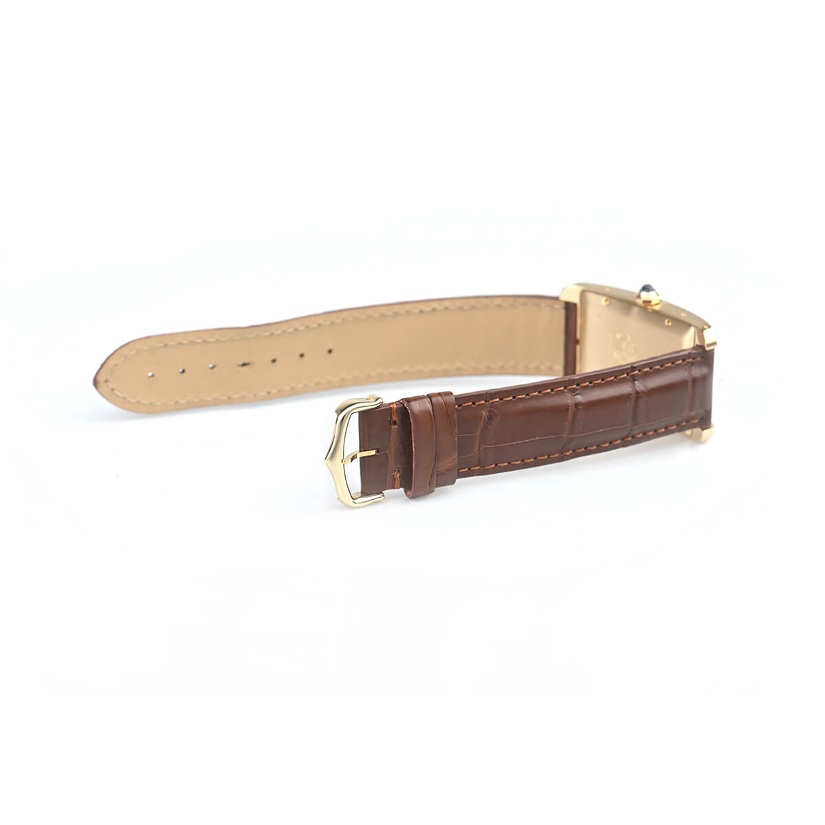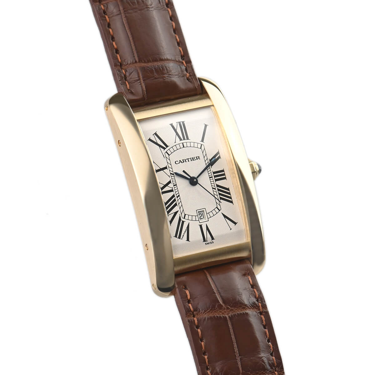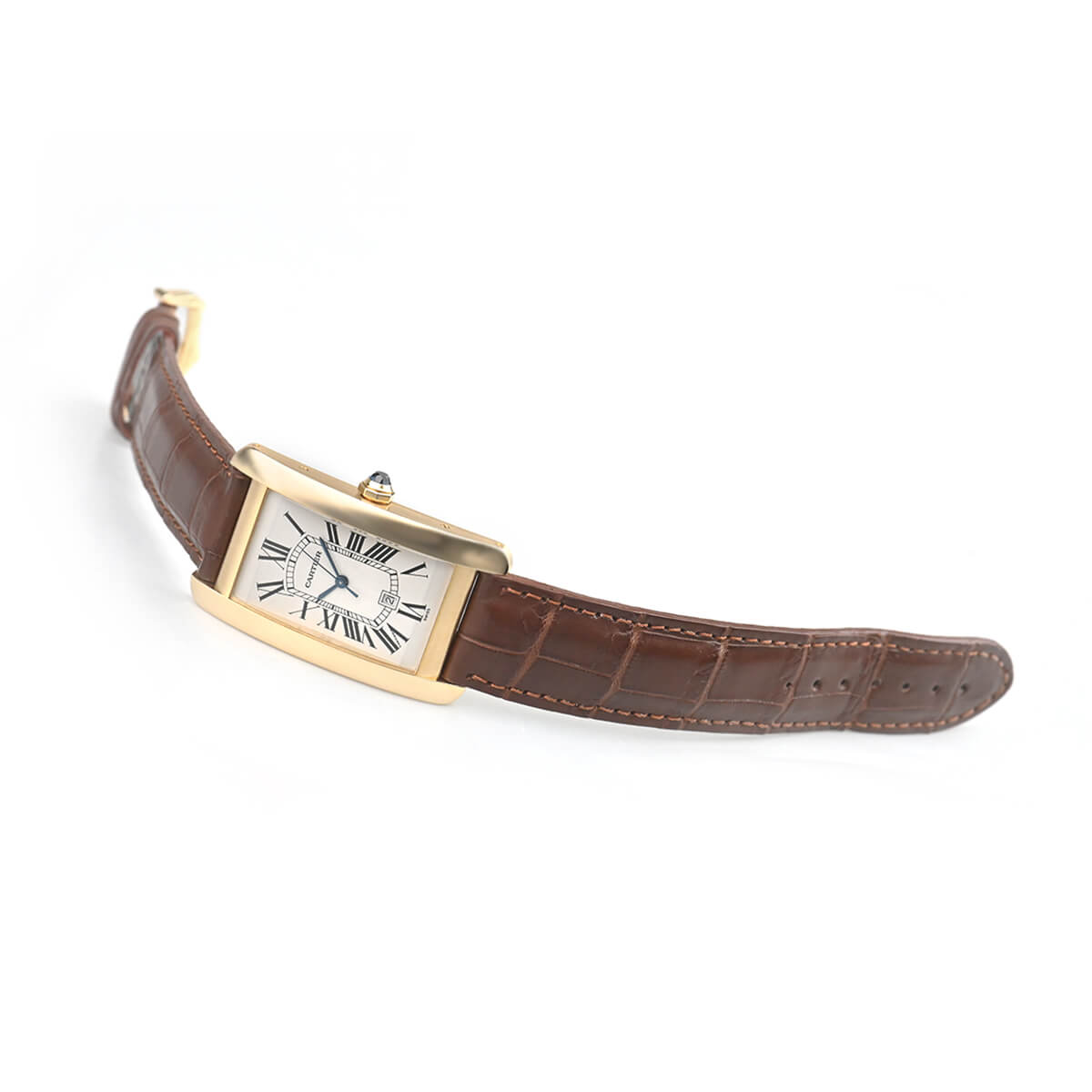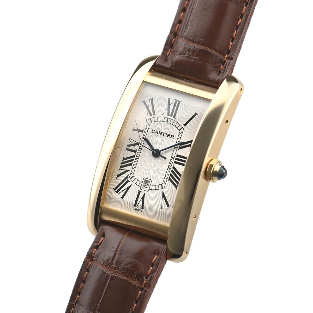 二本の平行するバーを特徴とするタンクシリーズの中でも縦方向に長いデザインが個性的な「タンクアメリカン」。八角形のリューズにはファセットを施したサファイアがセッティングされています。