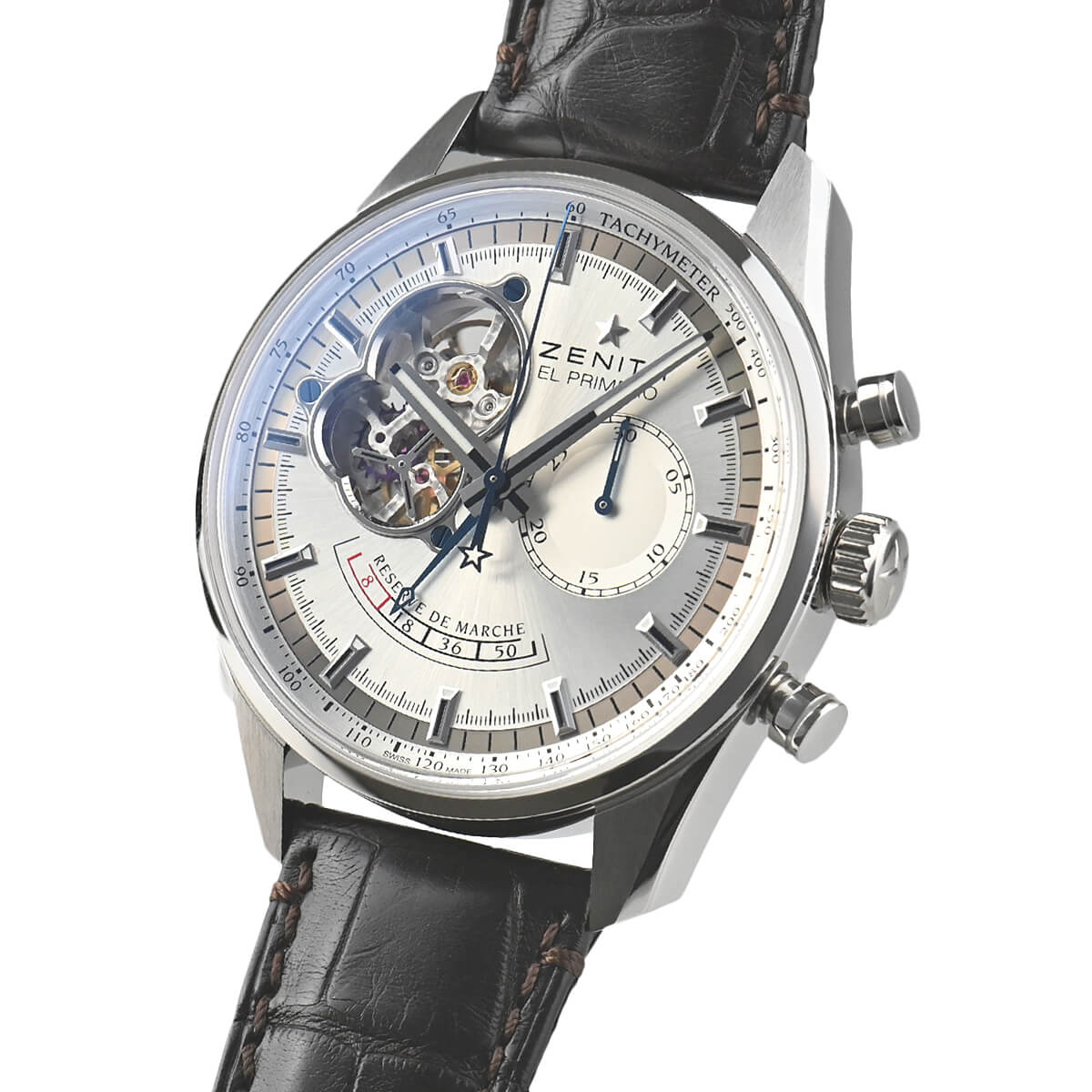 ゼニスを代表するモデル「クロノマスター オープン」。キャプテンシリ−ズの流れを汲むシャープなデザインと、一段と大きくなったオープン部分を手に入れました。