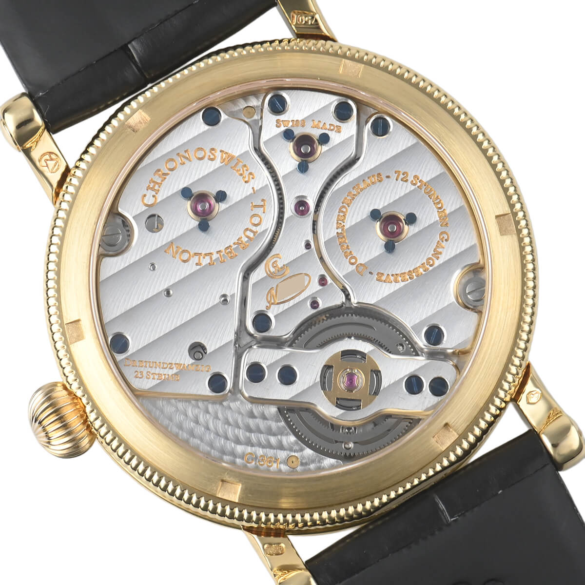ドイツのメーカーでありながら、スイスの時計産業への深い尊敬を表すためにあえて“クロノスイス”と名付けられた拘りのブランドから「レギュレータートゥールビヨン」が入荷いたしました。針が同軸上になく、それぞれが独立して取り付けられ、6時位置ではトゥールビヨンの動きを楽しめるようになっています。