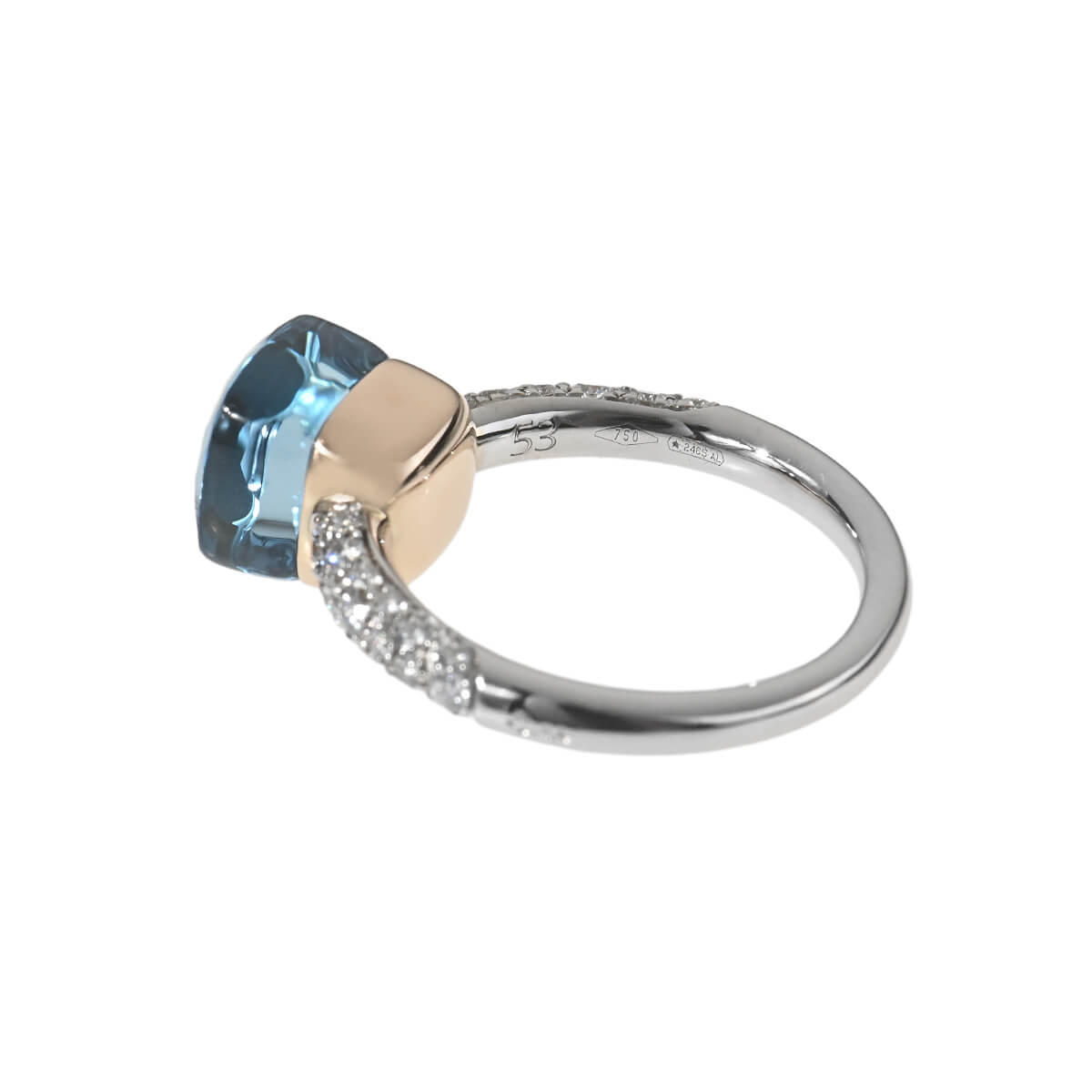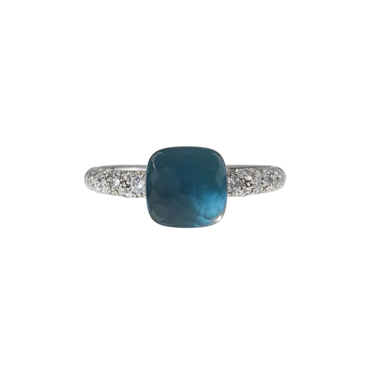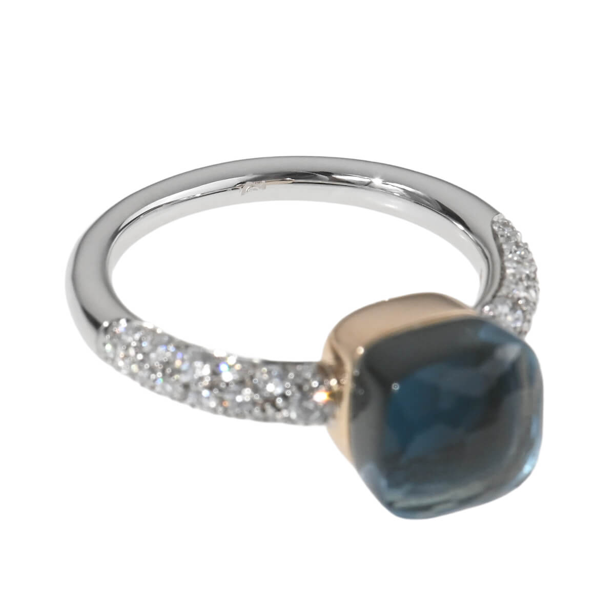 太陽の光が降り注ぐ地中海に広がる無限の青、その魅惑的な色彩からインスピレーションを受け、これまでにない鮮やかさを放つストーンで表現した『Pomellato(ポメラート)』の「ヌード ディープブルー」コレクション。まるで太陽の光がきらめく水面のように、色彩豊かなハードストーンが光を放つデザインは、地中海の夏のエネルギーに満ちています。ローズゴールドのマウントにターコイズを薄く敷き、そのうえに深海のような濃いブルーカラーのロンドンブルートパーズを重ね、ホワイトゴールドのアームにパヴェダイヤモンドを敷き詰めたプチサイズのヌードリング。オーシャンブルーのダブレットストーンは光降りそそぐ地中海の岸辺に漂う、まどろむように穏やかなムードを映し出し、パヴェセッティングしたダイヤモンドが水面で舞う光を思い起こさせます。ニュアンス豊かな色彩が一層目を惹く、ポメラートらしいお洒落な個性と遊び心、そしてインパクトある美しさにあふれたコレクションジュエリーです。