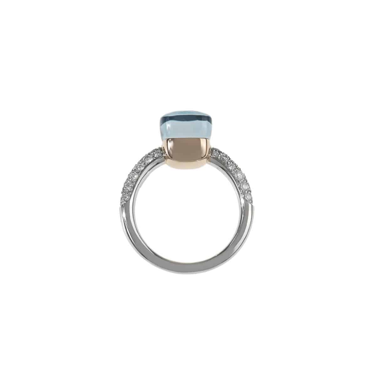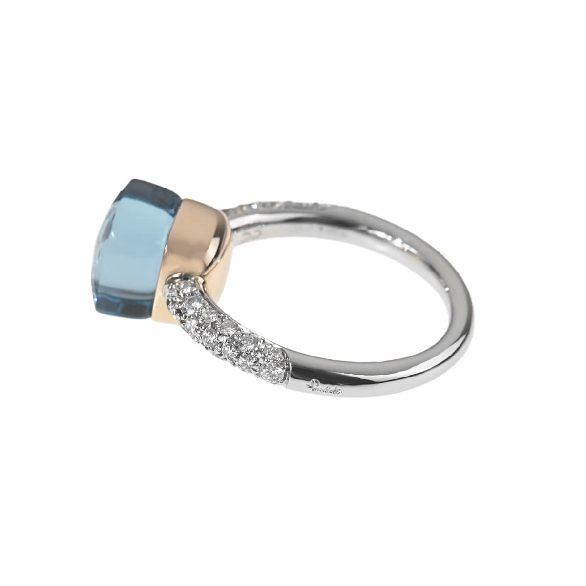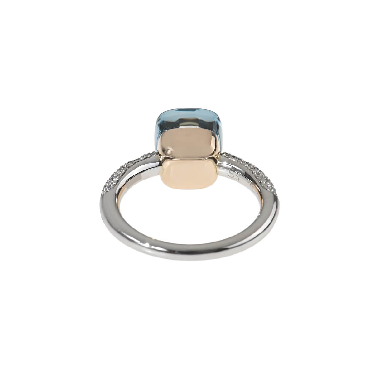 太陽の光が降り注ぐ地中海に広がる無限の青、その魅惑的な色彩からインスピレーションを受け、これまでにない鮮やかさを放つストーンで表現した『Pomellato(ポメラート)』の「ヌード ディープブルー」コレクション。まるで太陽の光がきらめく水面のように、色彩豊かなハードストーンが光を放つデザインは、地中海の夏のエネルギーに満ちています。ローズゴールドのマウントにターコイズを薄く敷き、そのうえに深海のような濃いブルーカラーのロンドンブルートパーズを重ね、ホワイトゴールドのアームにパヴェダイヤモンドを敷き詰めたプチサイズのヌードリング。オーシャンブルーのダブレットストーンは光降りそそぐ地中海の岸辺に漂う、まどろむように穏やかなムードを映し出し、パヴェセッティングしたダイヤモンドが水面で舞う光を思い起こさせます。ニュアンス豊かな色彩が一層目を惹く、ポメラートらしいお洒落な個性と遊び心、そしてインパクトある美しさにあふれたコレクションジュエリーです。