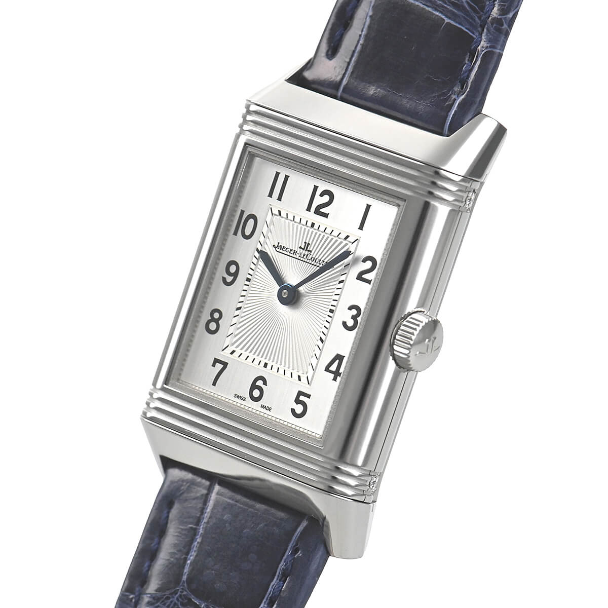 角型時計の代名詞であるレベルソのユニセックスモデル「レベルソ クラシック ミディアムデュエット」。反転するケースを巧に活かして、表と裏側で全く表情の異なるデザインにしています。