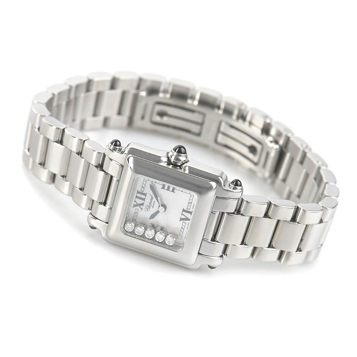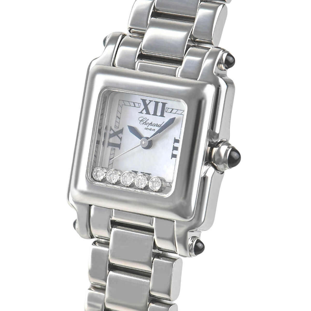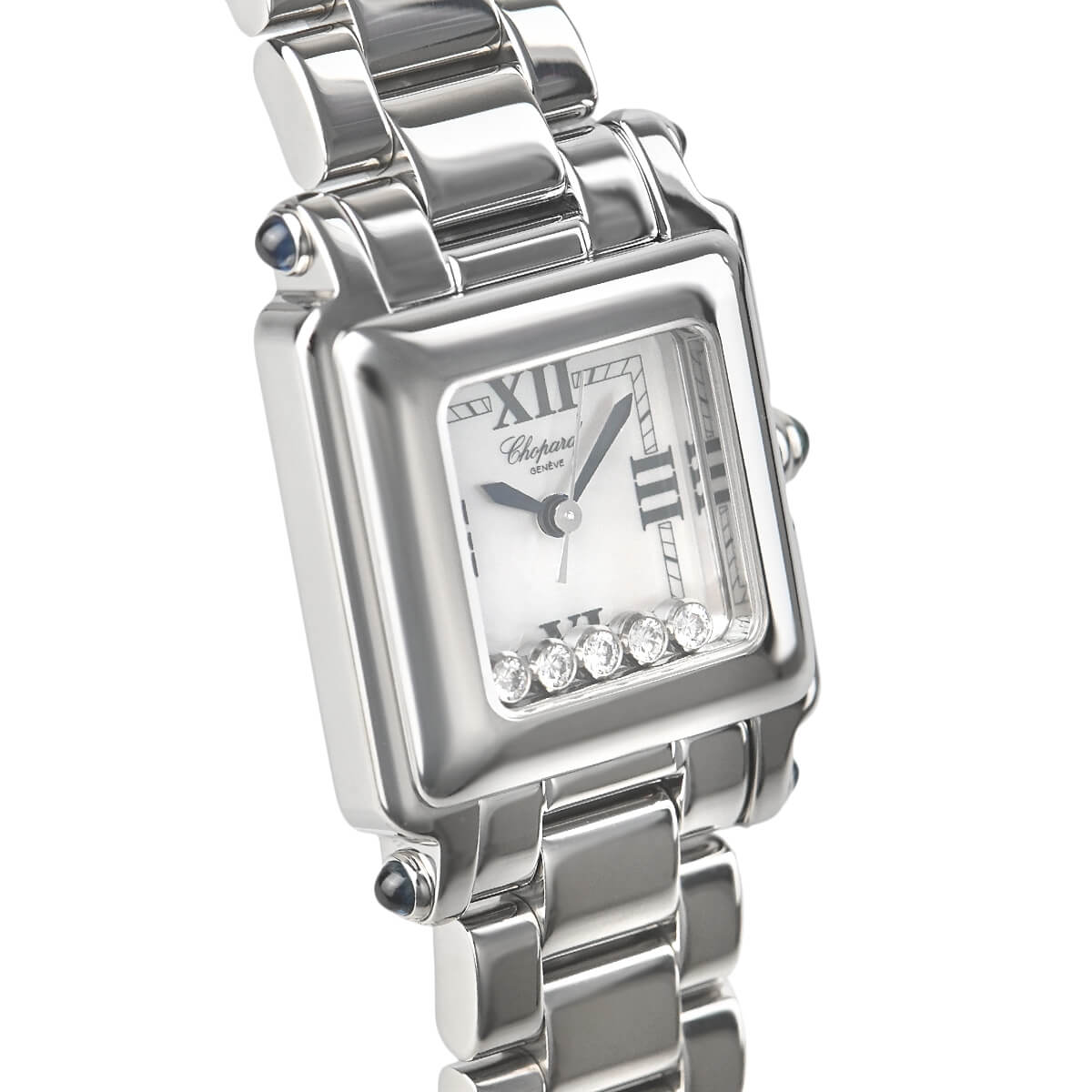 キラキラと動くダイヤモンドが特徴のハッピースポーツ。文字盤とガラスの間に一層設け、その間にダイヤモンドを入れています。