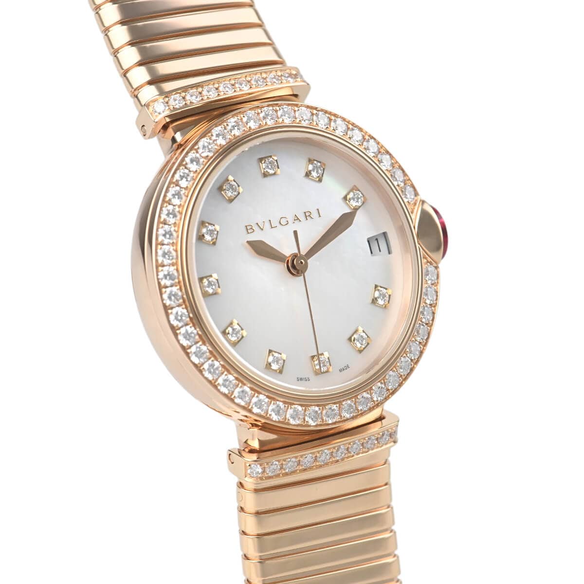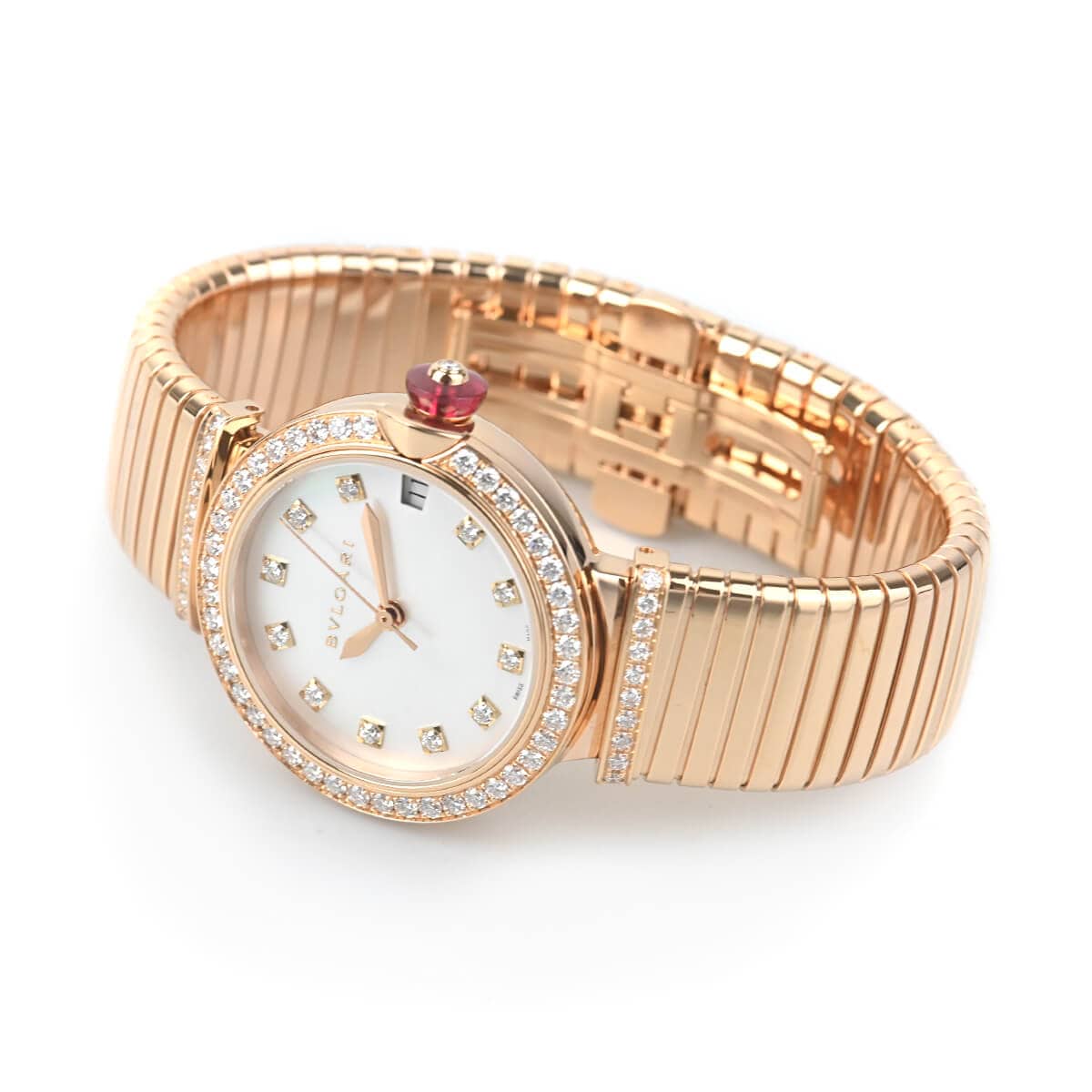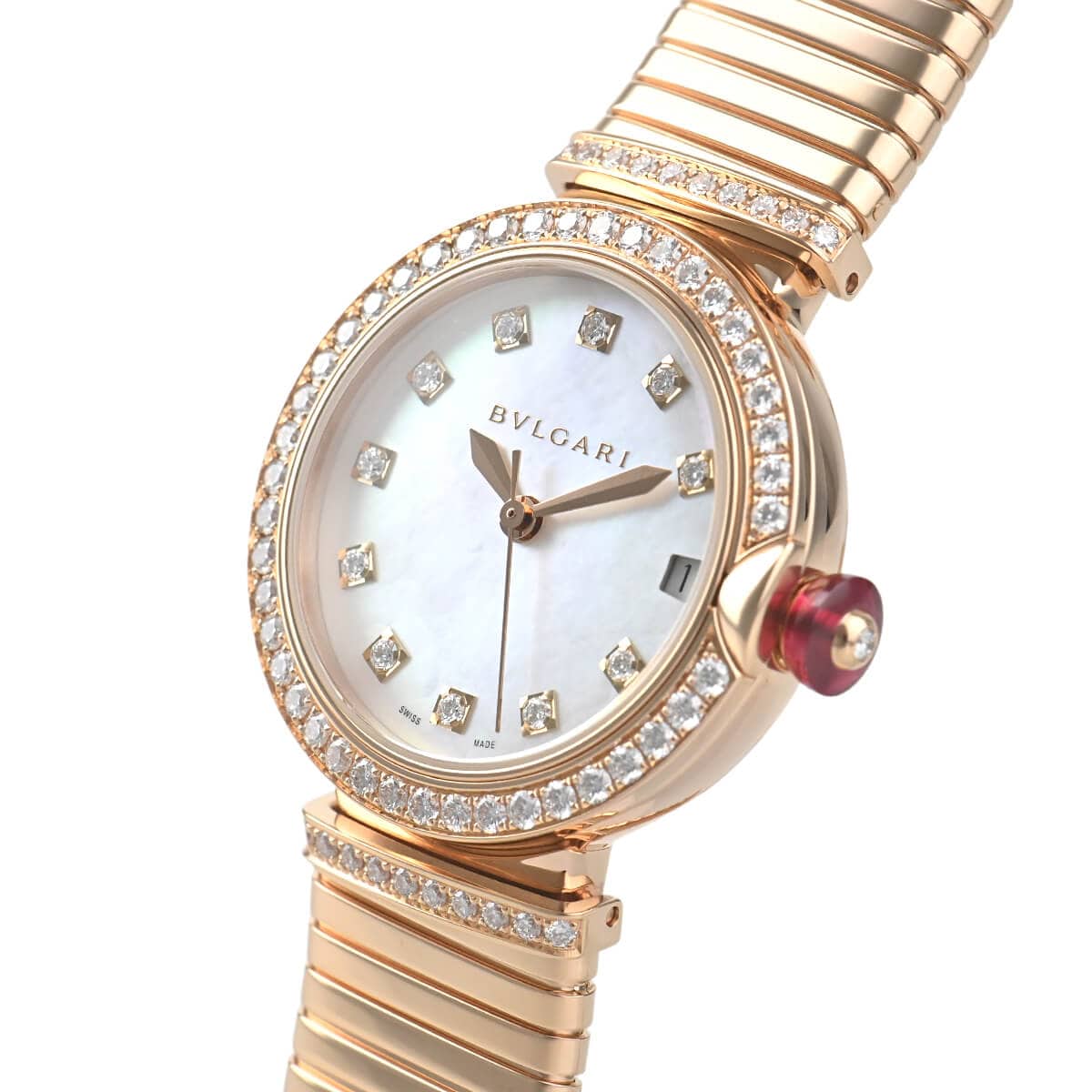 こちらはルチェアとブルガリジュエリーの伝統ともいえるトゥボガスブレスレットを組み合わせたフェミニンなモデルで、ホワイトシェル文字盤に11ポントのダイヤセッティングも施されています。