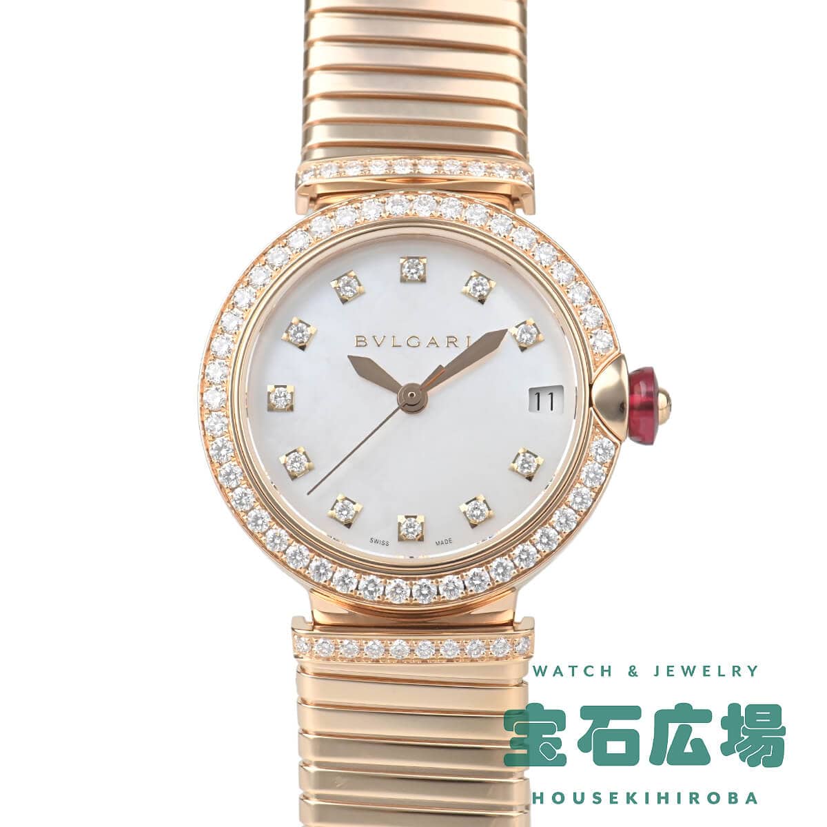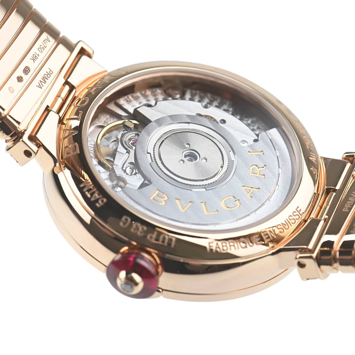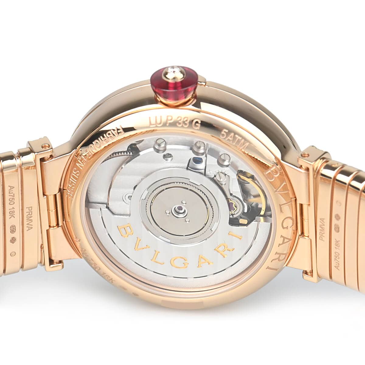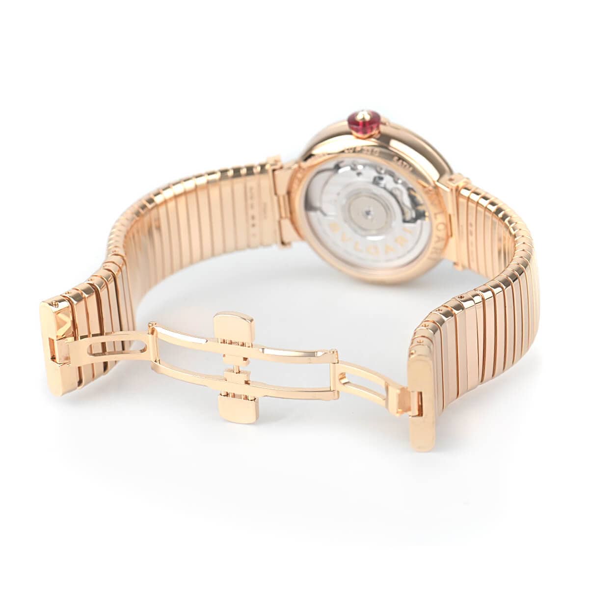 こちらはルチェアとブルガリジュエリーの伝統ともいえるトゥボガスブレスレットを組み合わせたフェミニンなモデルで、ホワイトシェル文字盤に11ポントのダイヤセッティングも施されています。