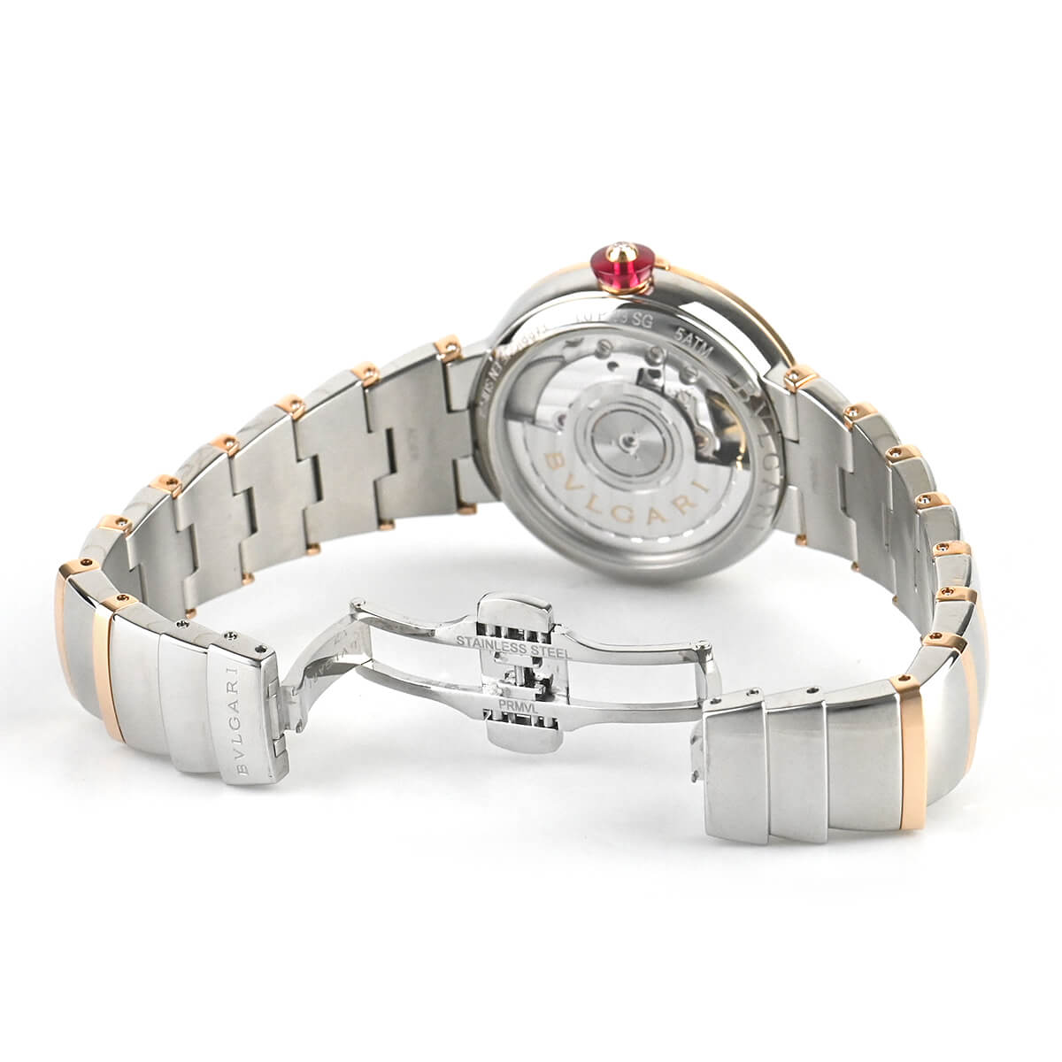 光を意味するイタリア語の“ルーチェ”とラテン語の“ルクス”から名づけられた「ルチェア」。カボションカットのピンク シンセティック サファイアを使用したリューズに、ダイヤモンドをマウントするなど、ハイジュエラーならではの細工が施された一本です。