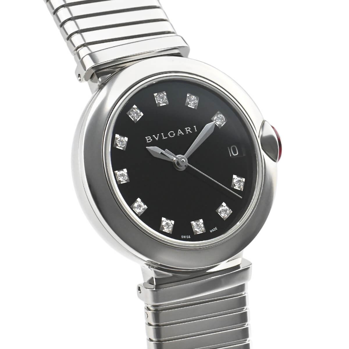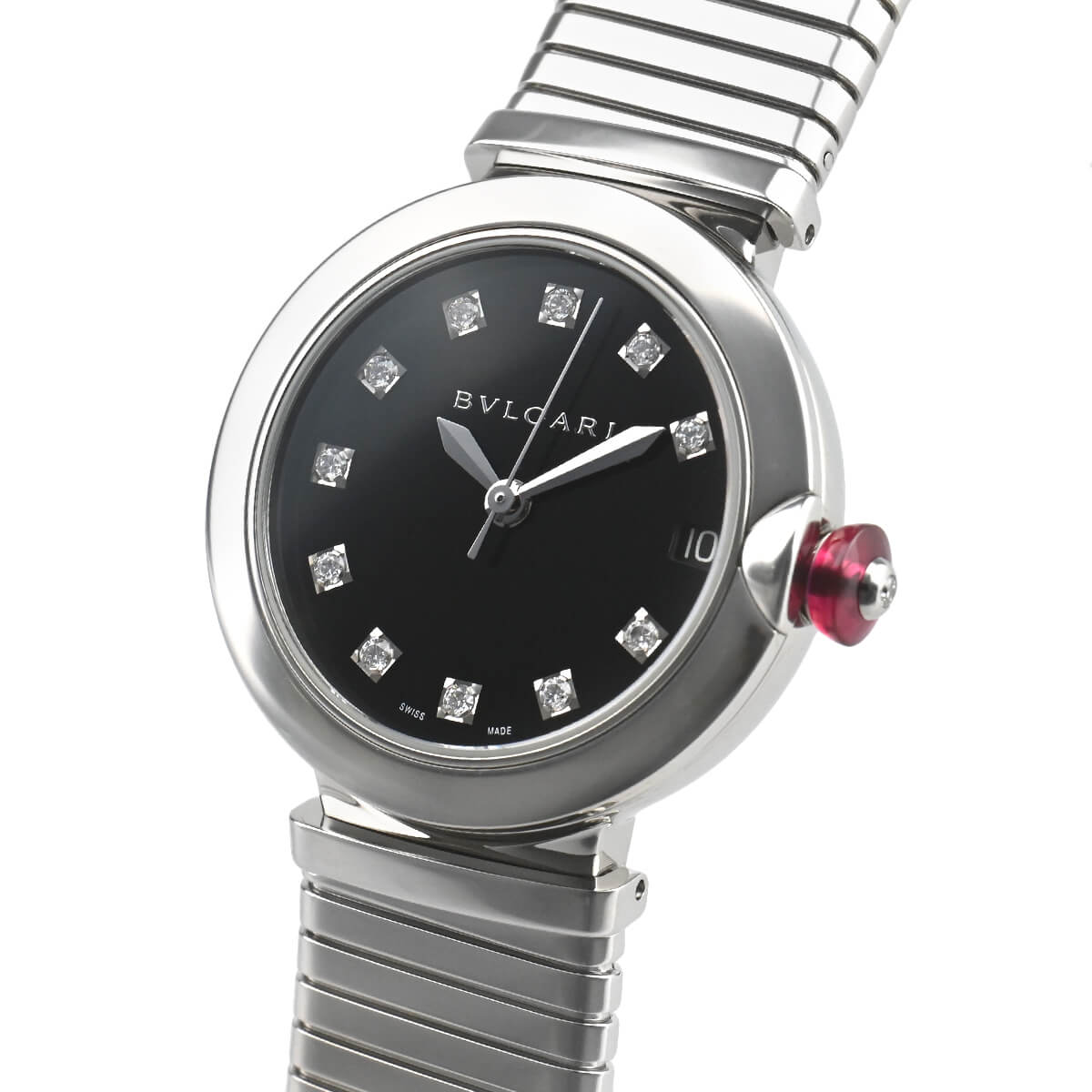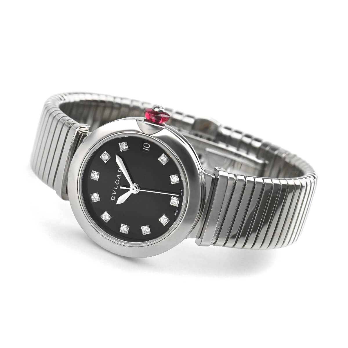 こちらはルチェアとブルガリジュエリーの伝統ともいえるトゥボガスブレスレットを組み合わせたフェミニンなモデルで、ブラックダイアルには11ポイントのダイヤセッティングも施されています。