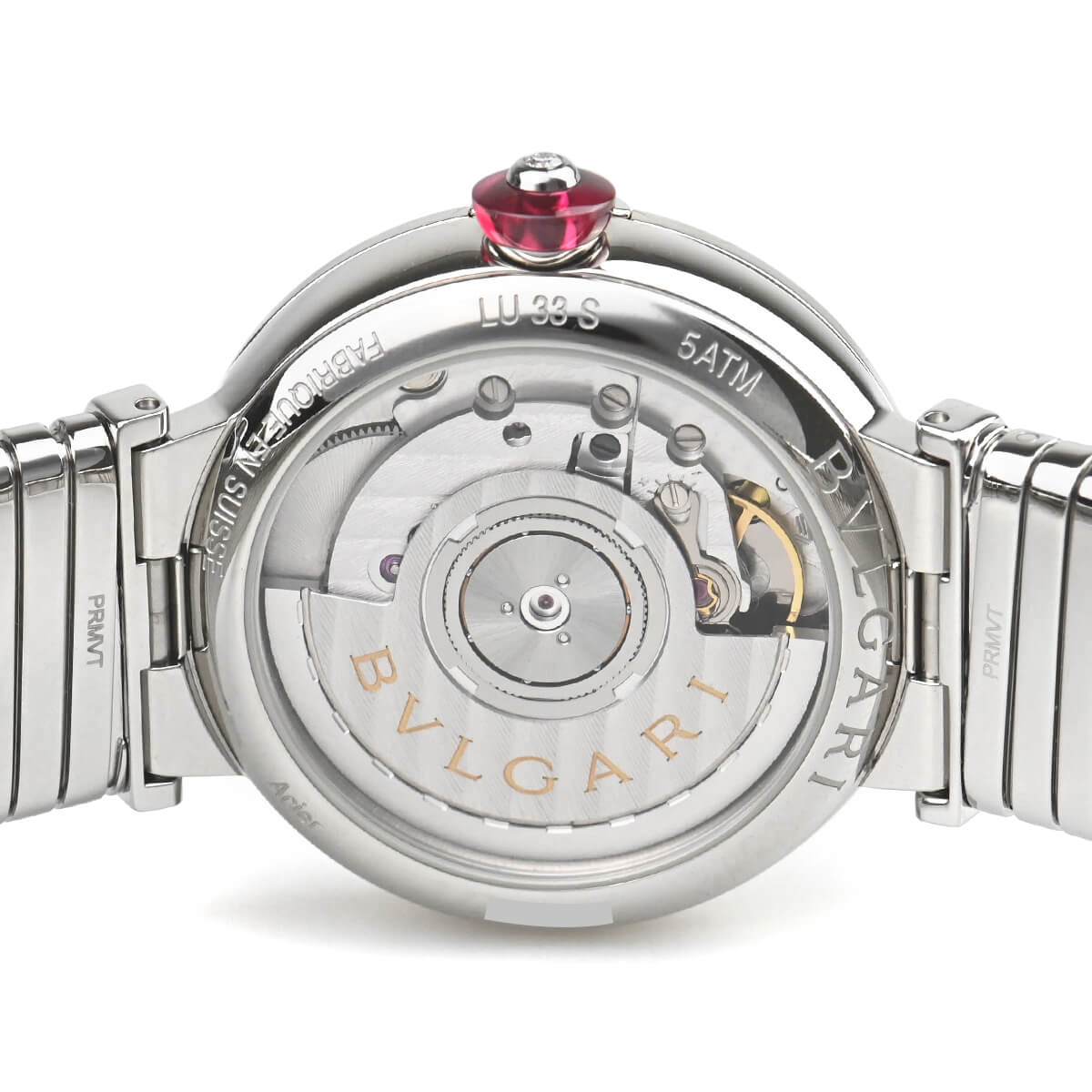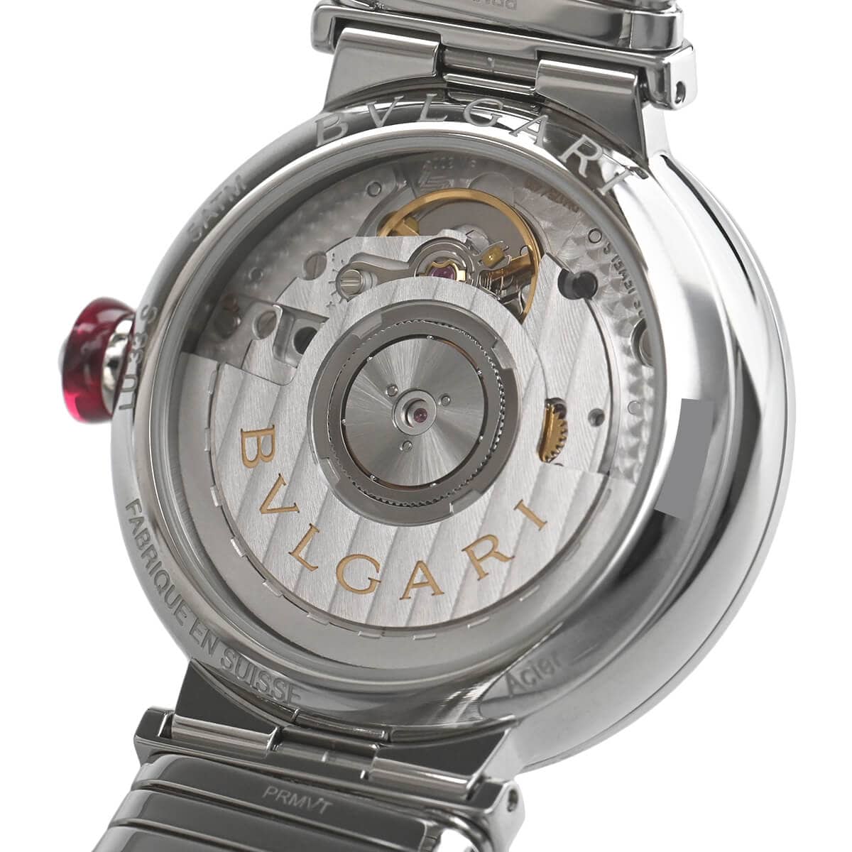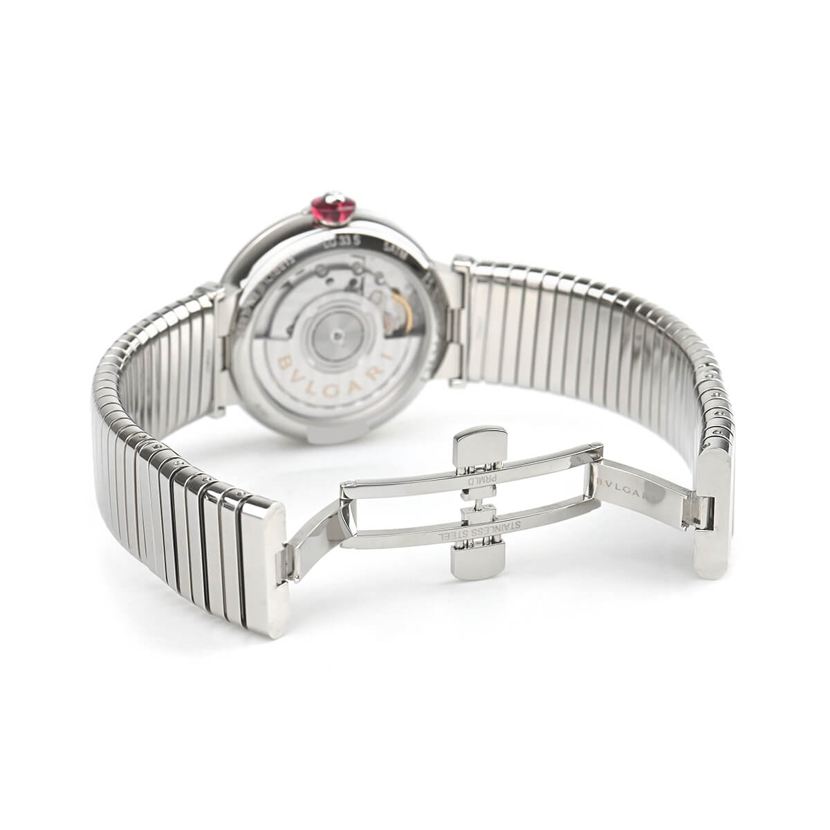 こちらはルチェアとブルガリジュエリーの伝統ともいえるトゥボガスブレスレットを組み合わせたフェミニンなモデルで、ブラックダイアルには11ポイントのダイヤセッティングも施されています。