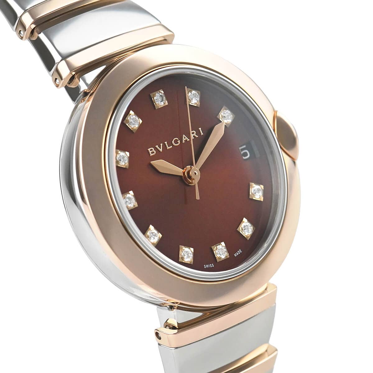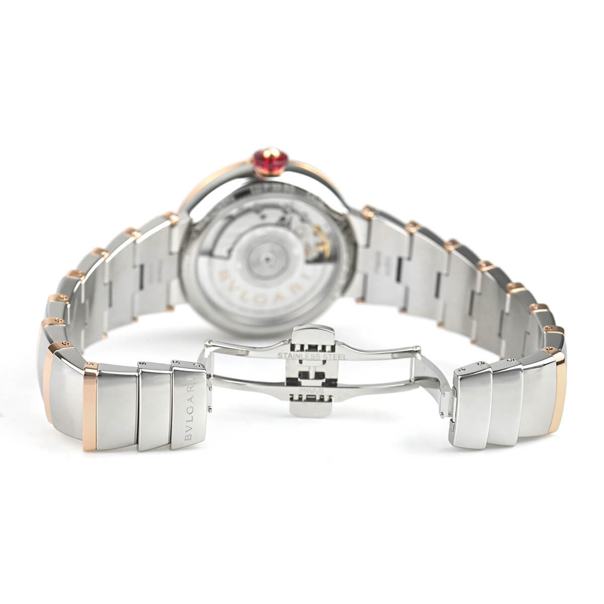 光を意味するイタリア語の“ルーチェ”とラテン語の“ルクス”から名づけられた「ルチェア」。カボションカットのピンク シンセティック サファイアを使用したリューズに、ダイヤモンドをマウントするなど、ハイジュエラーならではの細工が施された一本です。