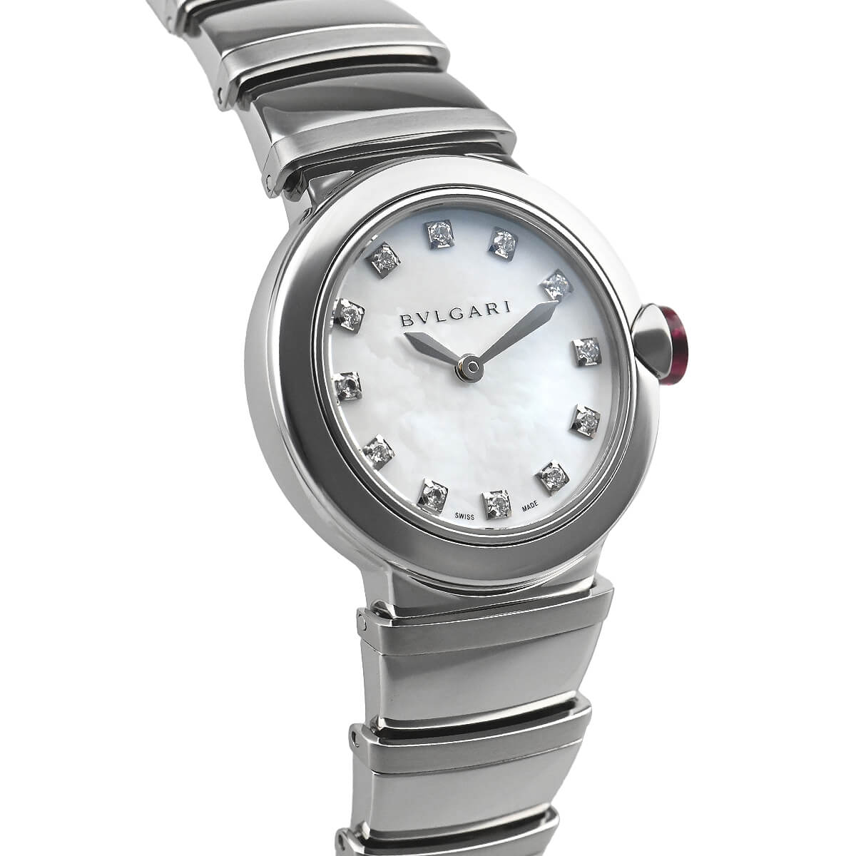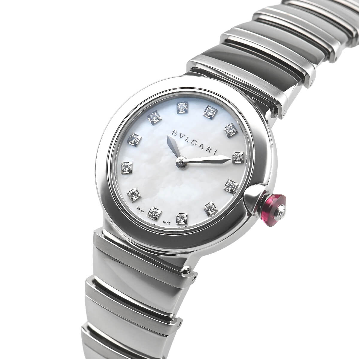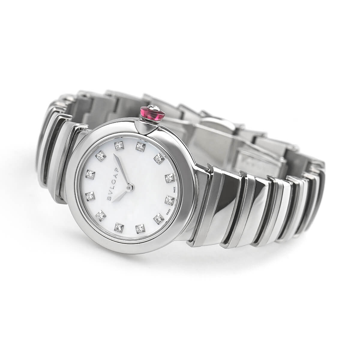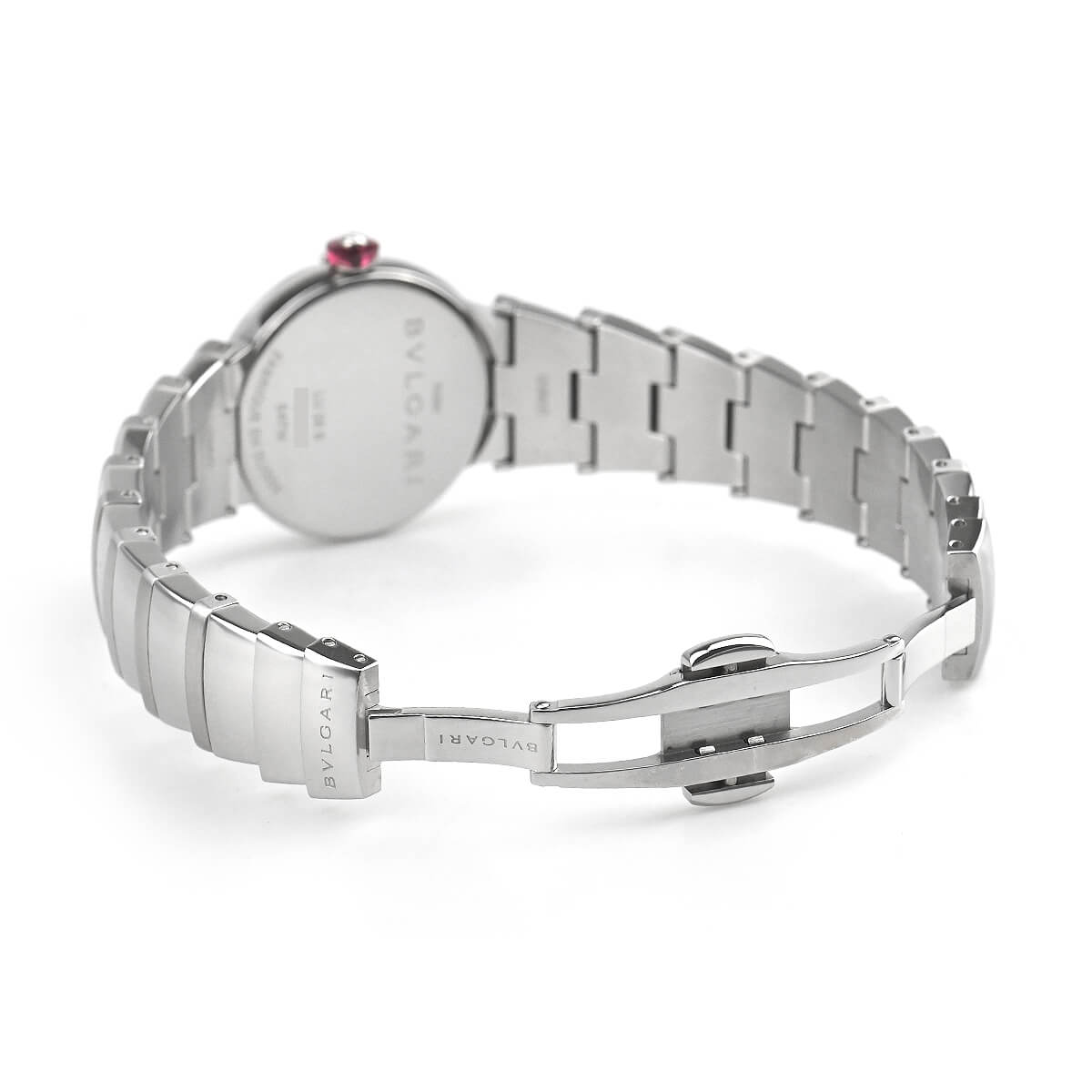 シンプルな円筒形のケースにブルガリらしい斬新なブレスレットが合わさることにより、モダンな印象を与えています。