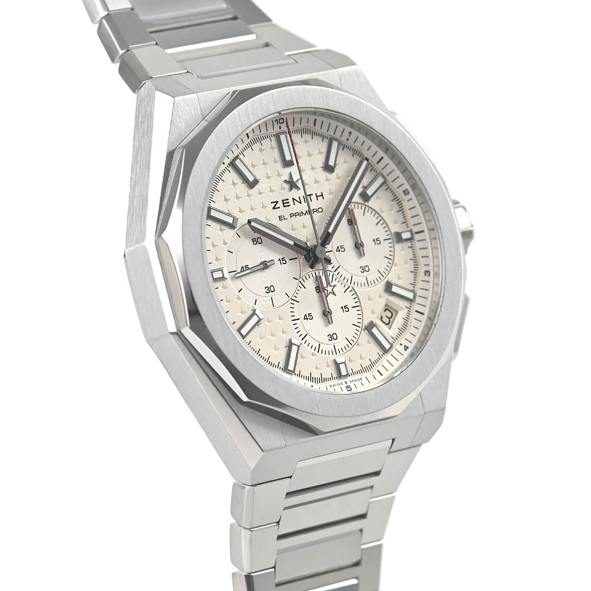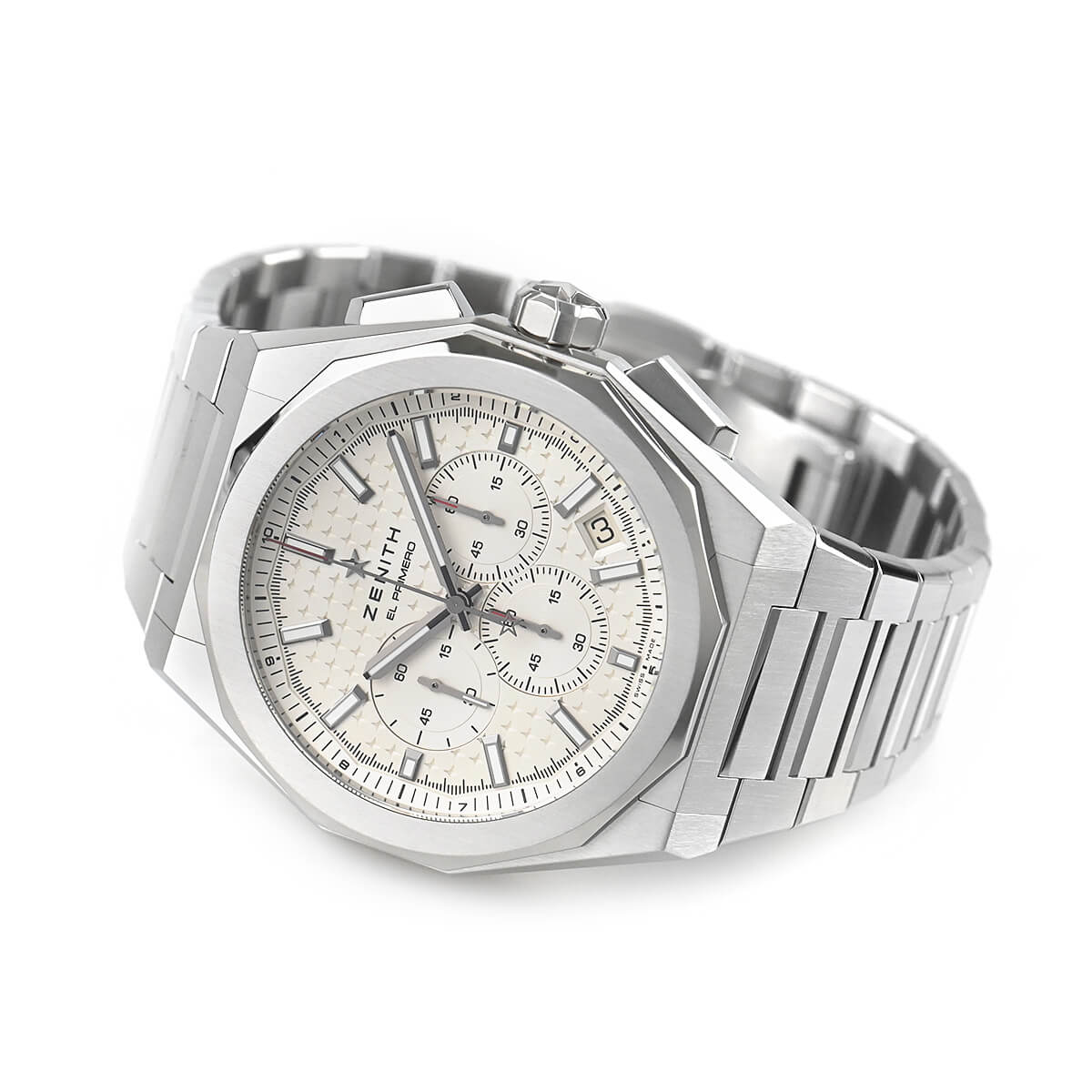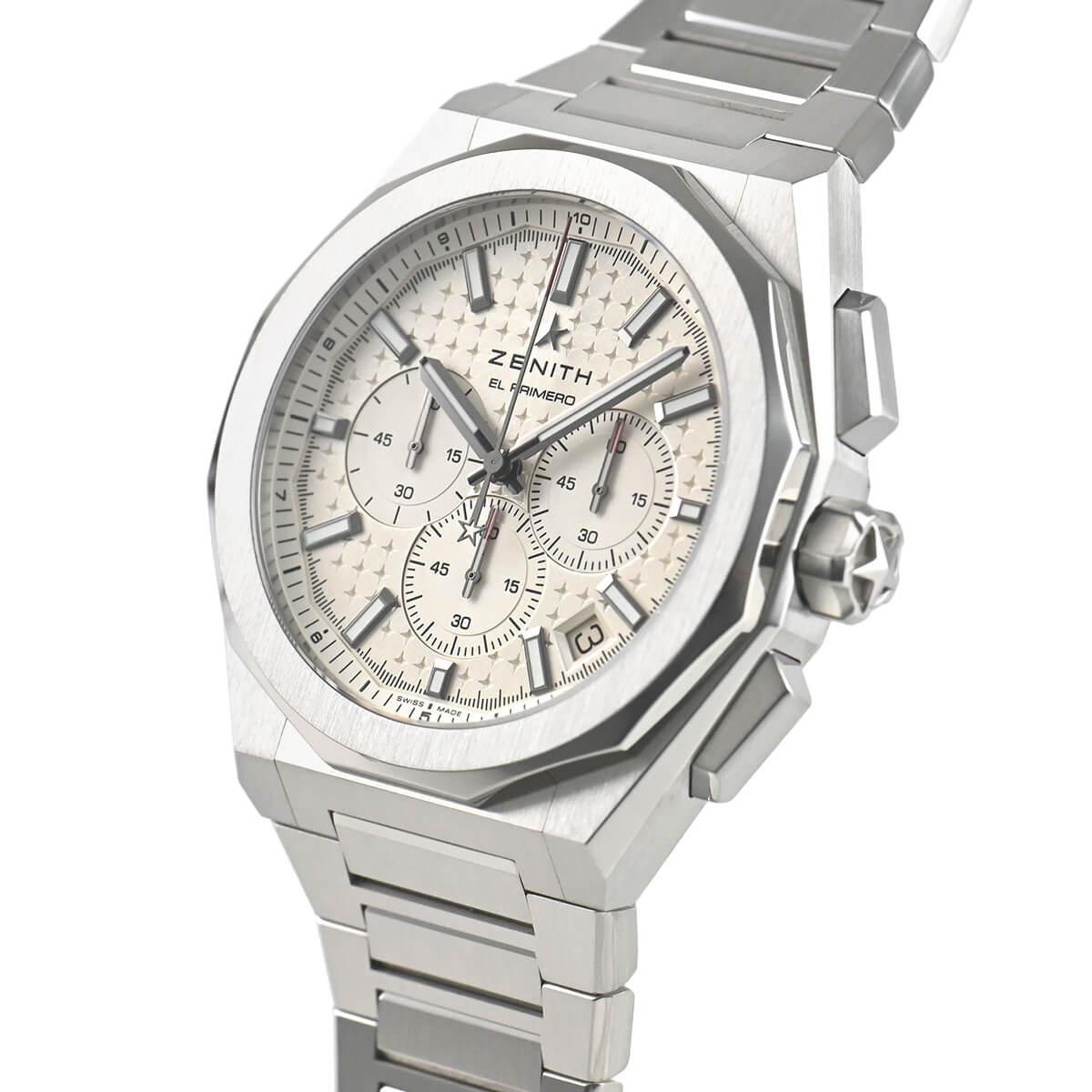 サンバーストパターンのシルバー文字盤に、ゼニスの象徴である4つの点を結んだ星があしらわれています。1/10秒精度を誇る初のインジケーターを備えた高振動エル・プリメロ 3600自動巻クロノグラフムーブメントを搭載。