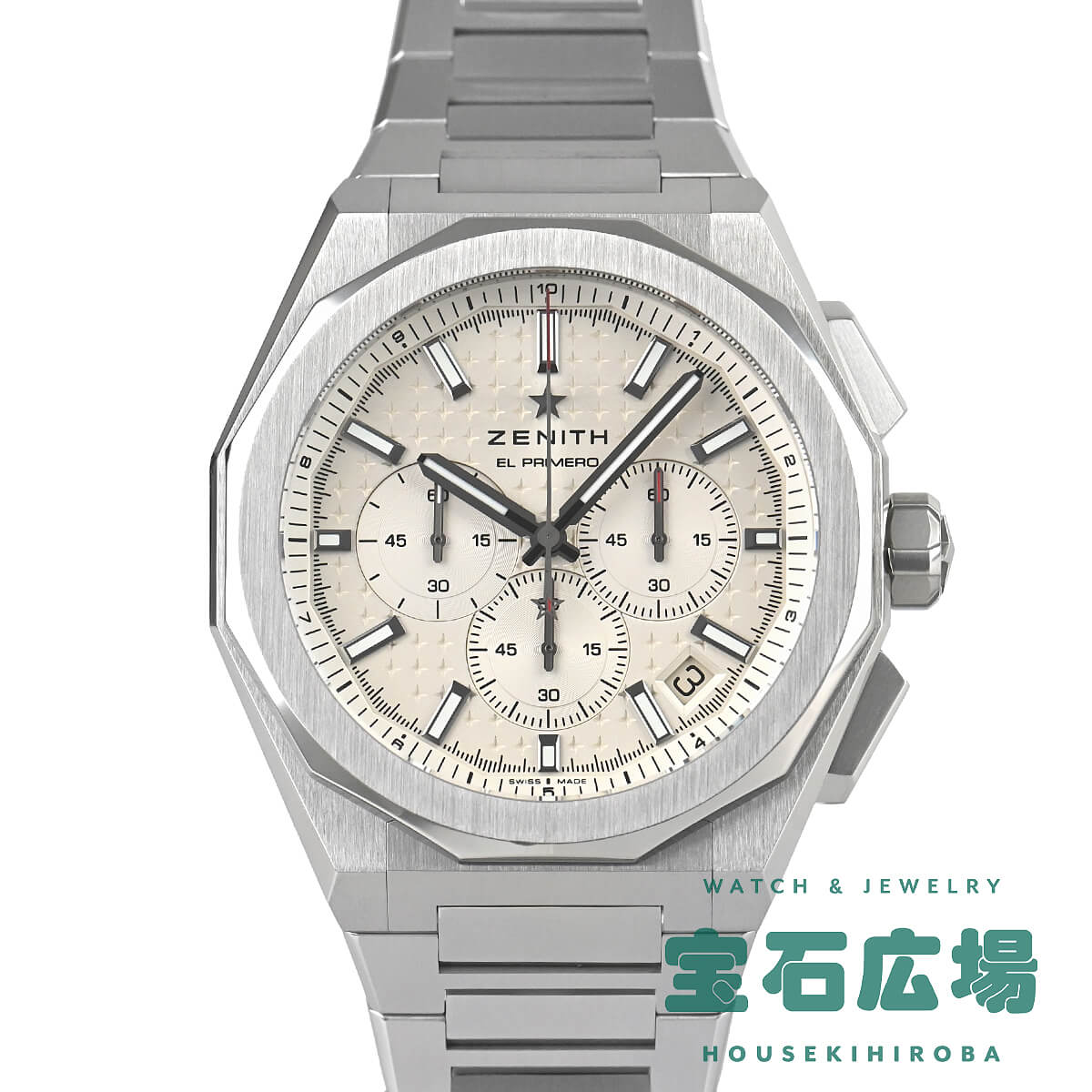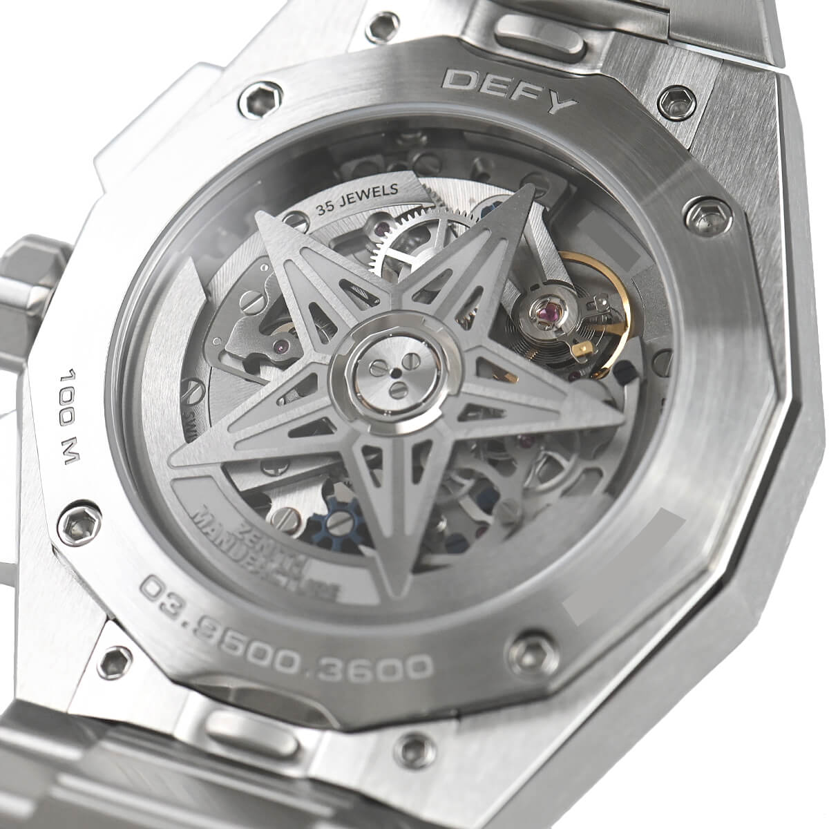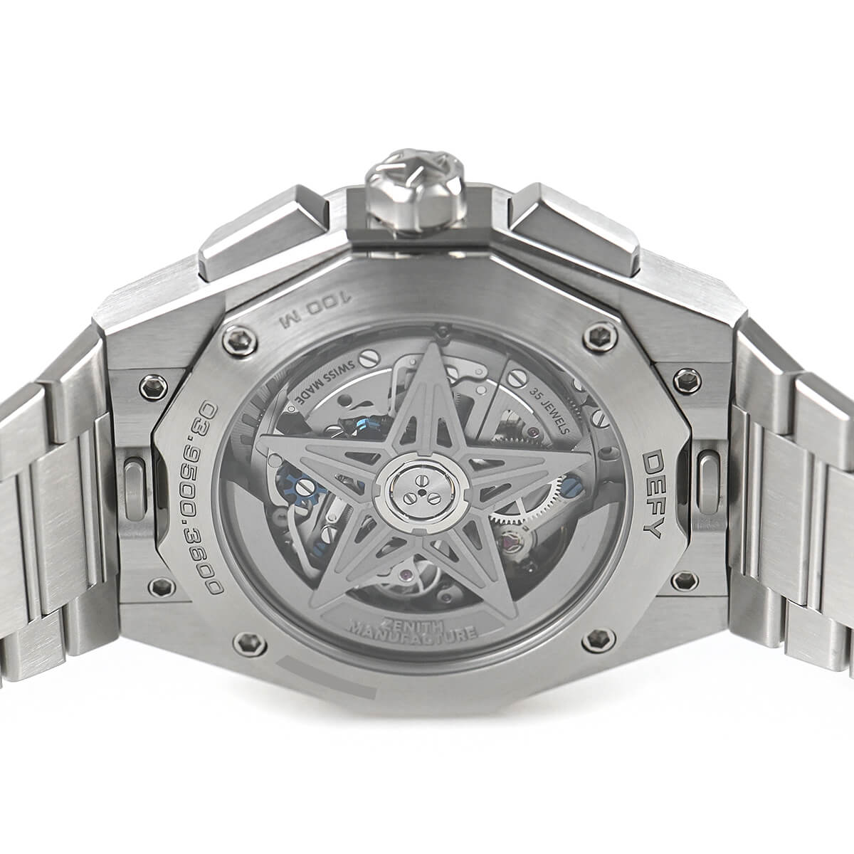 サンバーストパターンのシルバー文字盤に、ゼニスの象徴である4つの点を結んだ星があしらわれています。1/10秒精度を誇る初のインジケーターを備えた高振動エル・プリメロ 3600自動巻クロノグラフムーブメントを搭載。
