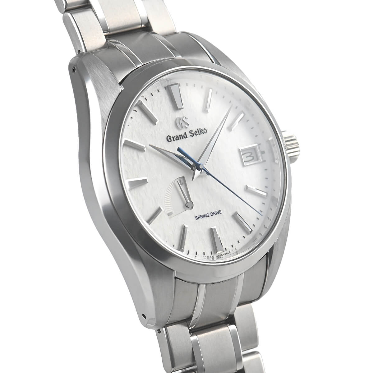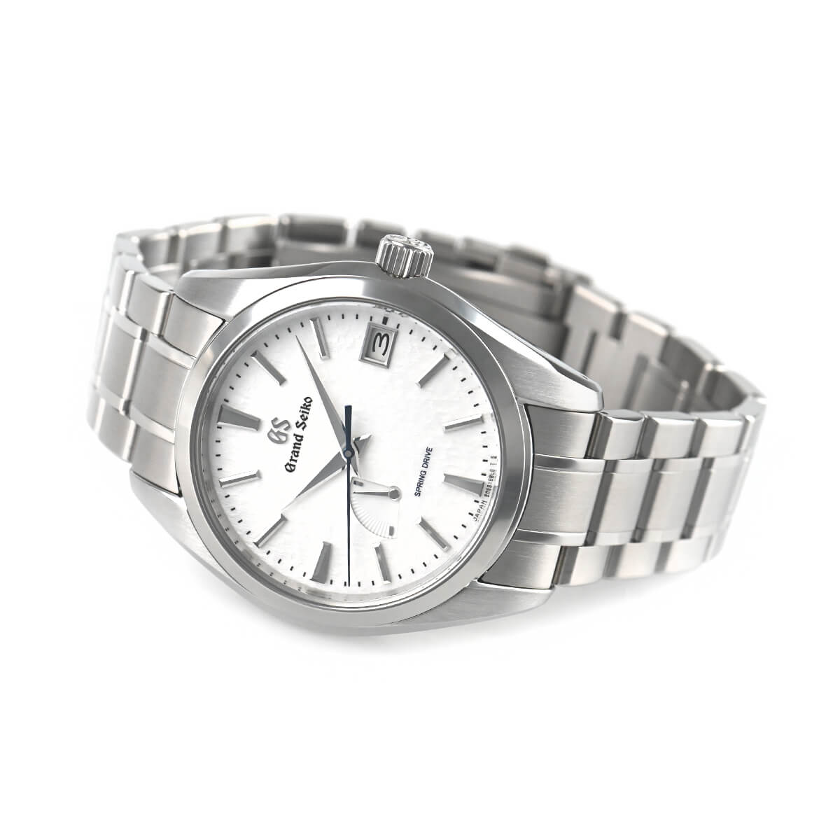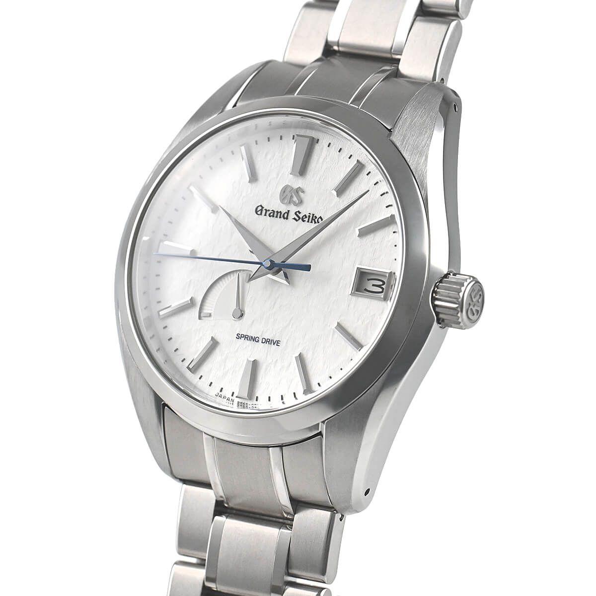 スプリングドライブの故郷、諏訪地方から望む美しい北アルプスに降り積もる新雪をイメージした文字盤が特徴で、セイコーが得意とするブライトチタンをケース素材に採用したこだわりの一本。