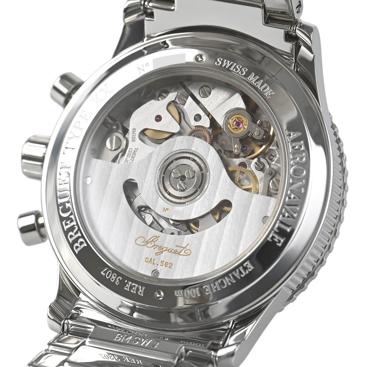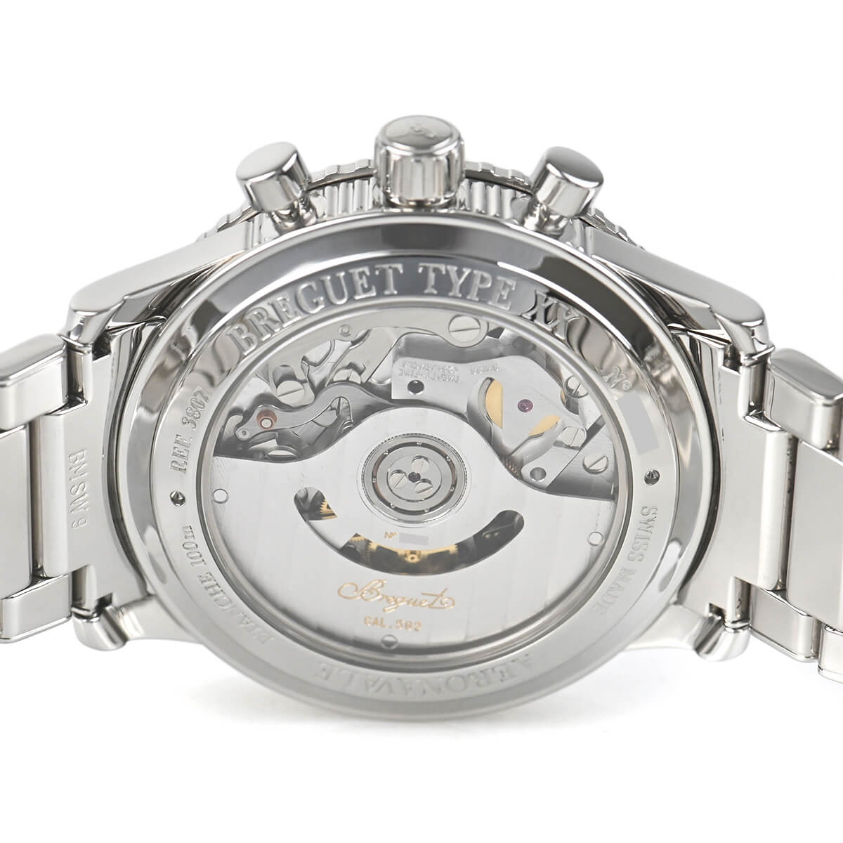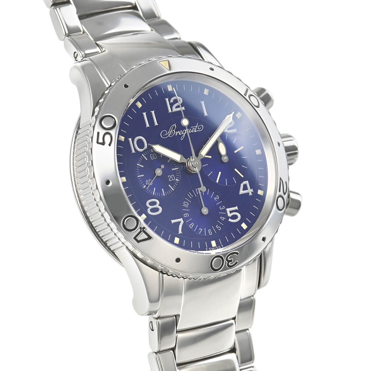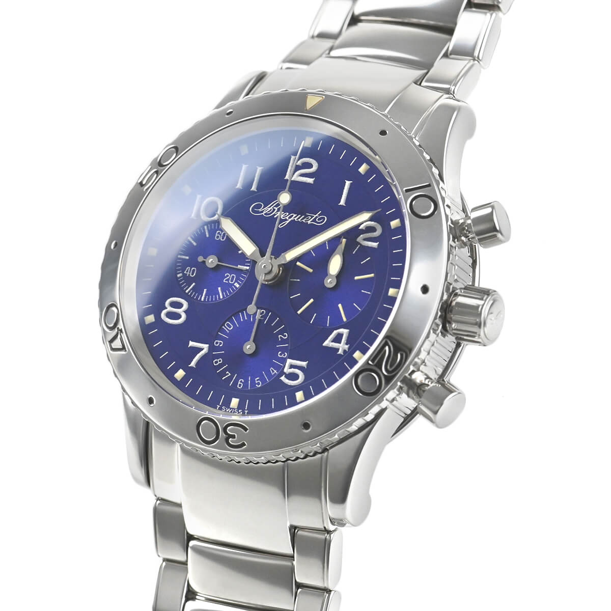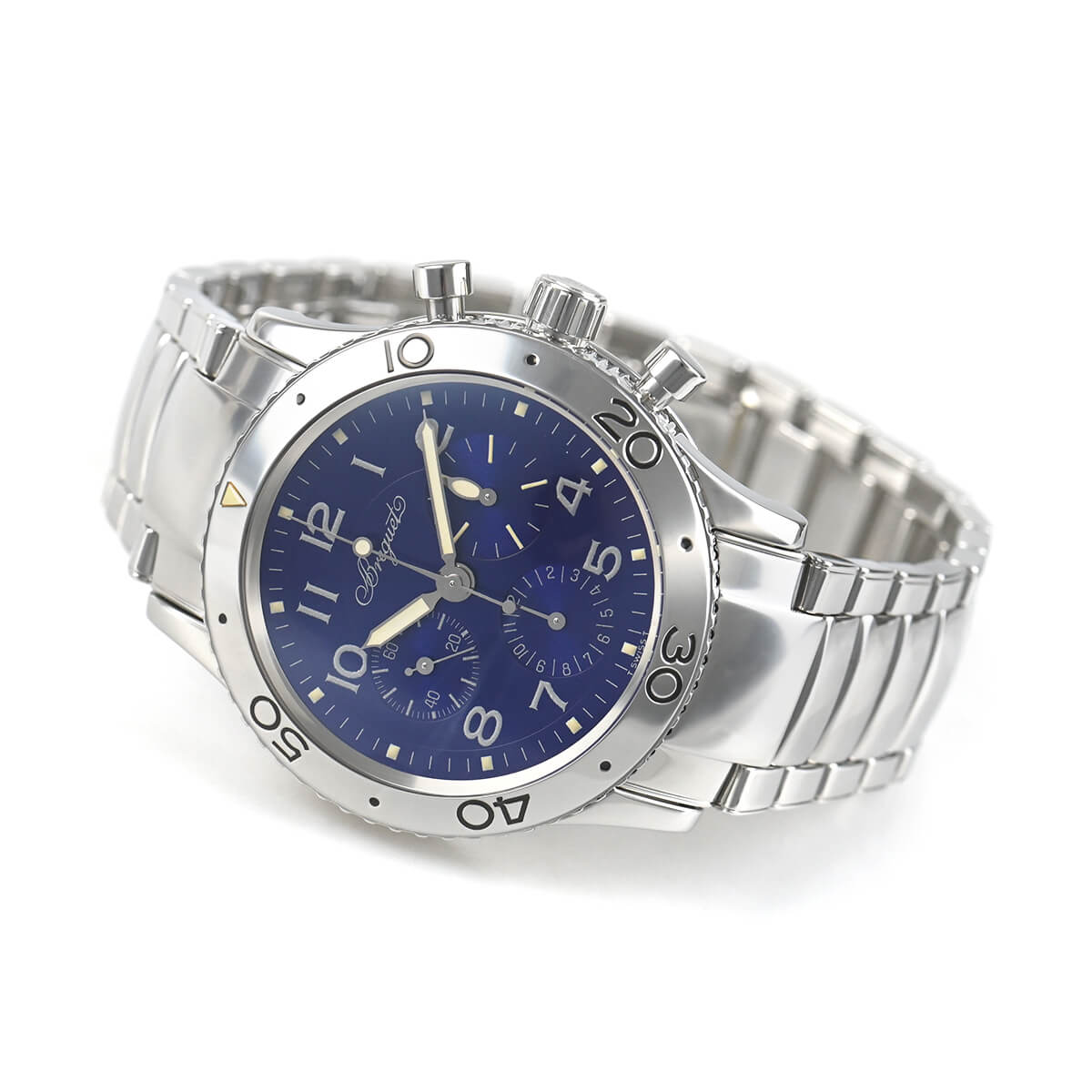 ブレゲの人気モデル「アエロナバル」。オリジナルはフランス軍に納入された軍用パイロットウォッチですが、ブレゲ独自のコインエッジなどで上手く高級感も演出しています。