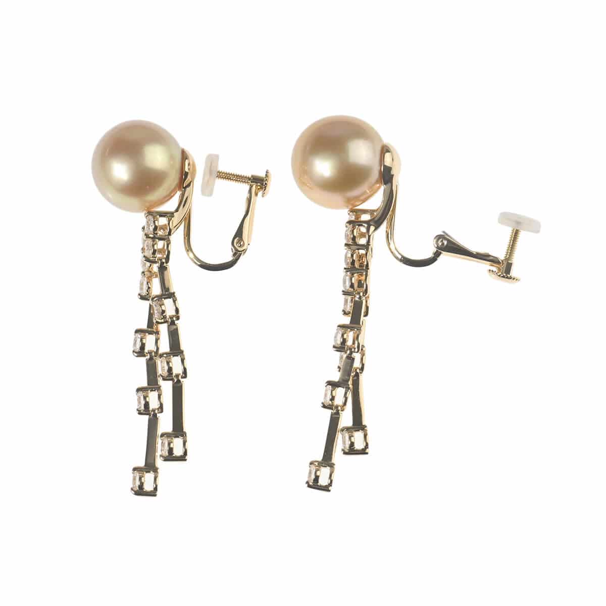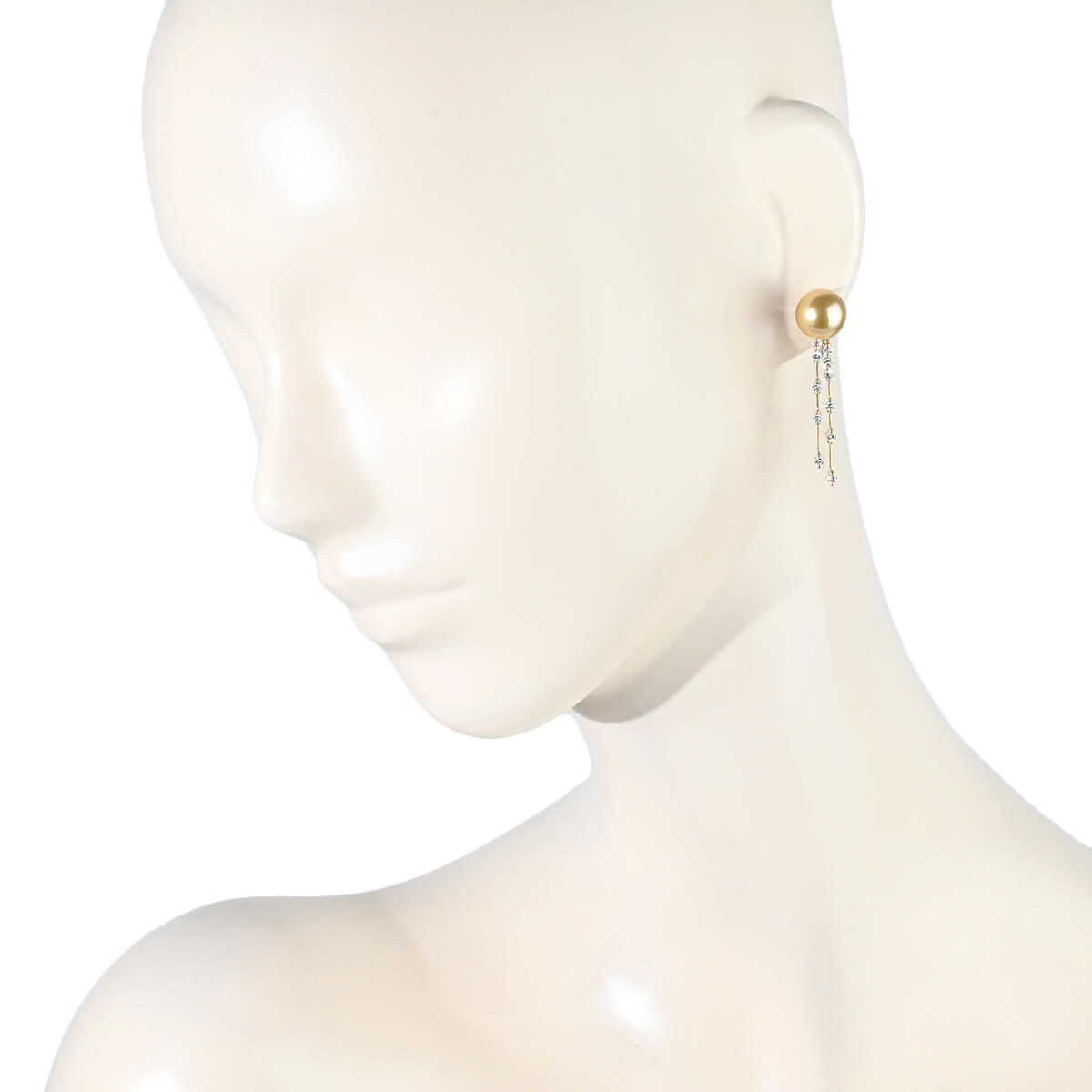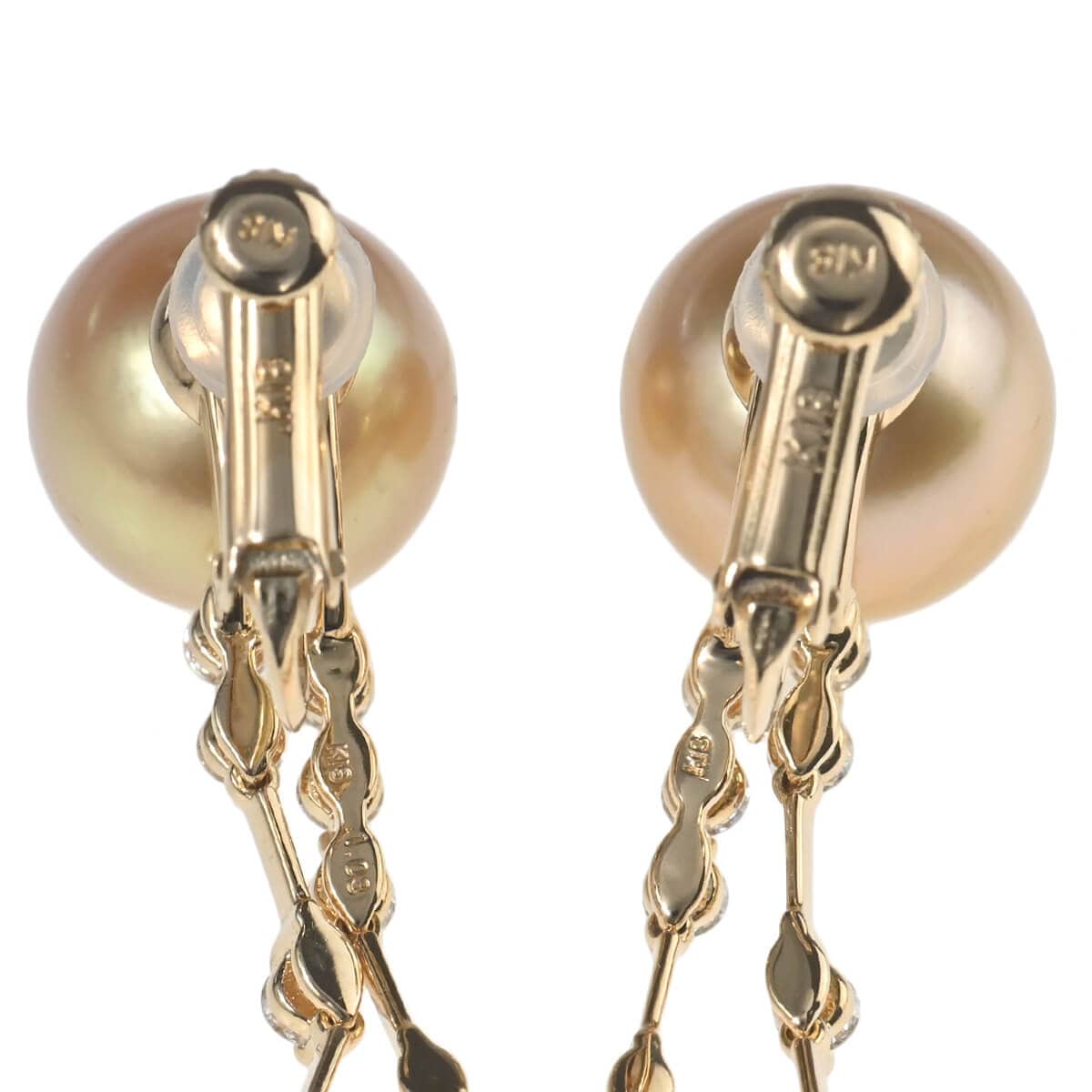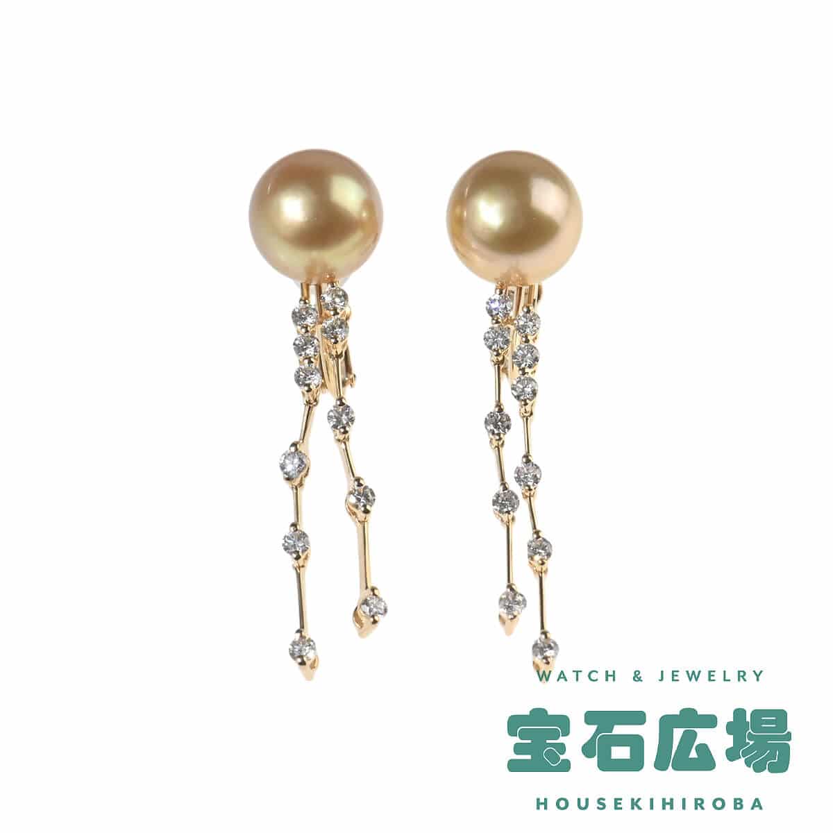 約11mmと大きなゴールデンパールから零れるようにセッティングされたダイヤモンドが、月時雨のように美しく繊細に煌めくイエローゴールド製ドロップイヤリング。ゴージャスな存在感を醸しつつ優しく輝くゴールデンパールと、さりげない仕草でも揺れるダイヤモンドの煌めきが美しいコントラストでフェイスラインを彩ります。どんなスタイリングにも優美な品の良さを添えてくれる、上質なパールジュエリーです。