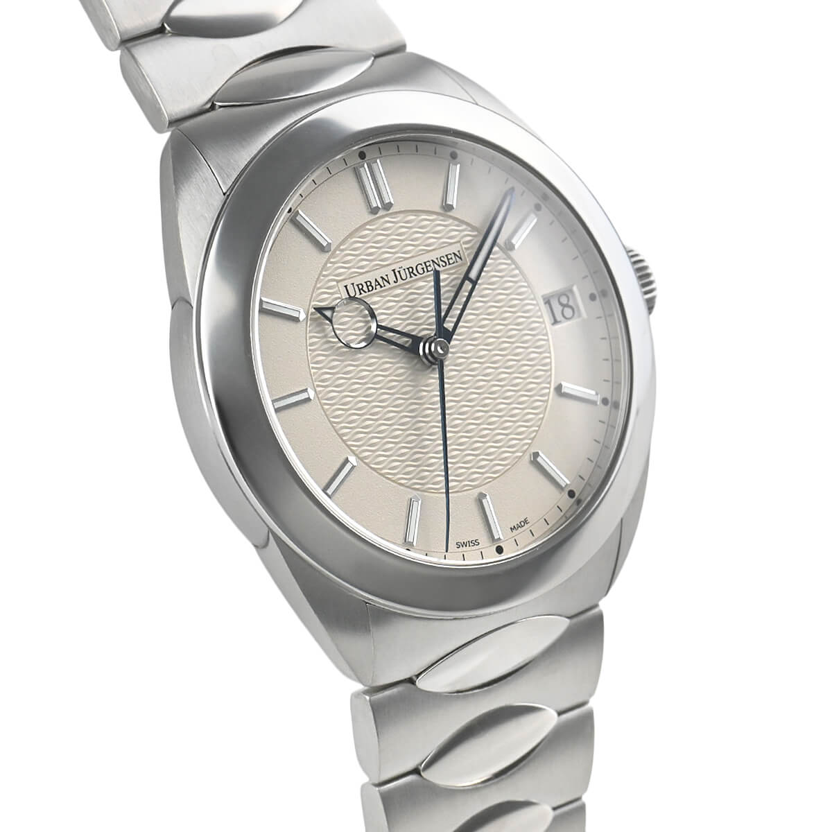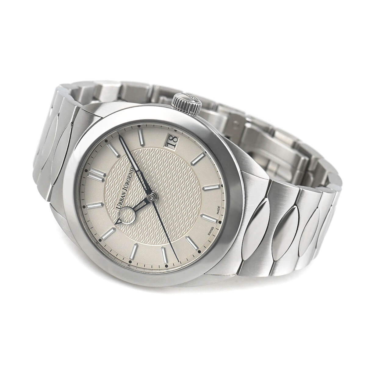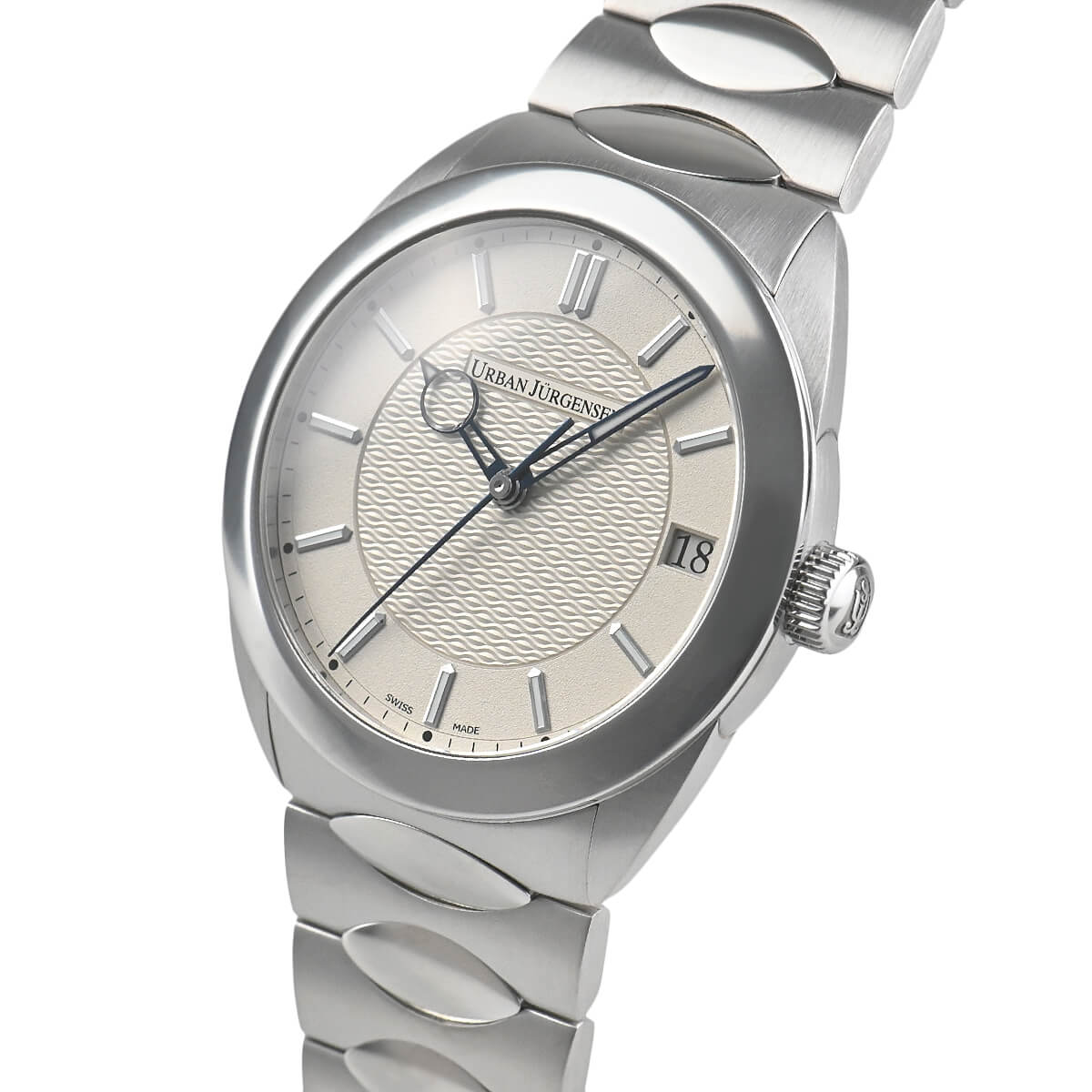 古典的なデザインを得意とするウルバン ヤーゲンセンが初めてスポーツウォッチにチャレンジした【ヤーゲンセンワン】。ケースやブレスのすべてに直線を使うことなく、美しい曲線を用いてデザインされています。