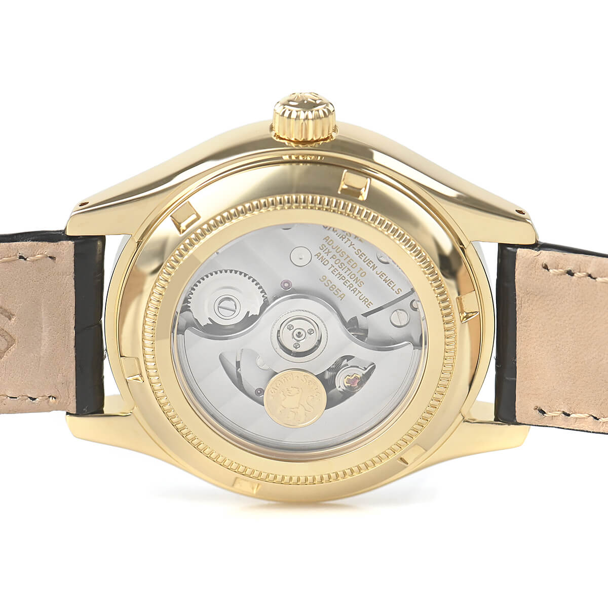 シースルーバック仕様の裏蓋から見ることができるムーブメントの回転錘には、18Kイエローゴールド製の「獅子の紋章」をあしらい、スペシャルモデルに相応しい外観に仕上げています。