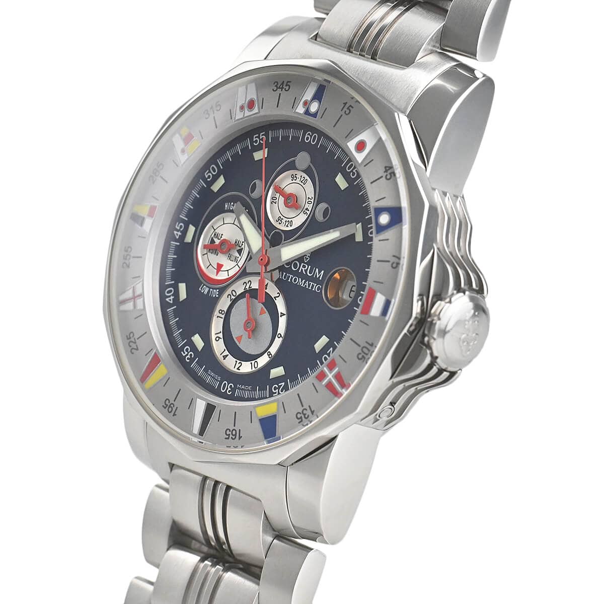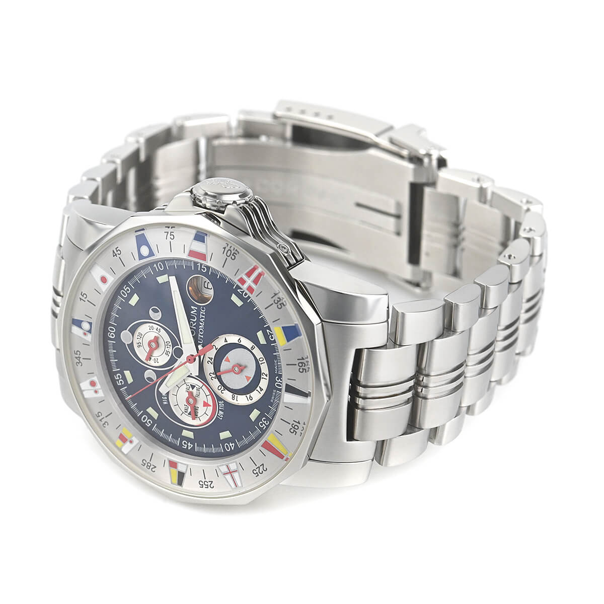 6時の位置に、24表示で満潮、干潮の時刻表示という特殊機能を搭載した「アドミラルズカップマレ」。12時の位置に、ムーンフェイズ、大潮、小潮の表示。