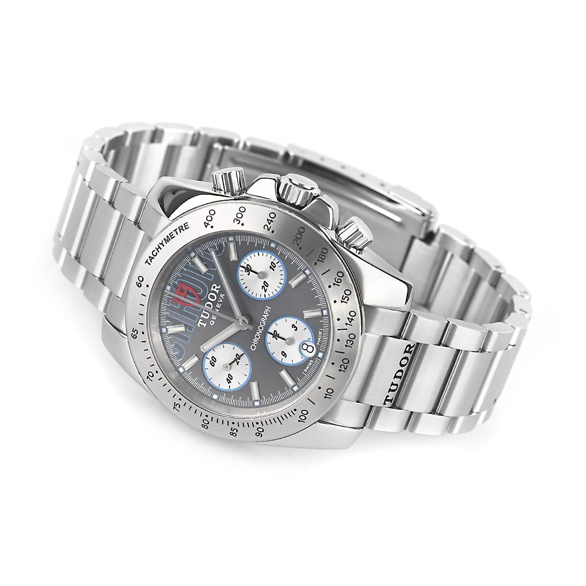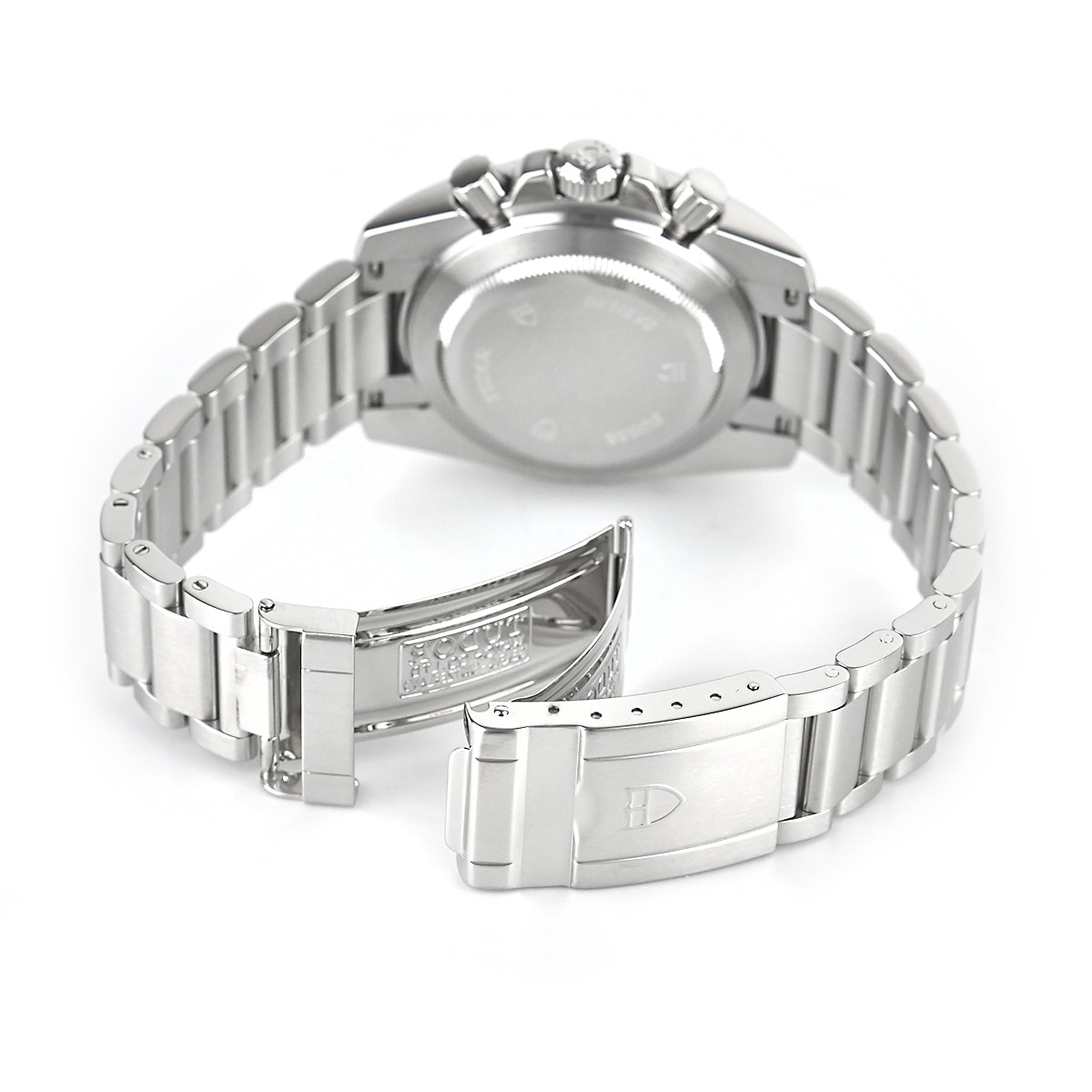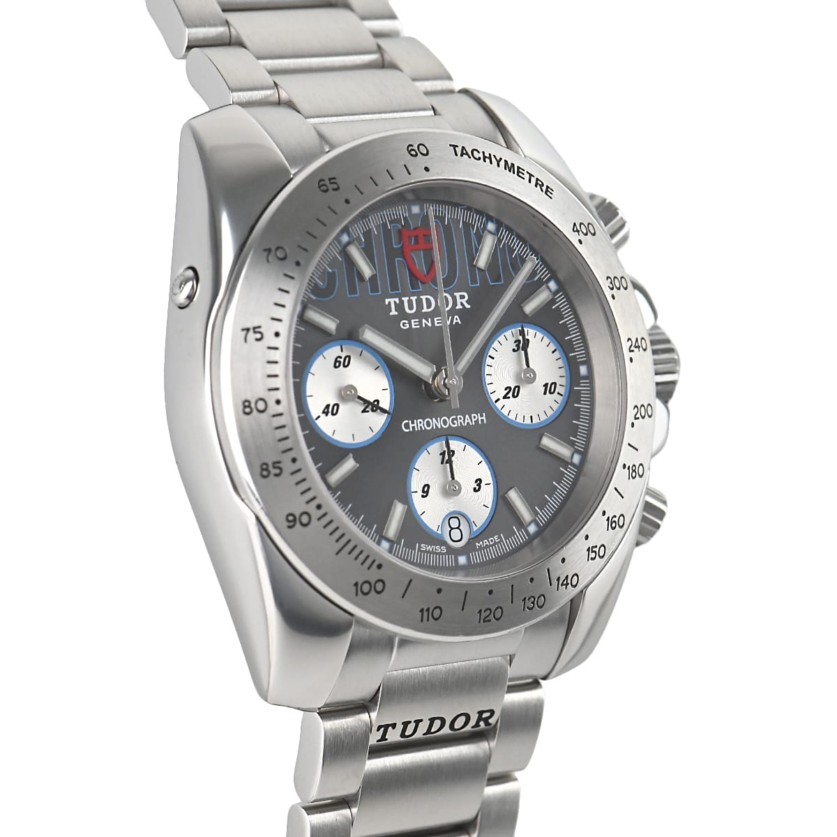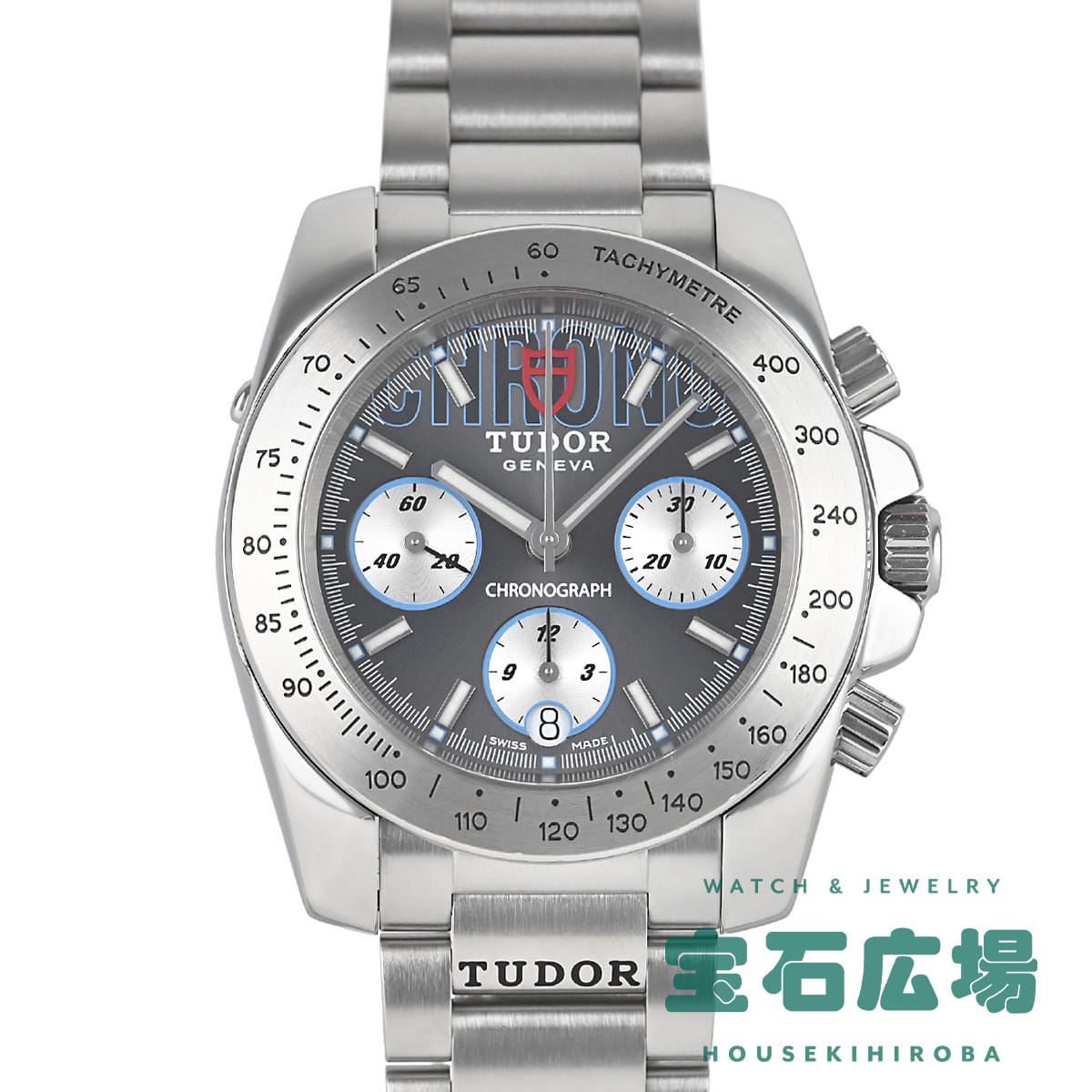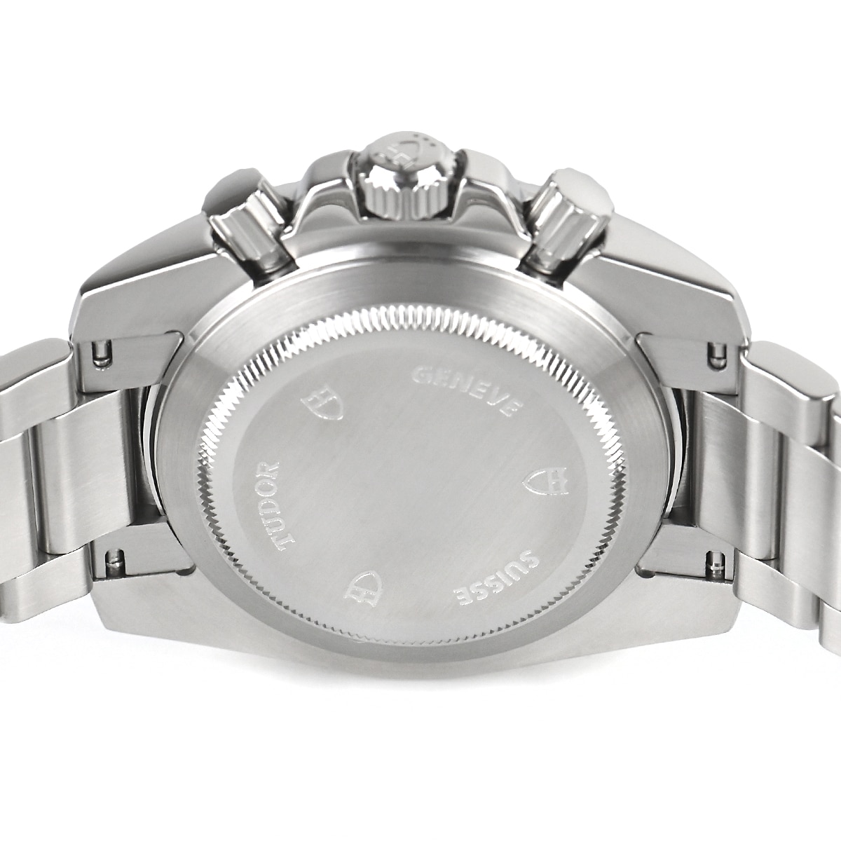 2007年に発表された日本未発売のチューダーのクロノグラフです。ダイヤルにCHRONOの文字があり、『盾』のロゴはダイヤルだけでなく、リューズや裏蓋にも刻印されています。