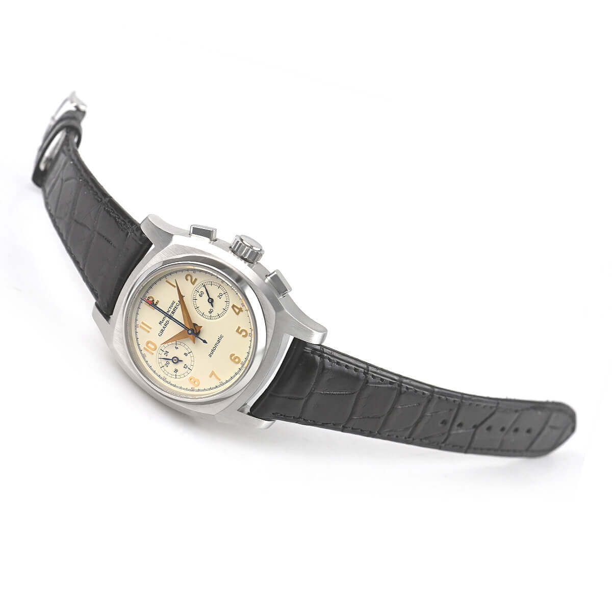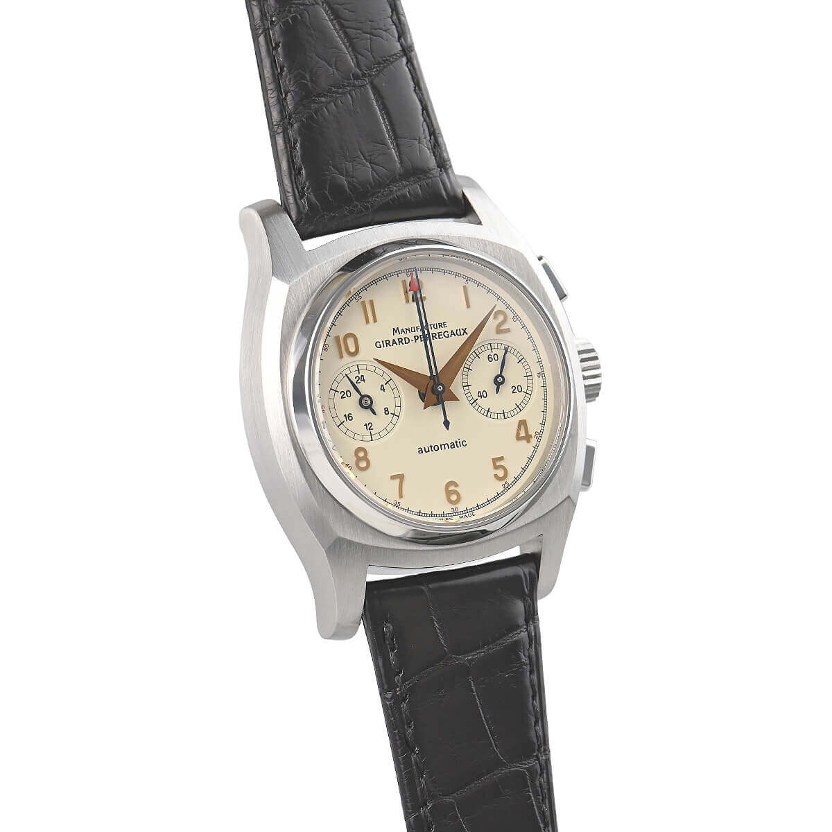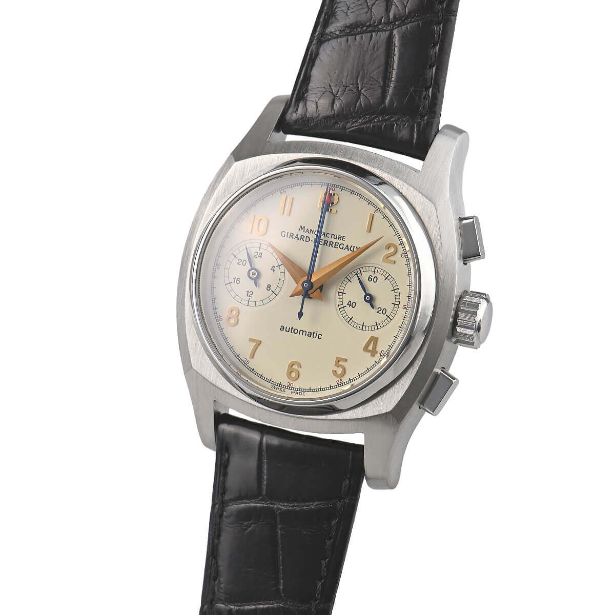 クッションケースが特徴の「ヴィンテージ1960 クロノ」が入荷しました。2つ目クロノのように見えますが、9時位置に24時間針、3時位置に秒針を配し、60分積算針はセンターに同軸で配置されます。