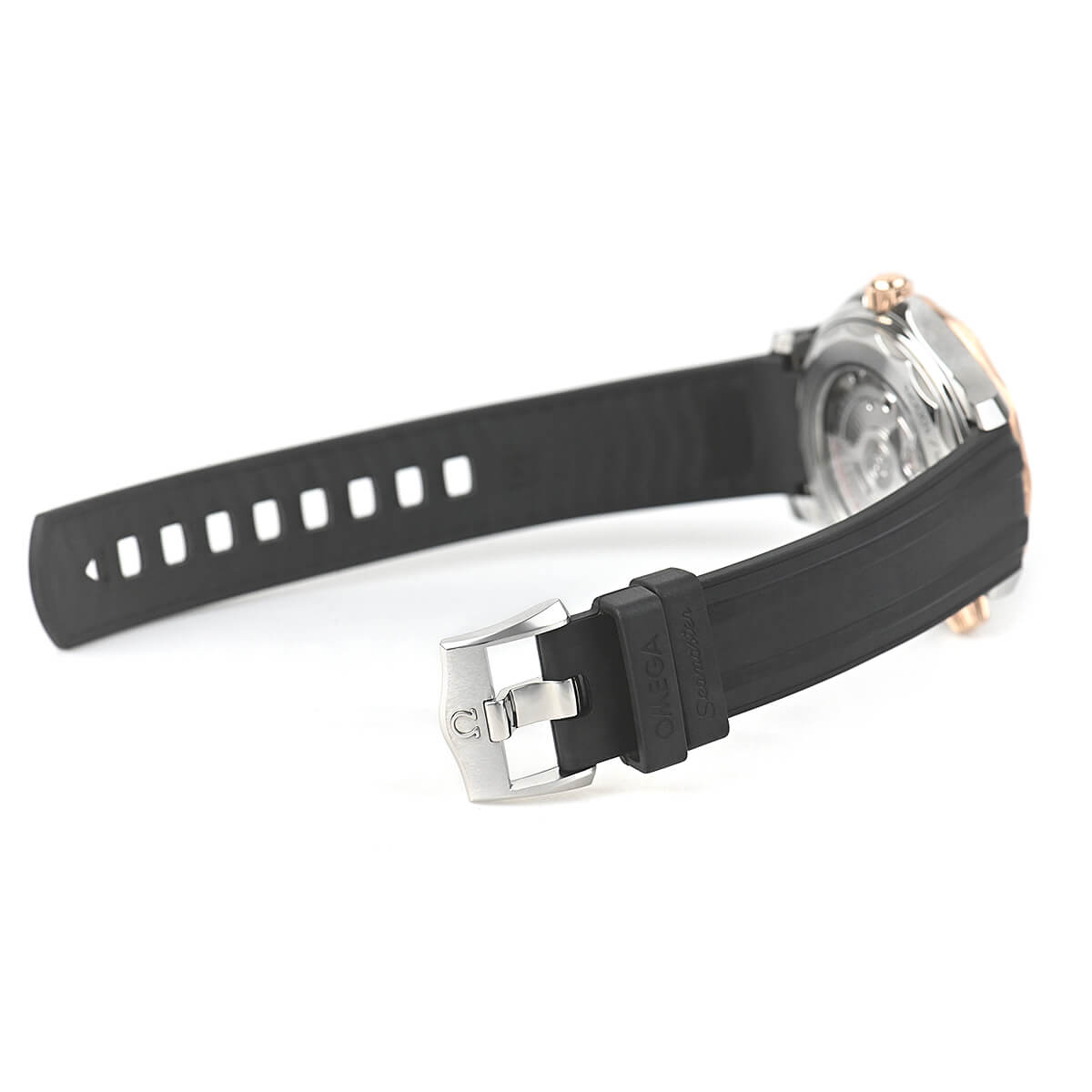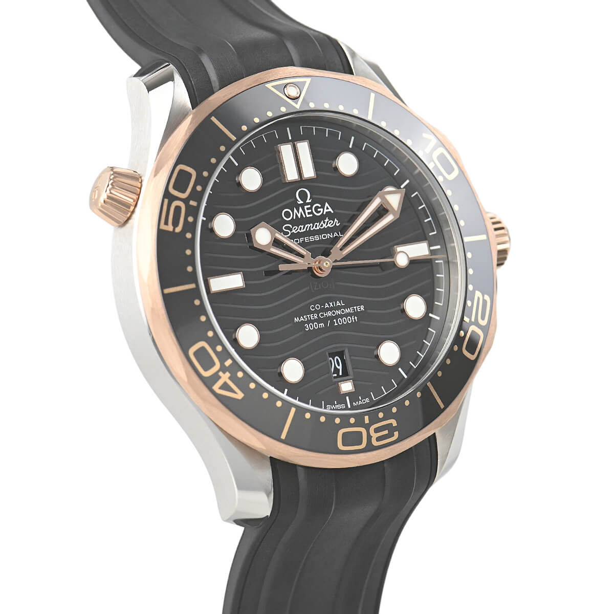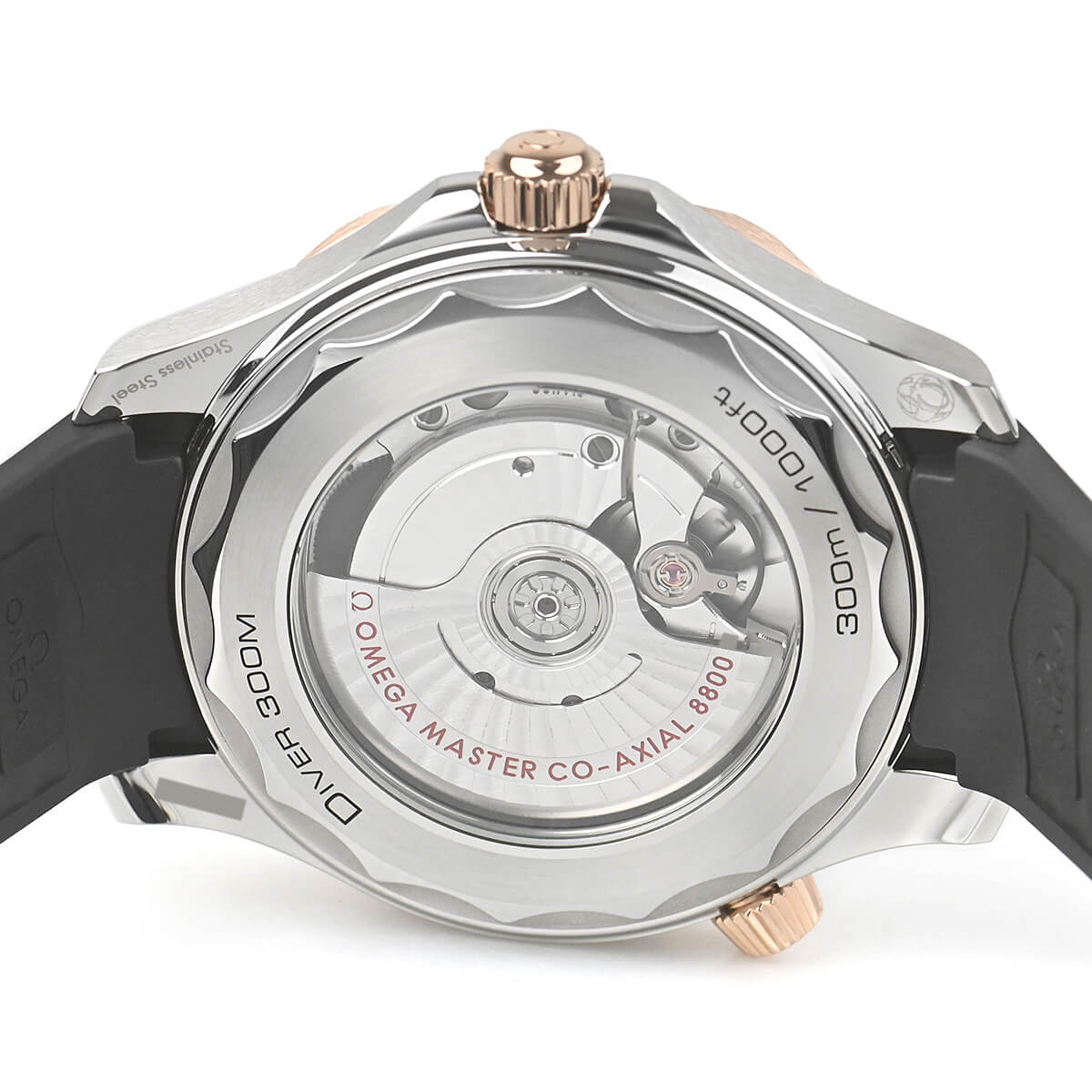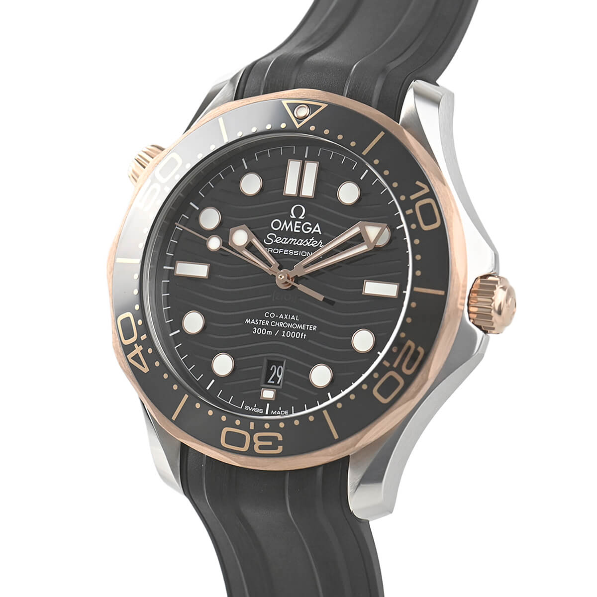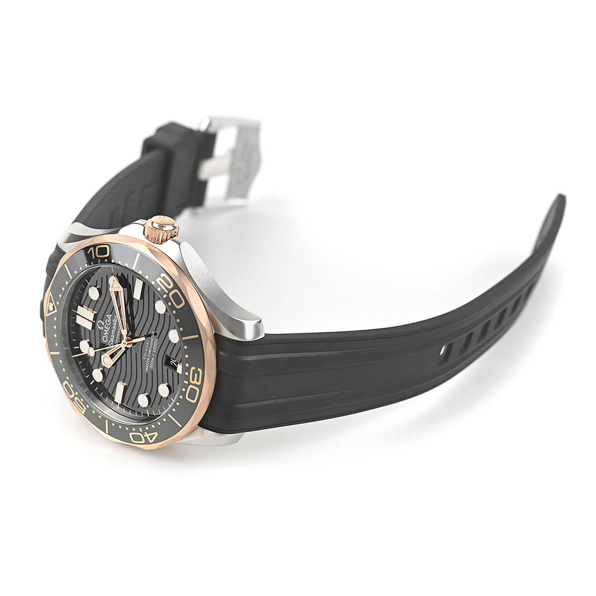 1993年に発表された【シーマスター ダイバー300M】が25周年を迎えた2018年にフルモデルチェンジを果たしました。こちらはケース径42mmのステンレス/セドナローズゴールドのコンビモデル。文字盤とダイビングベゼルには耐久性に優れたブルーセラミックを採用し、文字盤にはシーマスターの初代モデルにあったレーザー加工の波模様を復活させています。