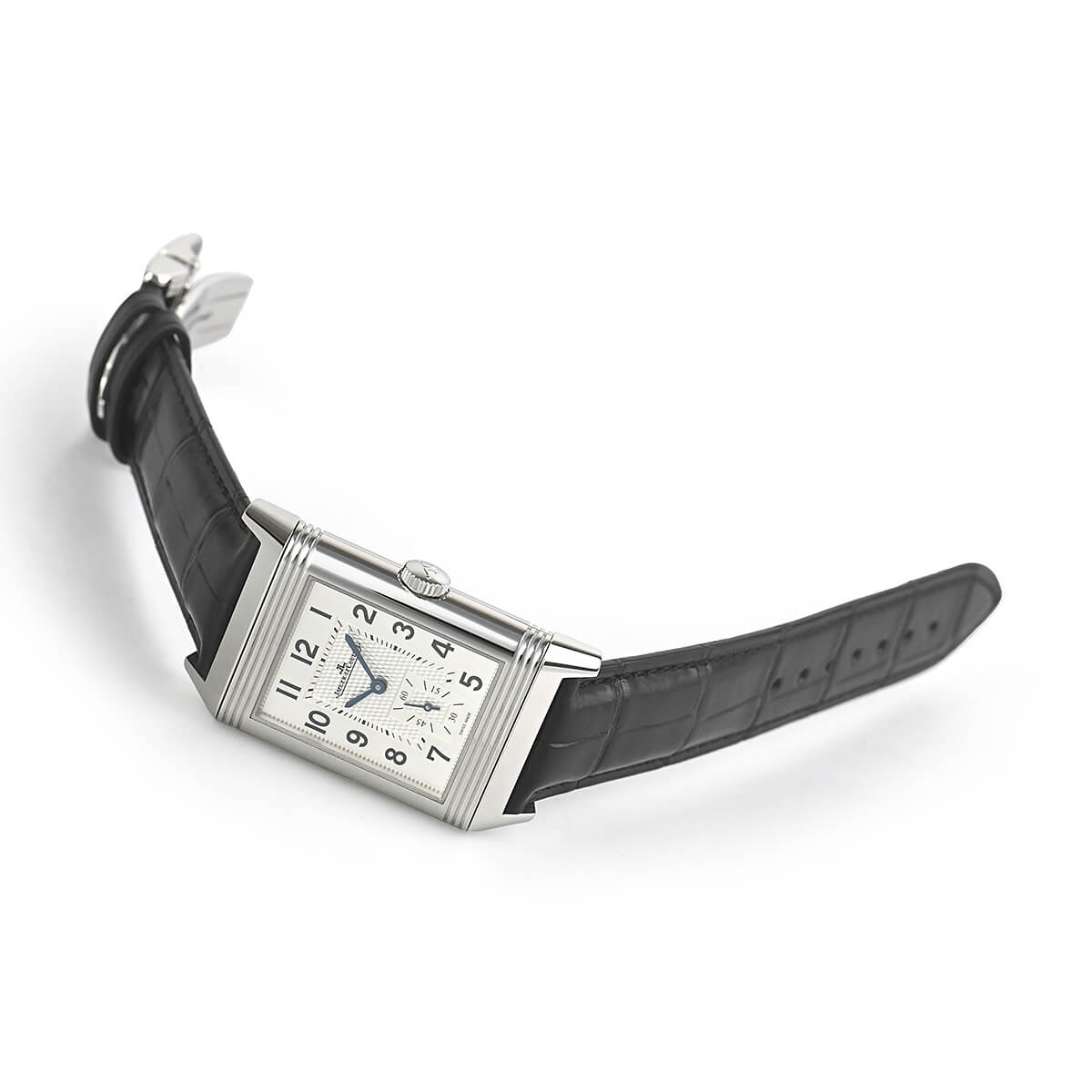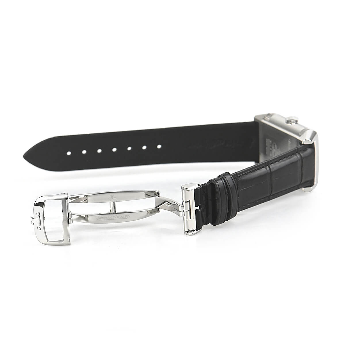こちらの「レベルソ・クラシック・ラージ・デュオ・スモールセコンド」は縦47mm×横28.3mmのケースに手巻き式のCal.854A/2を搭載し、シルバーダイアル側の6時位置はスモールセコンド、ブラックダイアル側の6時位置は24時間計となっており、第2時間帯のAM/PMが瞬時に判断出来るようになっています。