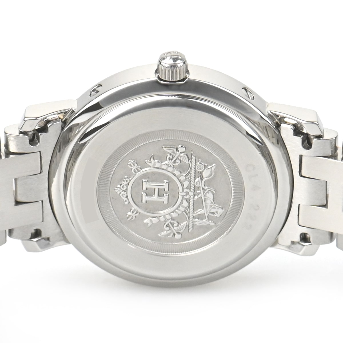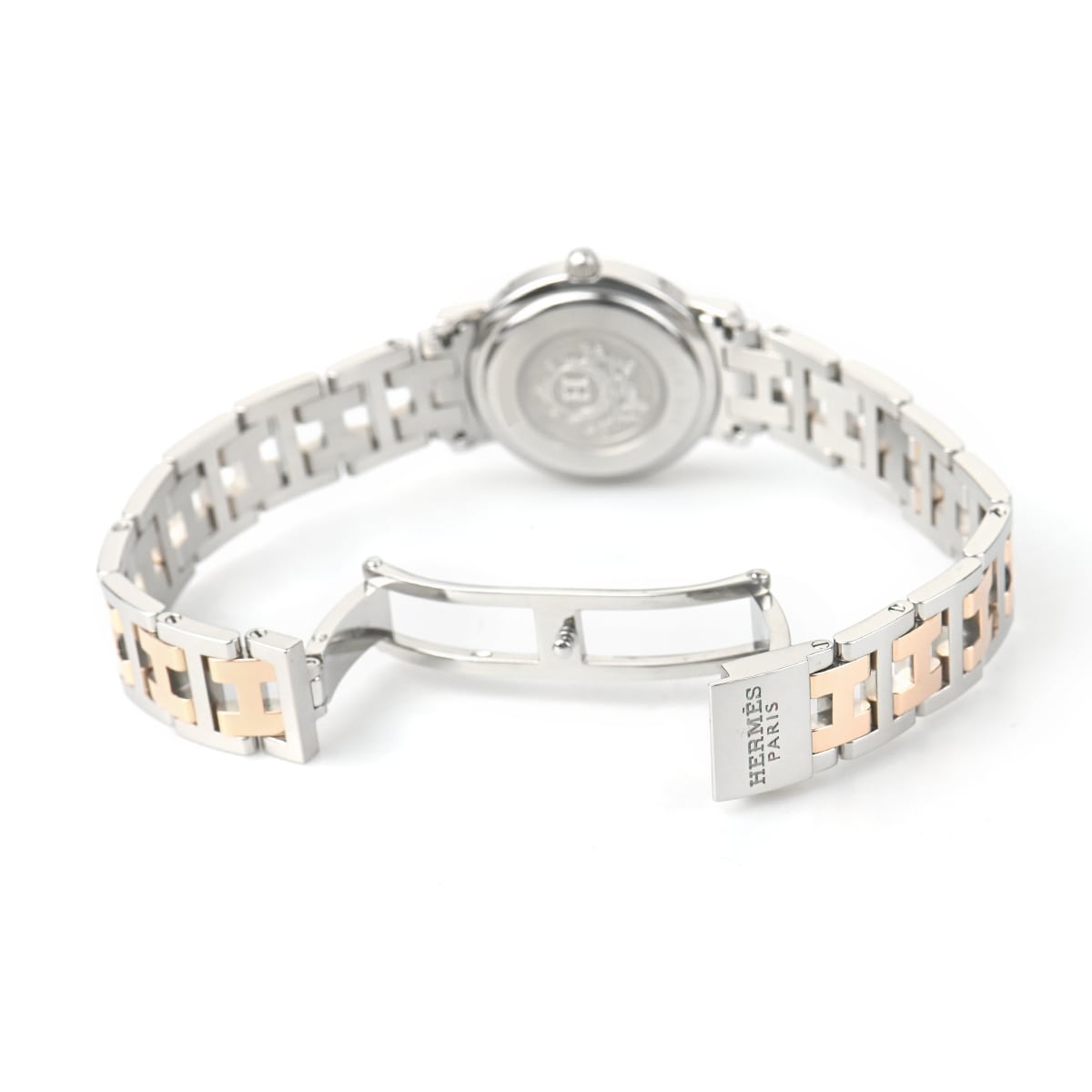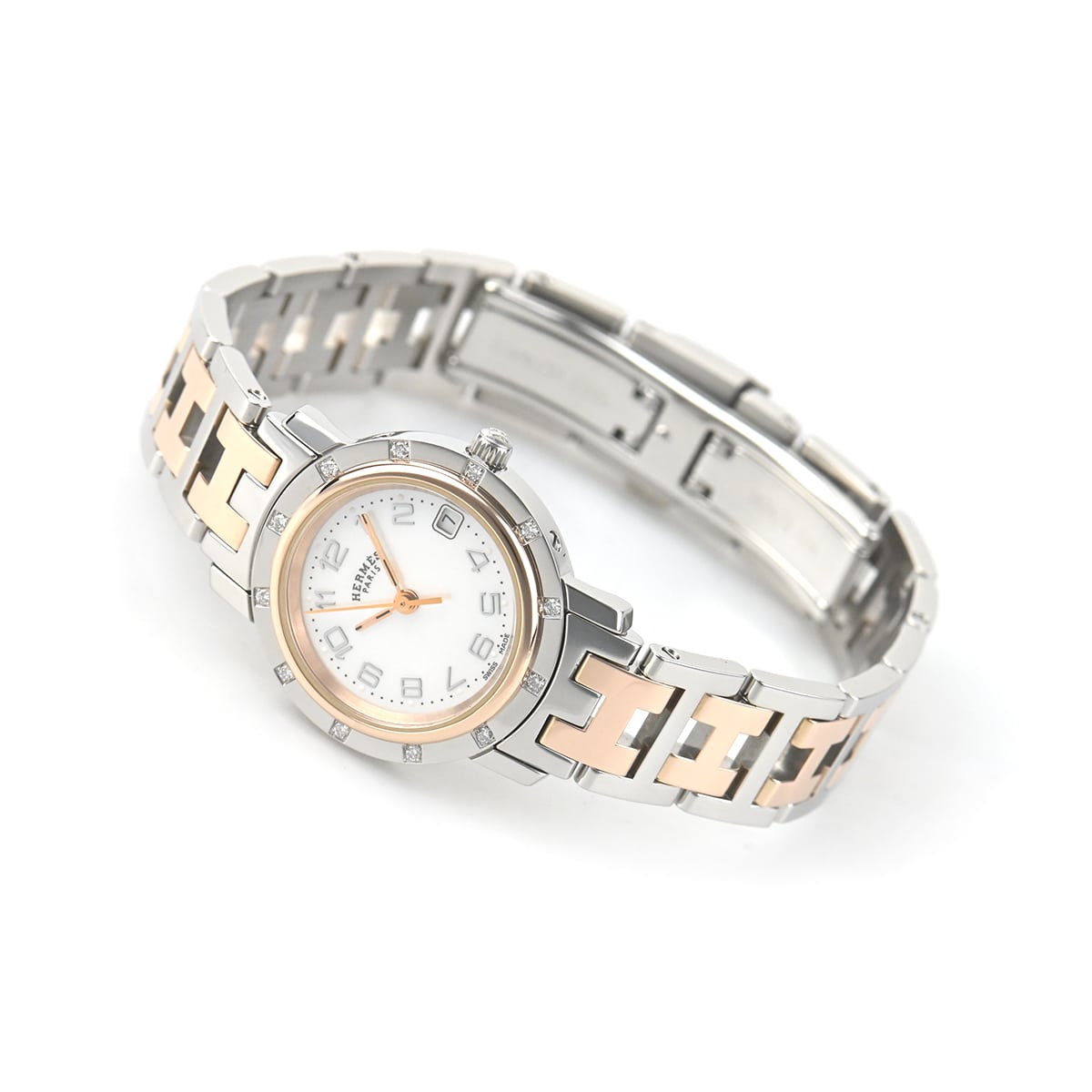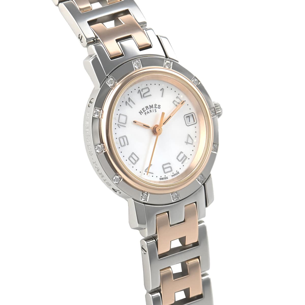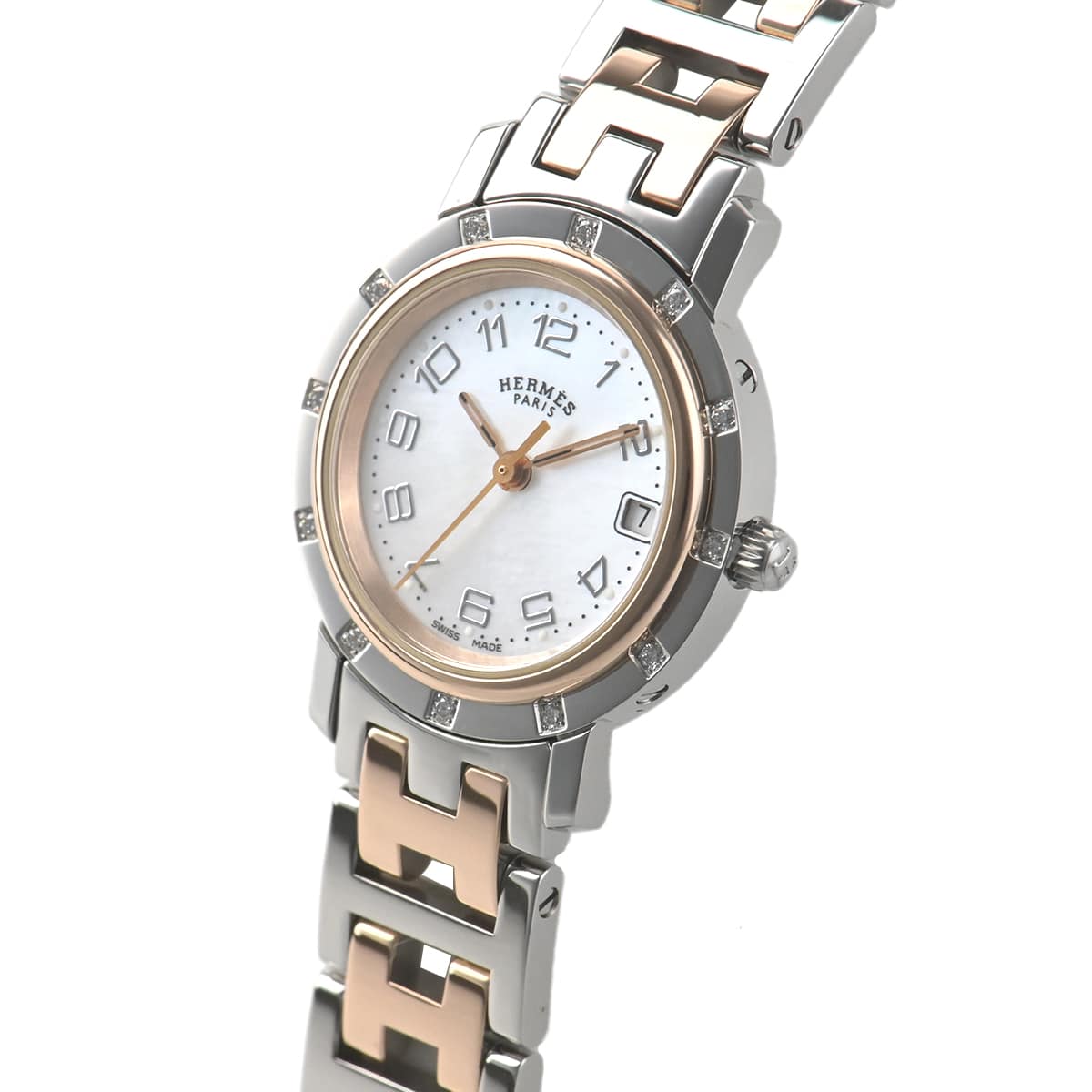 エルメスの定番モデル「クリッパー」。こちらは文字盤にピンクシェルを使用した華やかなモデルです。