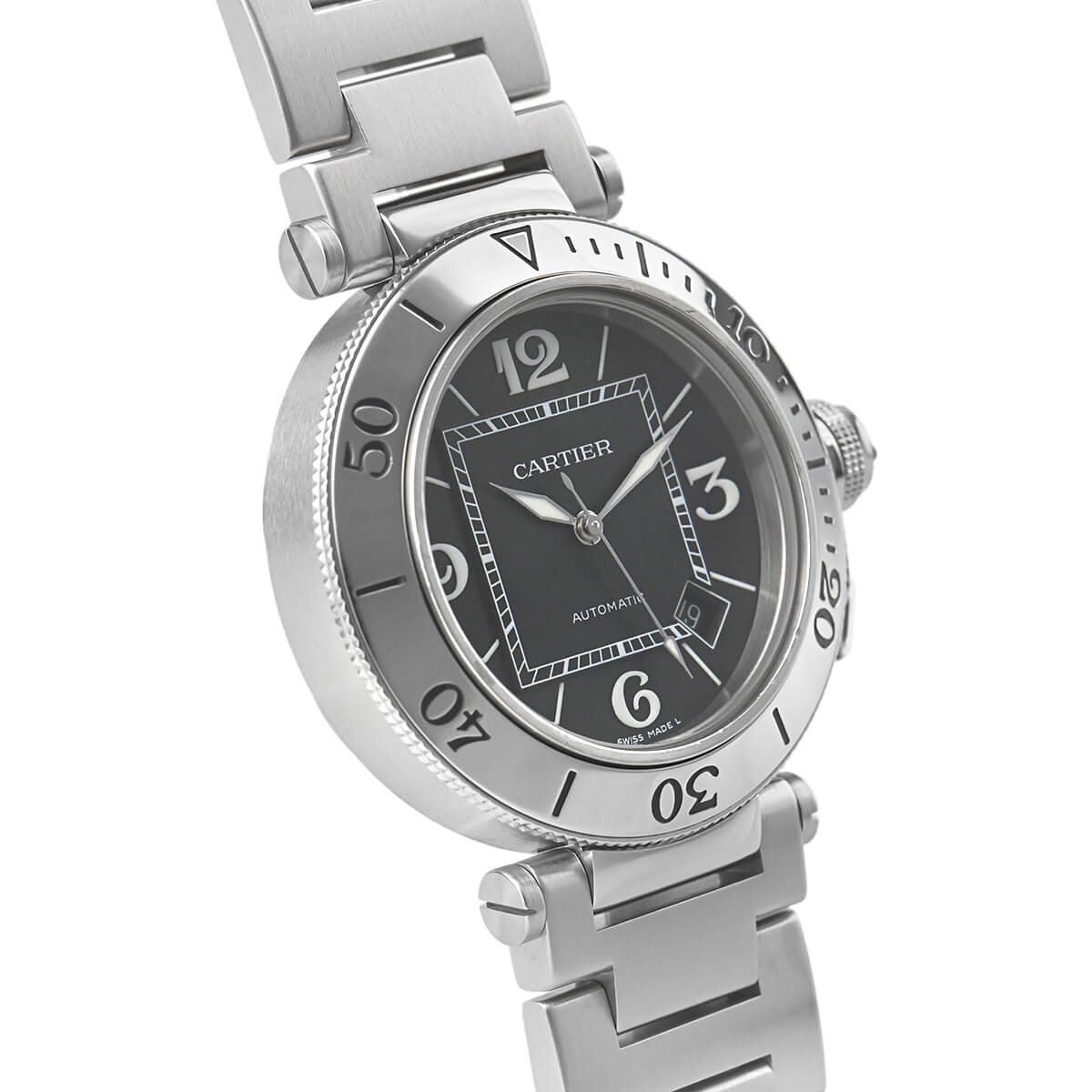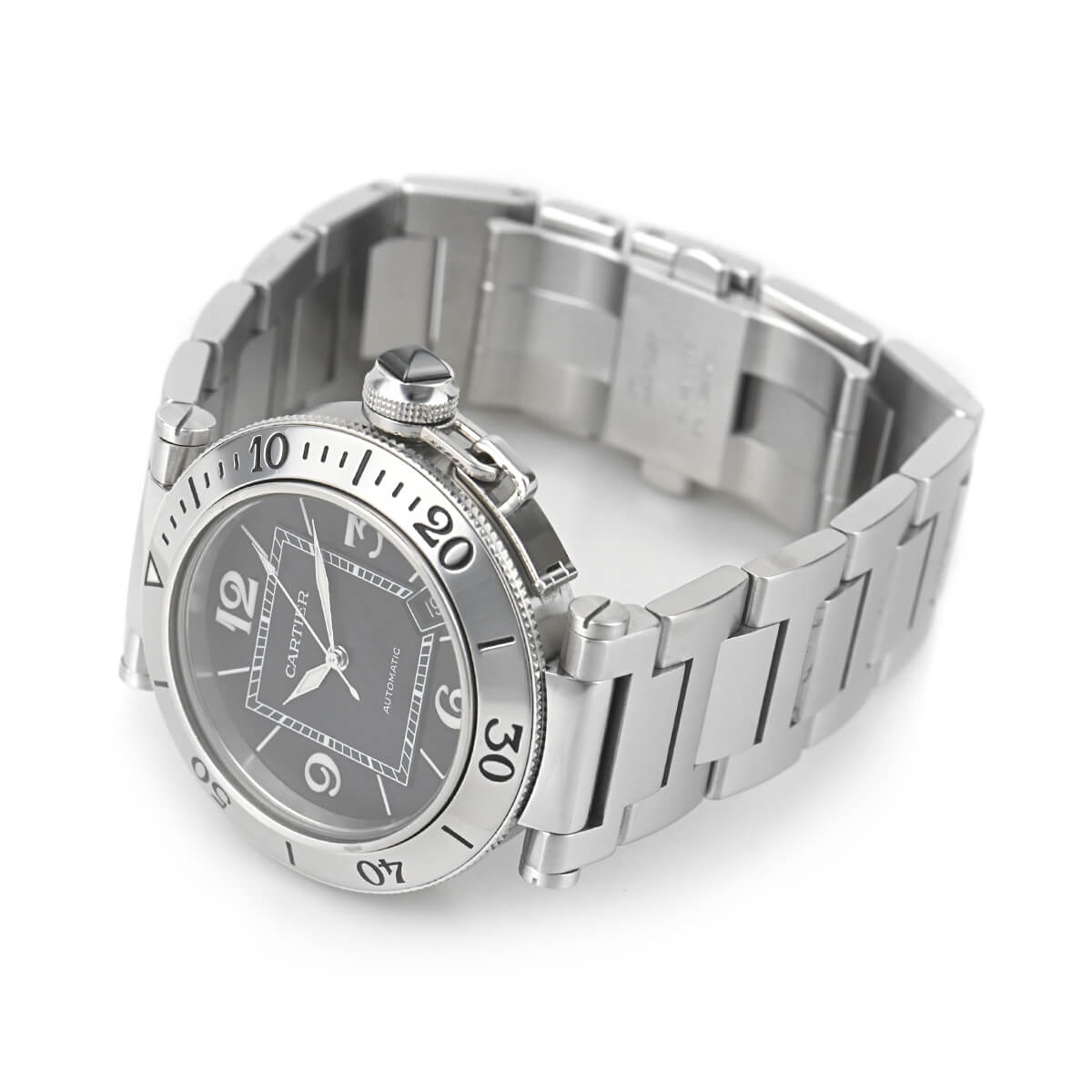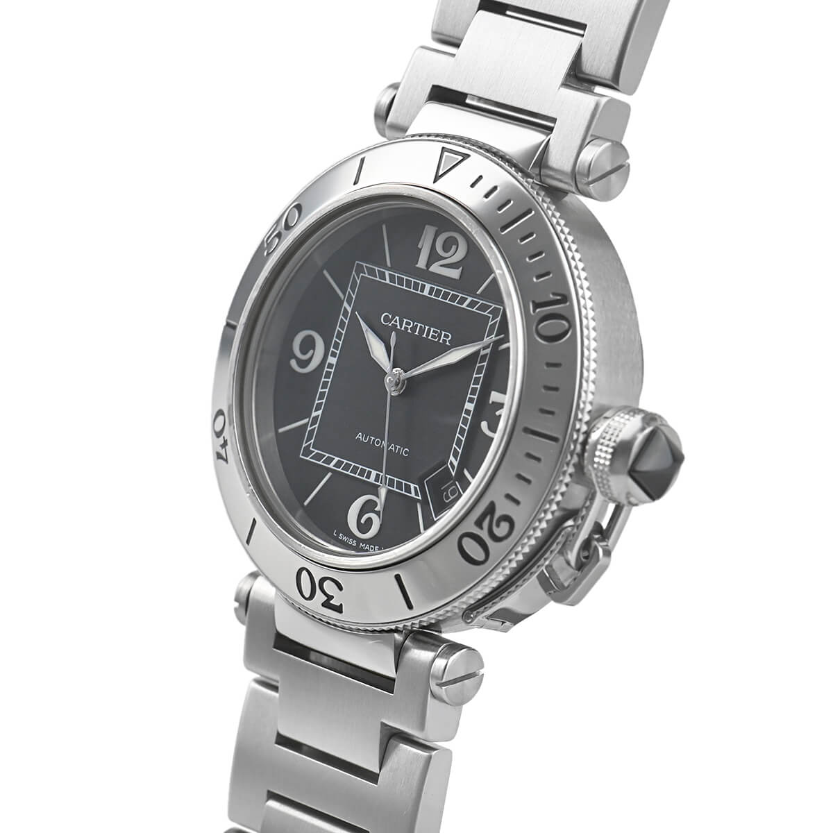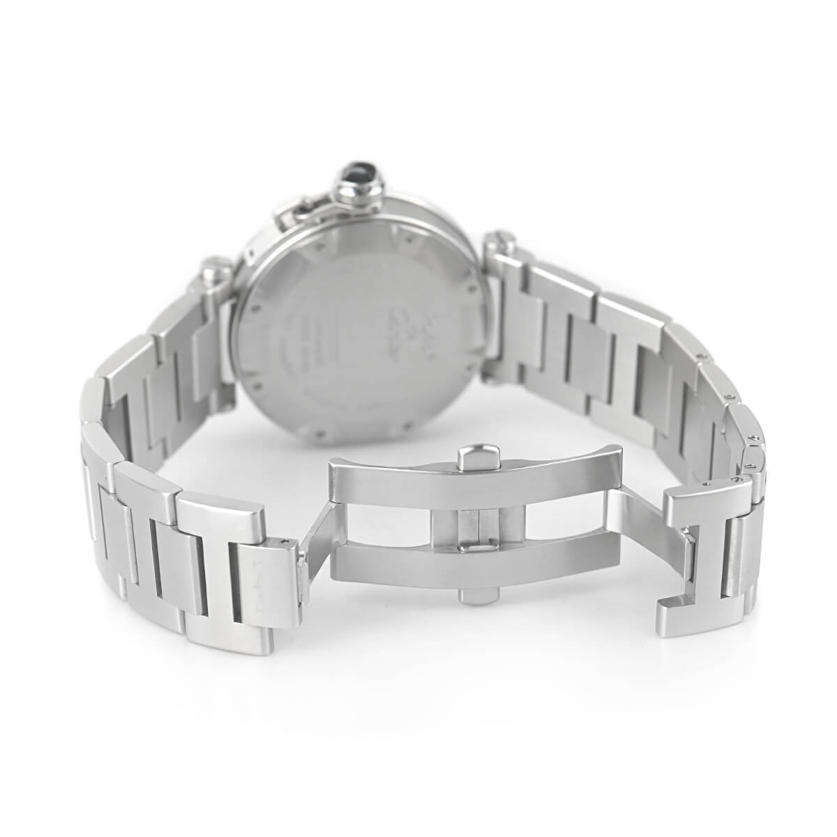 ケース径40.5mmのカルティエの「パシャ シータイマー」。カジュアルにも合わせやすく、使い勝手の良いブレスタイプです。