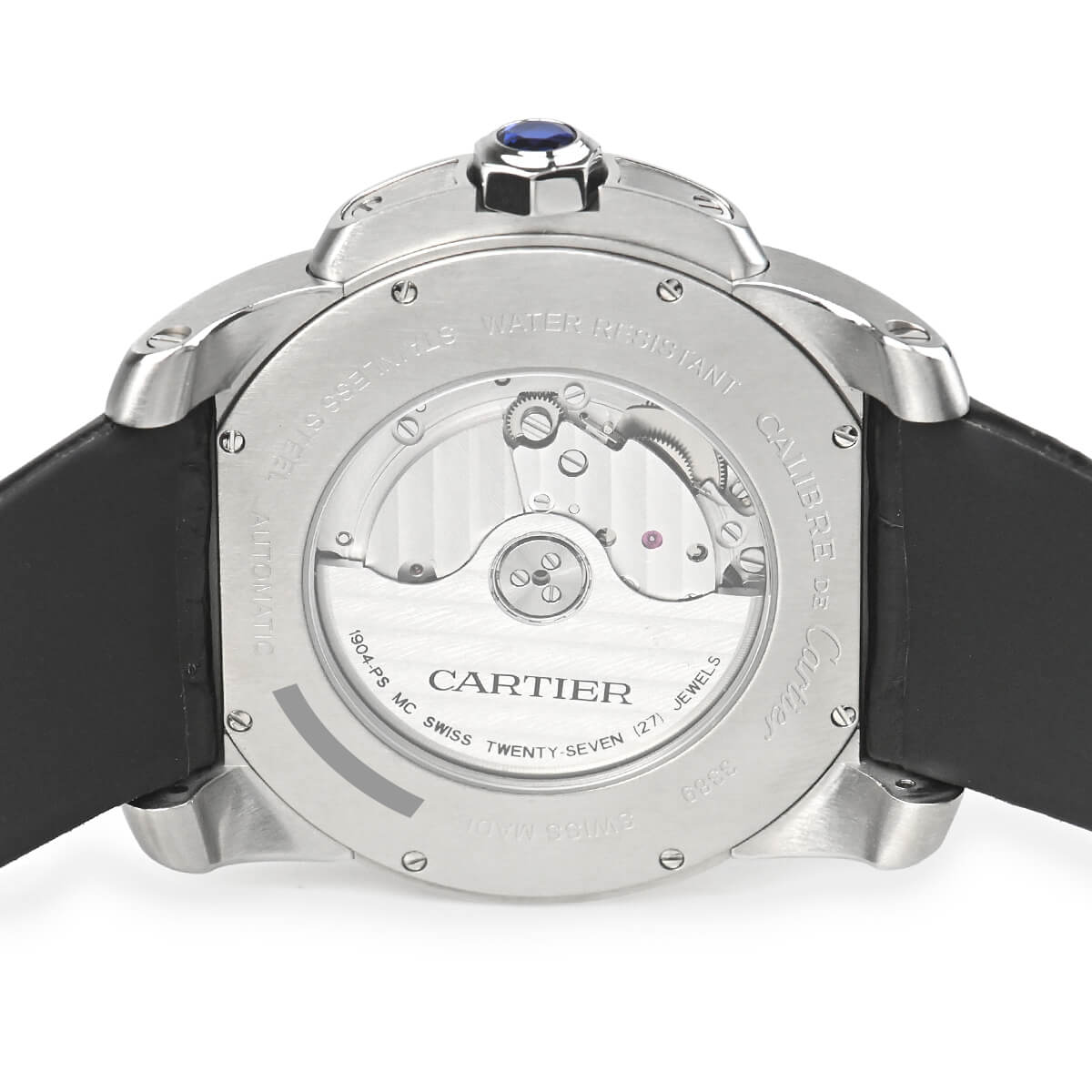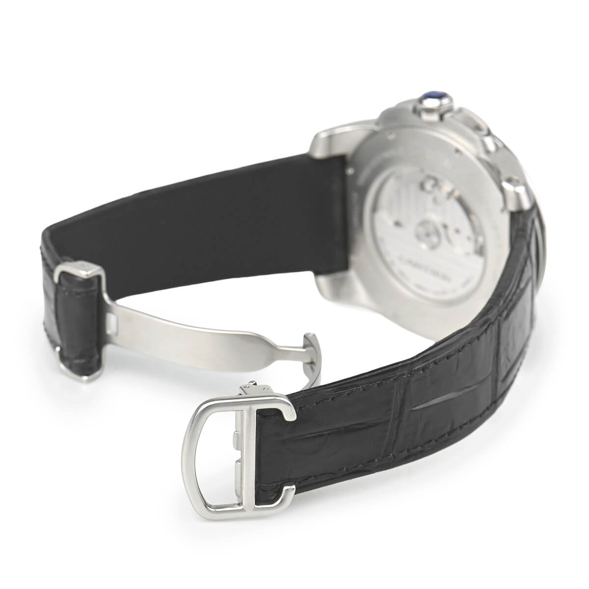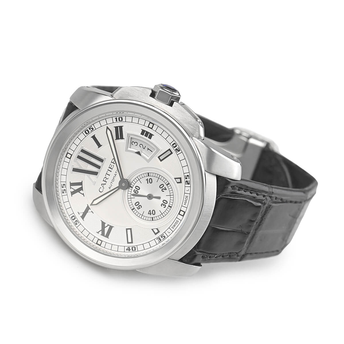 カルティエ初の“メンズ専用”コレクション「カリブル」。ラグとリューズガードの存在感が男性用コレクションらしい力強さを感じさせます。搭載するキャリバーは自社にて開発し製造も行っており、「カリブル」という名称はここから由来したものです。