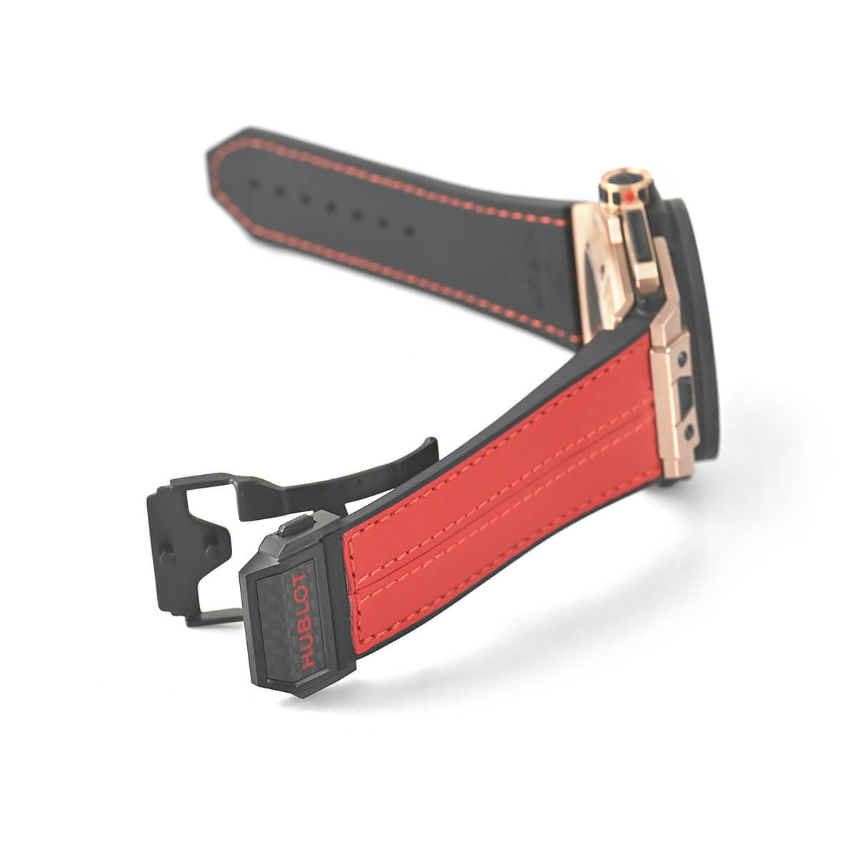 ウブロならではのキングゴールドケースに合わせられるストラップは、イタリアの老舗皮革ブランド、スケドーニ社のレザーにラバーを縫合したもの。