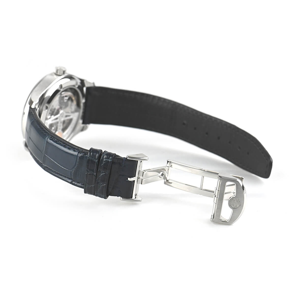 時分針とアプライドインデックスには綺麗なブルースチールを採用し、シンプルでありながらも機械式時計が持つ美しさが感じられる一本です。