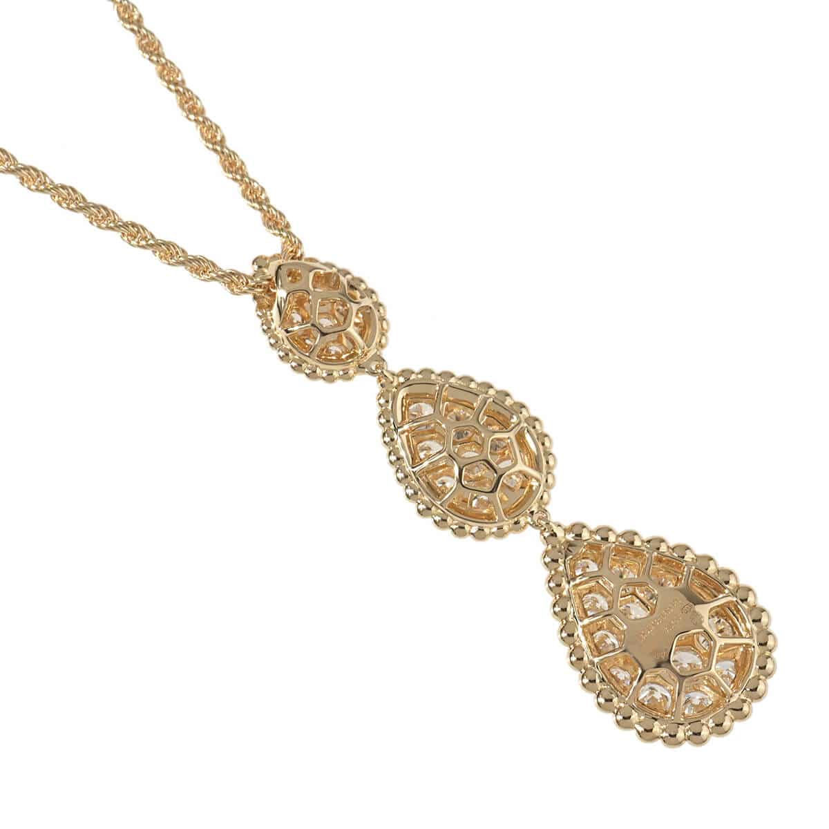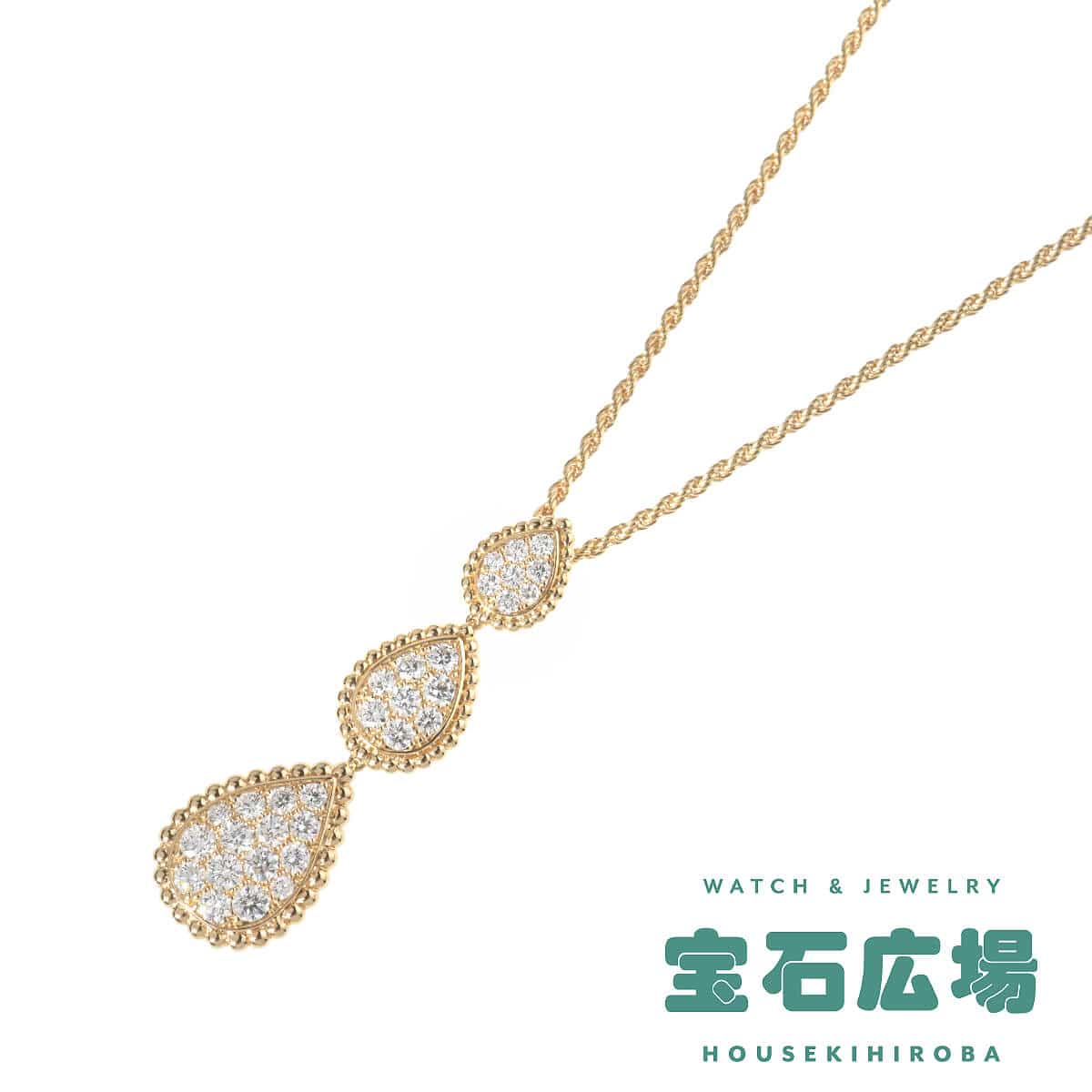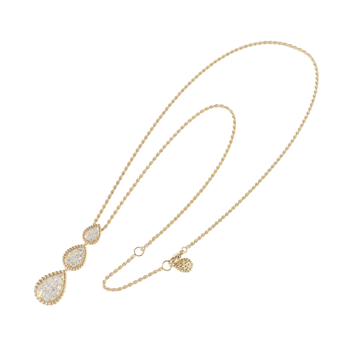 『BOUCHERON(ブシュロン)』のアーカイブにも多くみられるメゾンのアイコンのひとつ、守り神の象徴であり不死のシンボルでもあるスネークが、よりモダンになって蘇った「セルパンボエム」コレクション。ブシュロンが誇る職人の技とサヴォワールフェール(ノウハウ)が見事に表現されたコレクションです。縦に連なる3つのドロップモチーフが、デコルテをセンシュアルに包み込むイエローゴールド製ペンダントネックレス。眩いばかりにきらめくパヴェダイヤモンドと華やかなゴールドマテリアルが輝くコントラストを魅せる、自由にスタイルを表現することを叶えるハイジュエリーです。