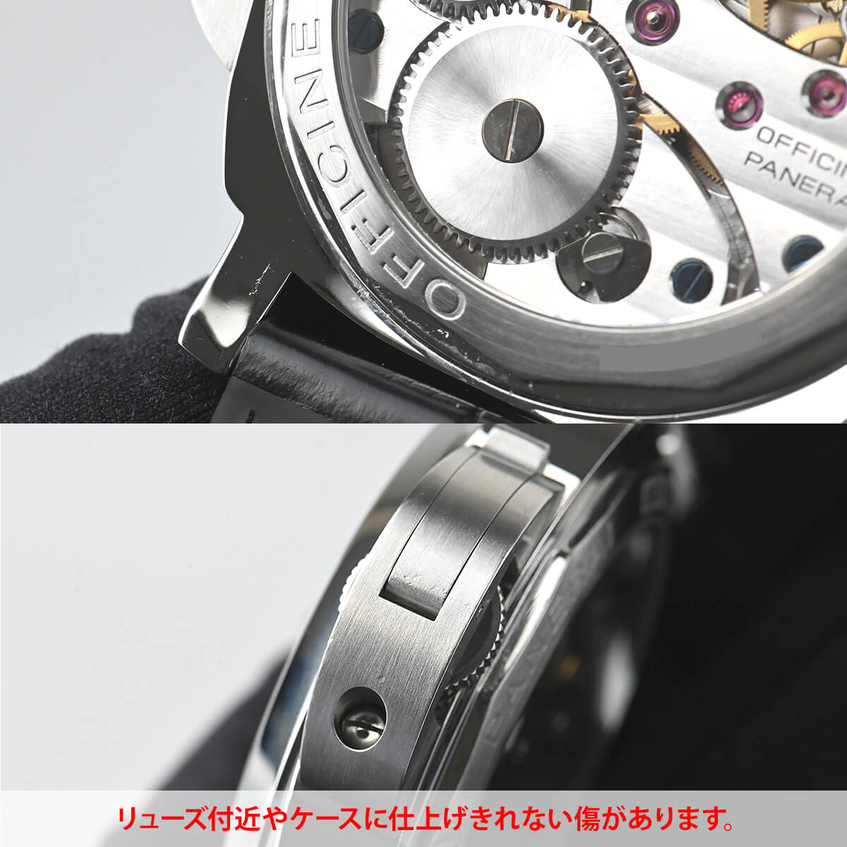 ガラス面に傷やコーディング傷が多数あり、リューズ付近やケースに仕上げきれない傷があります。