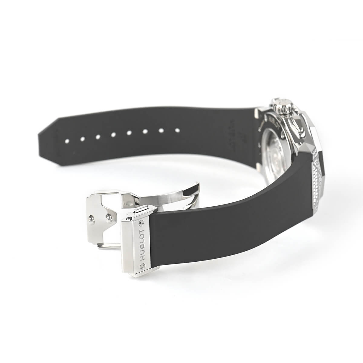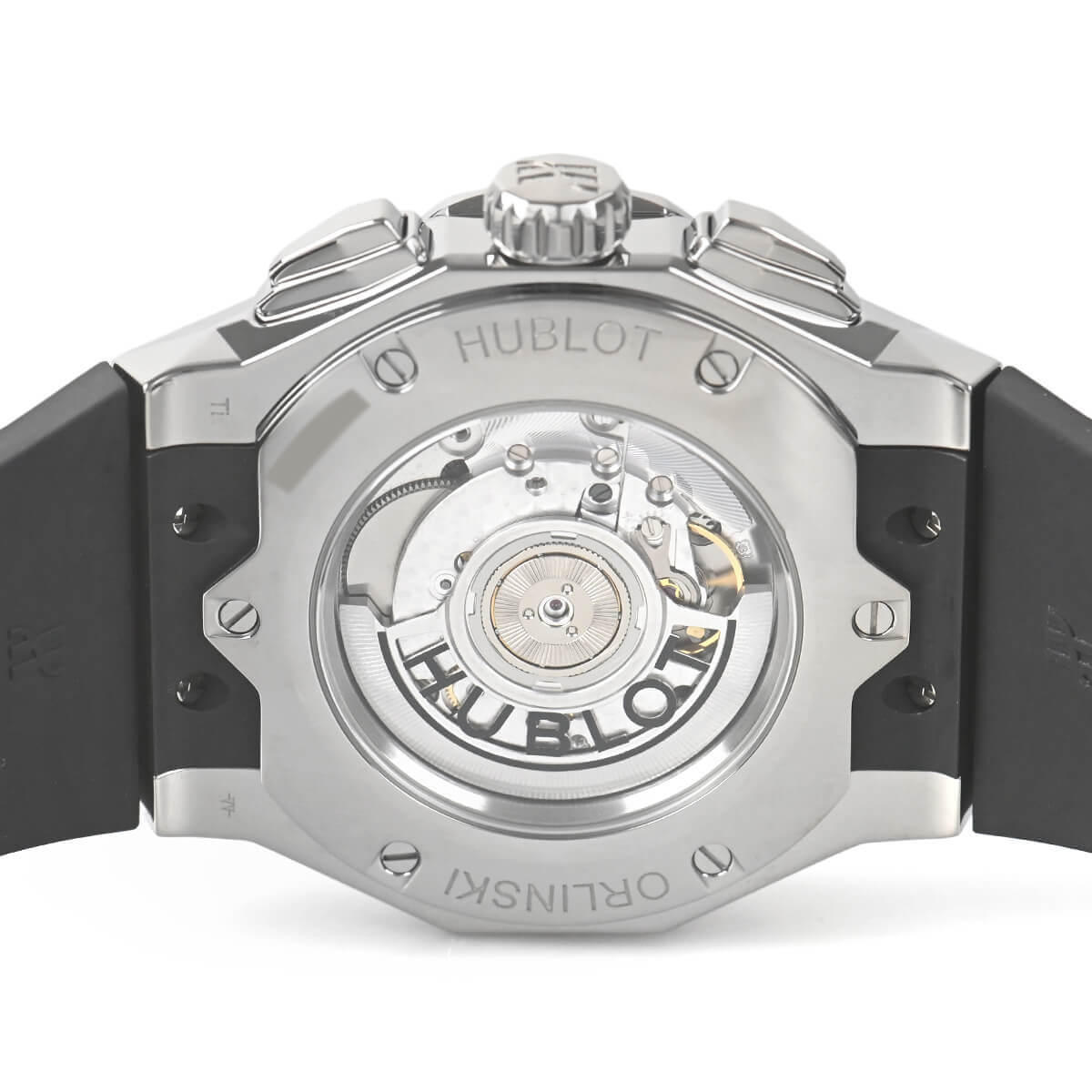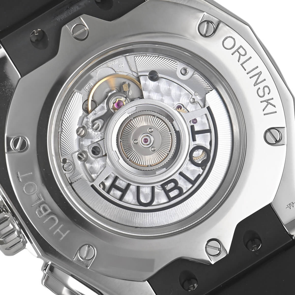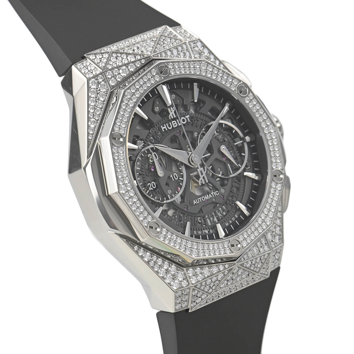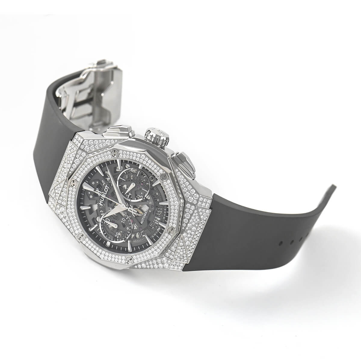 革新的な素材を使い時計製造をおこなうウブロと、フランス人現代アーティストの奇才、リチャード・オーリンスキー氏がコラボレートして生まれたのがこの【アエロフュージョン クロノグラフ オーリンスキー】です。これまでのクラシックフュージョンとは異なり、12角形のベゼルやラグなど随所にダイヤモンドを彷彿させるファセットカットが施され、くさび型インデックスやドーフィンハンドにも多面カットが施され光を反射させます。