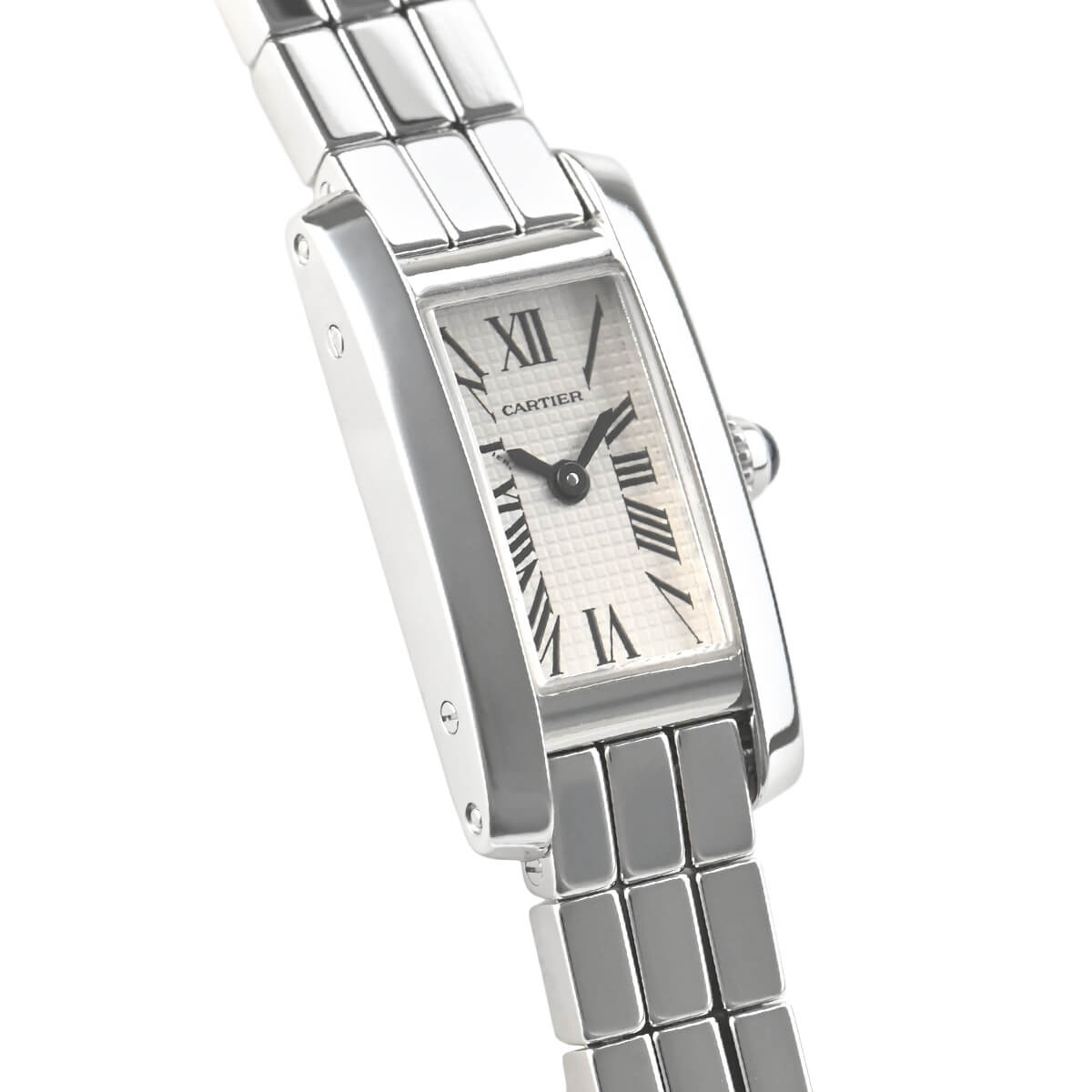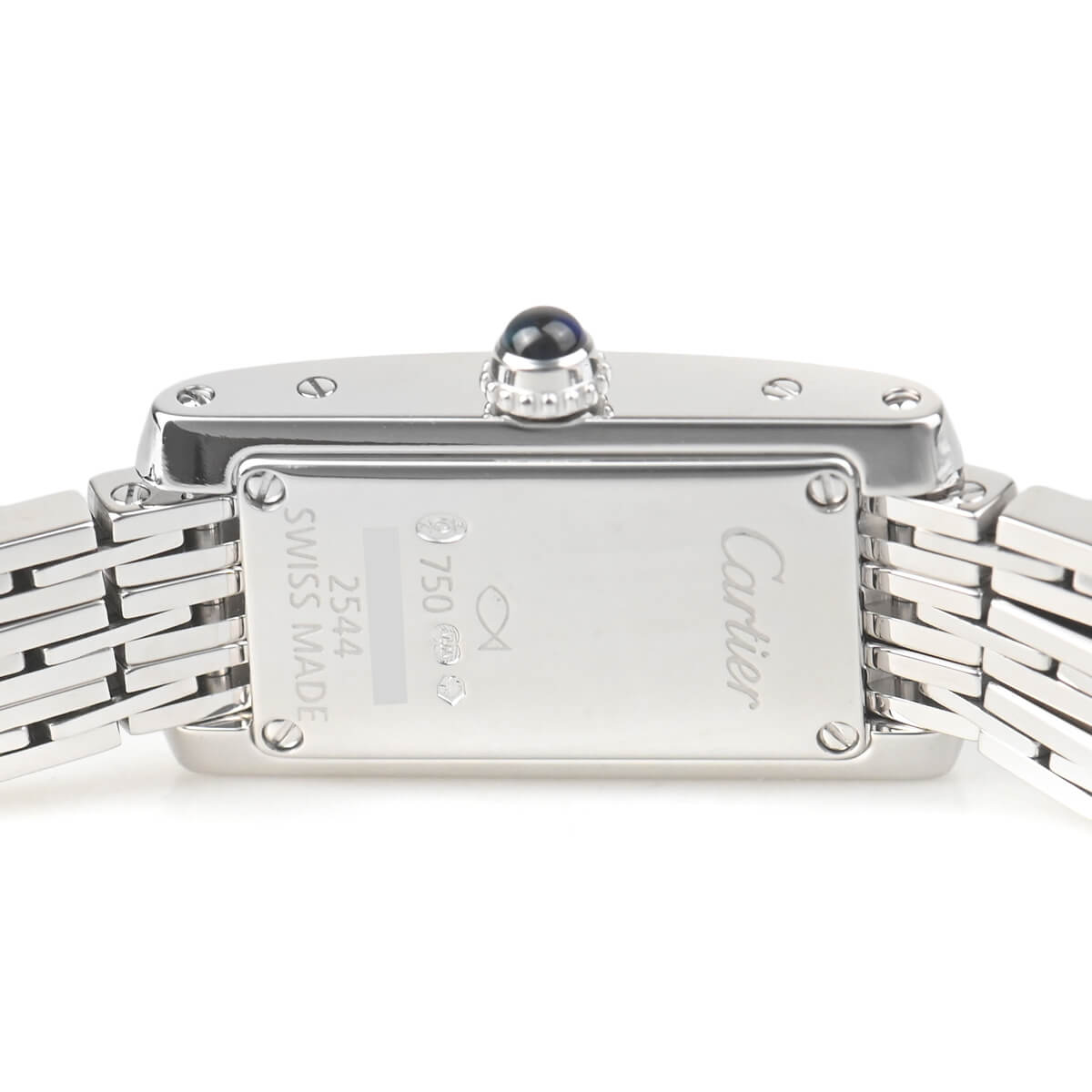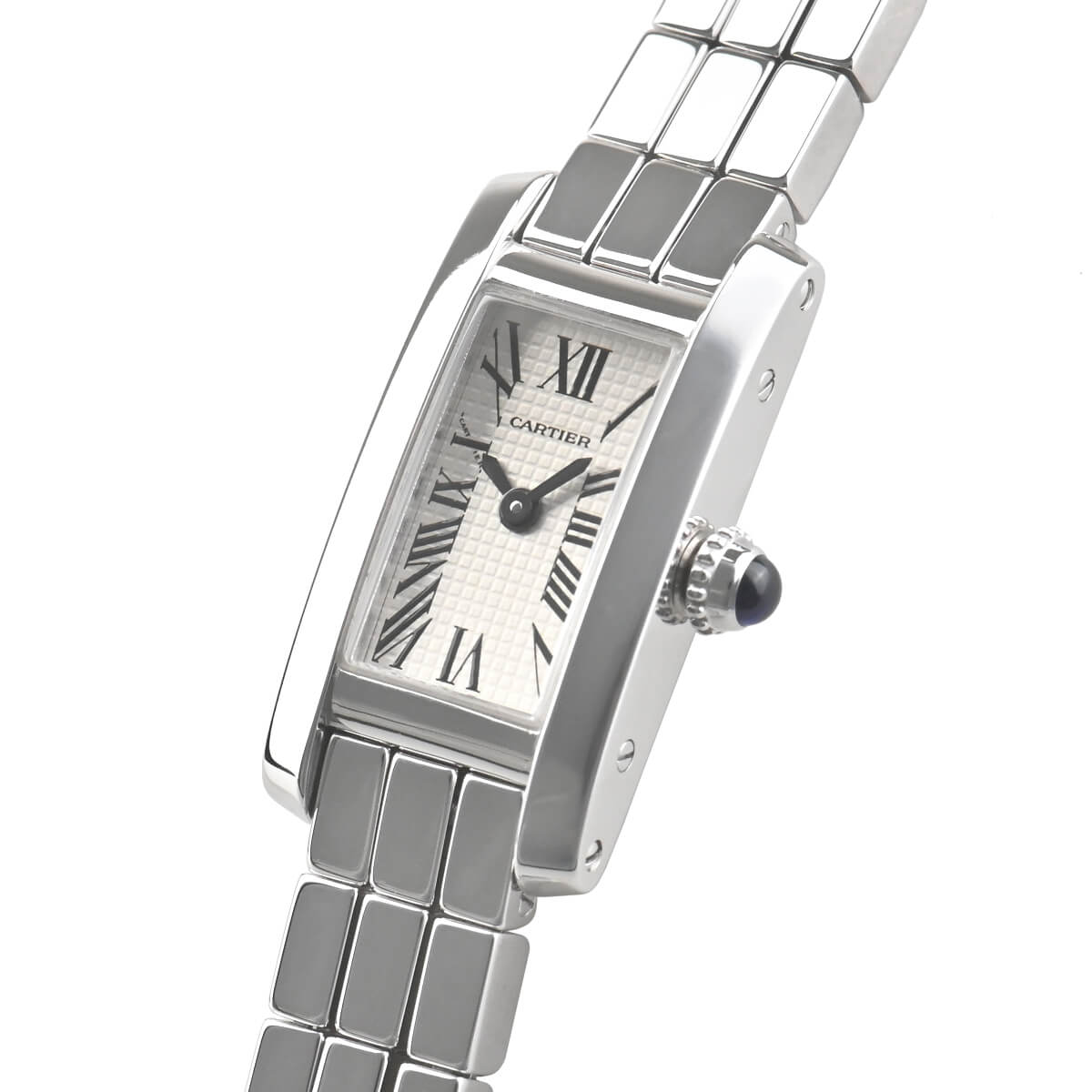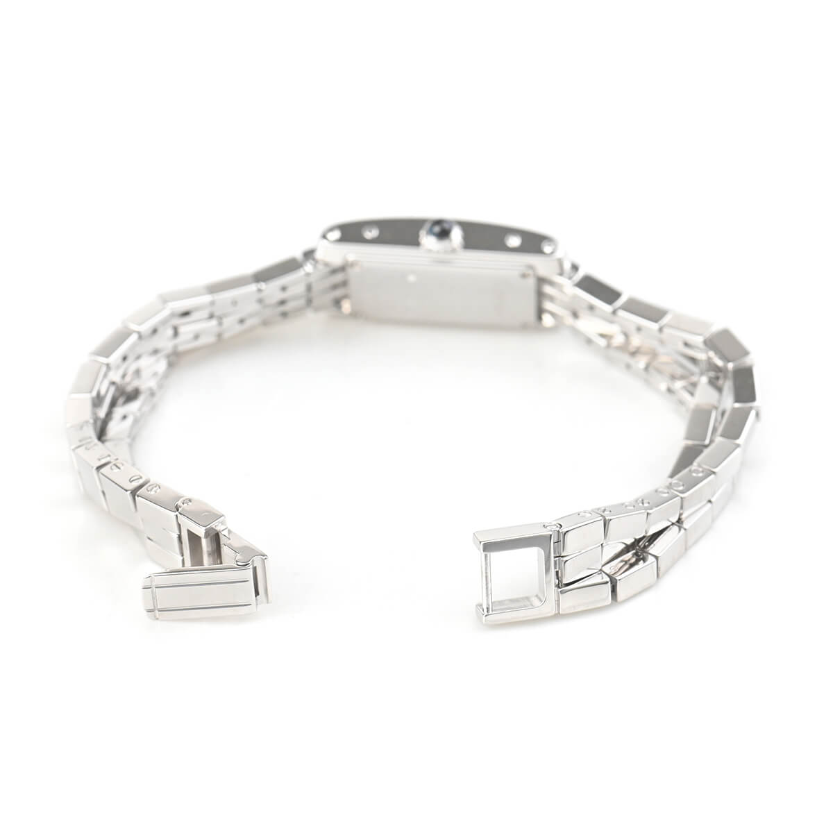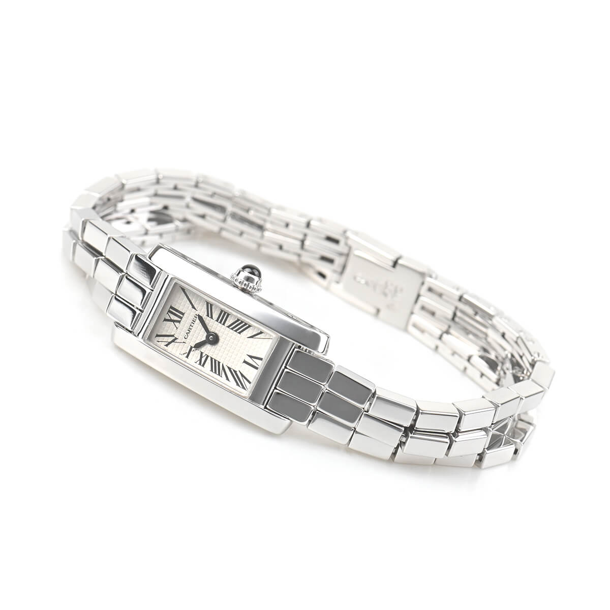 すでに生産終了となっている「タンクアロンジェ ラニエール」。特徴的なホワイトゴールドのリンクをつないだ3連ブレスレットは、しなやかな作りで着け心地の良さを味わうことができます。